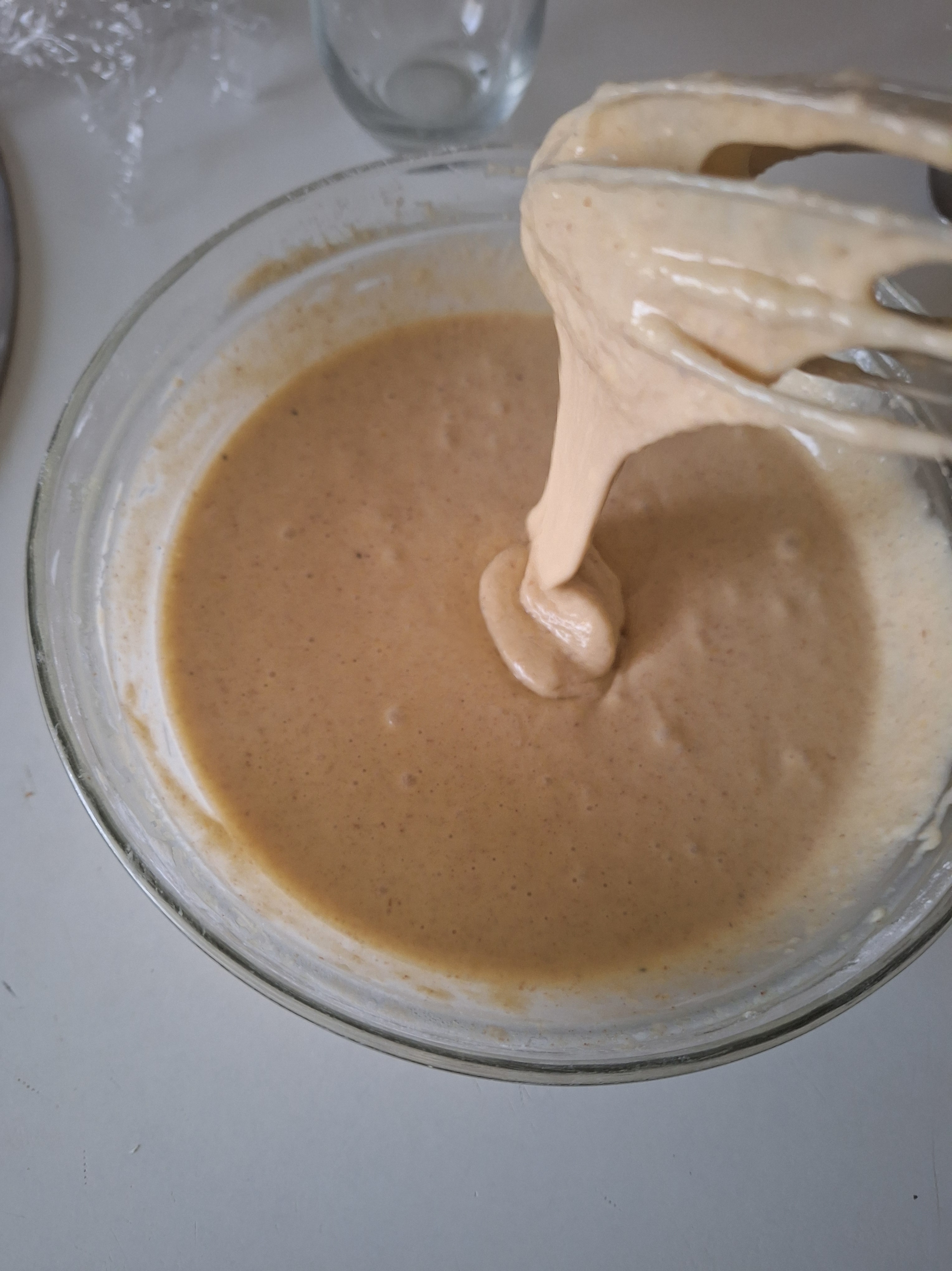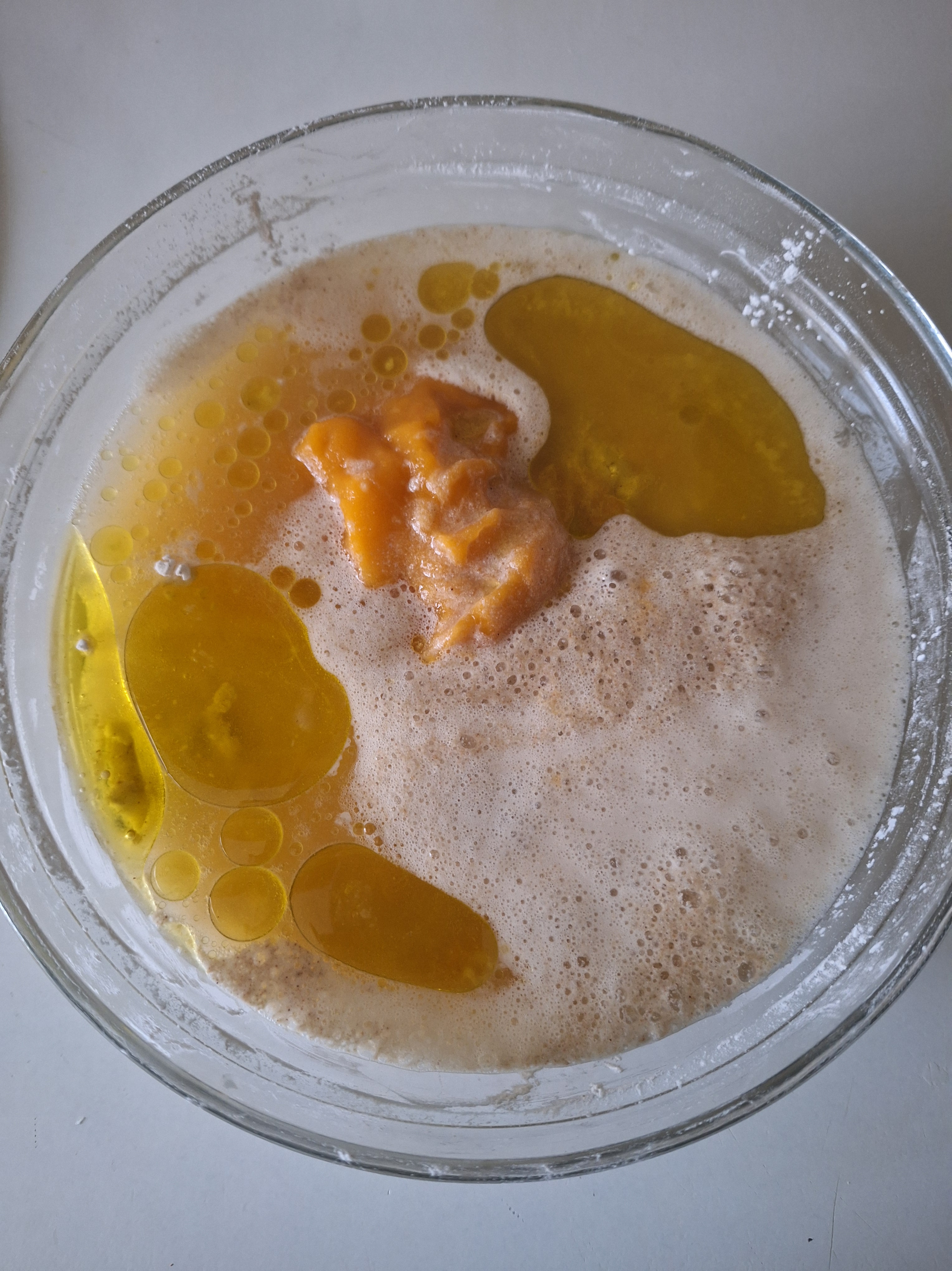 Agrega el puré de calabaza, el aceite y el resto del agua tibia. Mezcla bien todos los ingredientes para que no queden partes secas. Añade la goma xantana y mezcla con una cuchara con cuidado para que no se evapore.