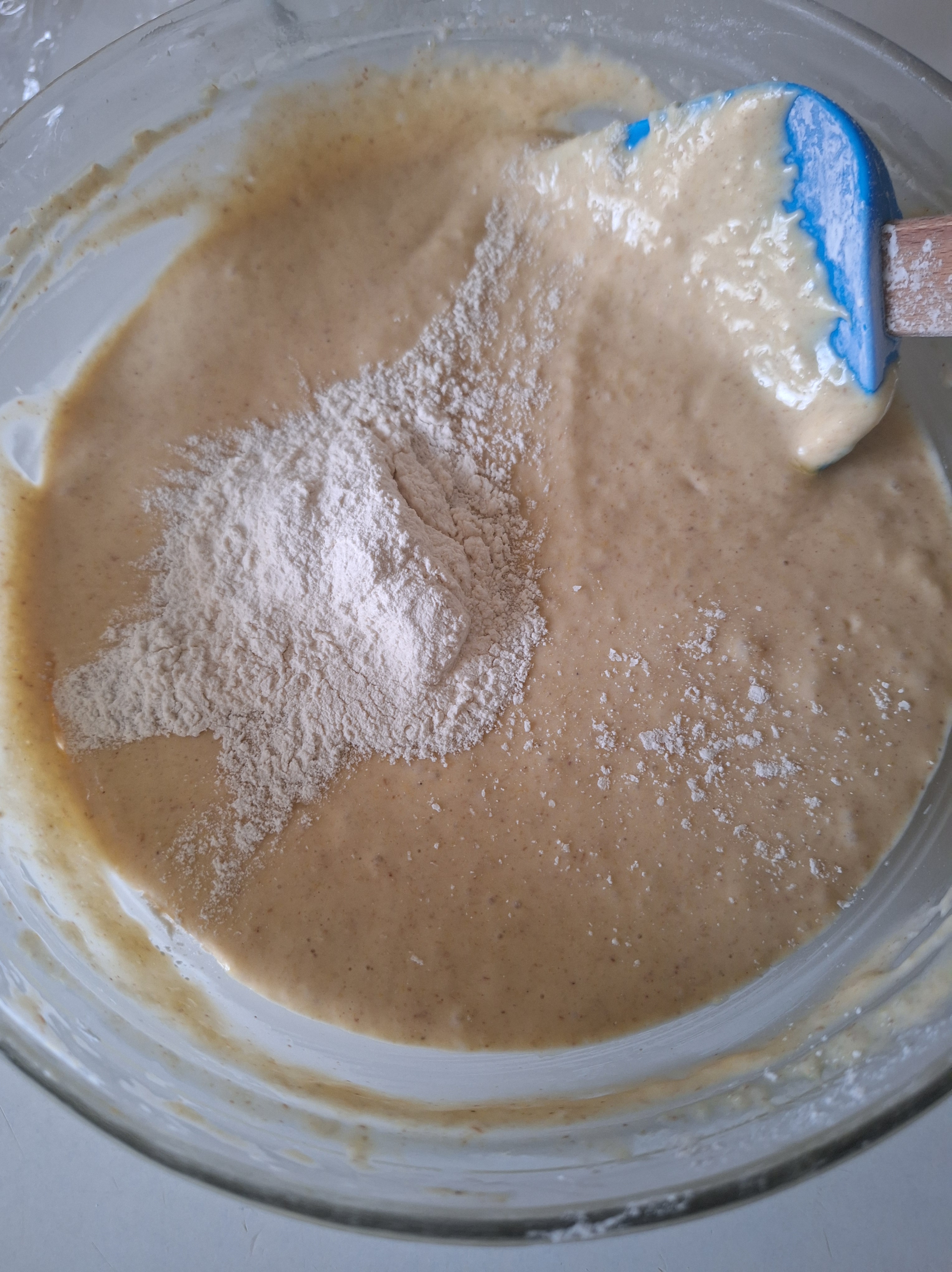 Tamiza los secos: resto de harina de trigo sarraceno, almidón de maíz y patata. Agrega el resto de eritritol, la sal, el psyllium y la levadura Royal. Mezcla todo bien.