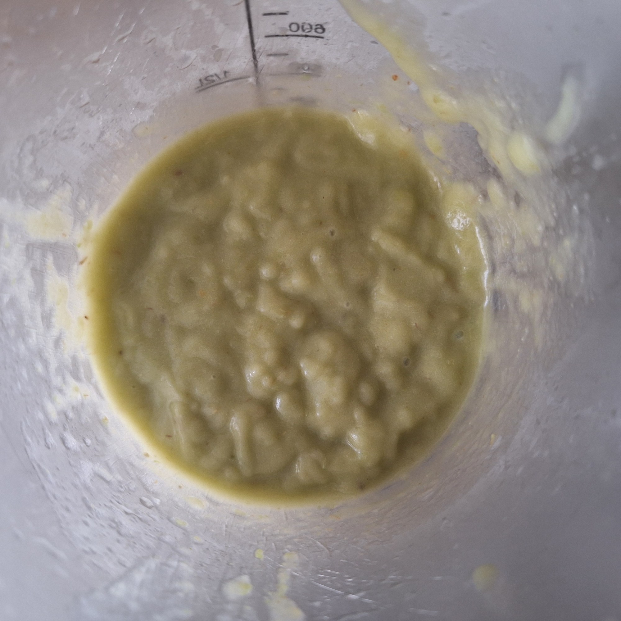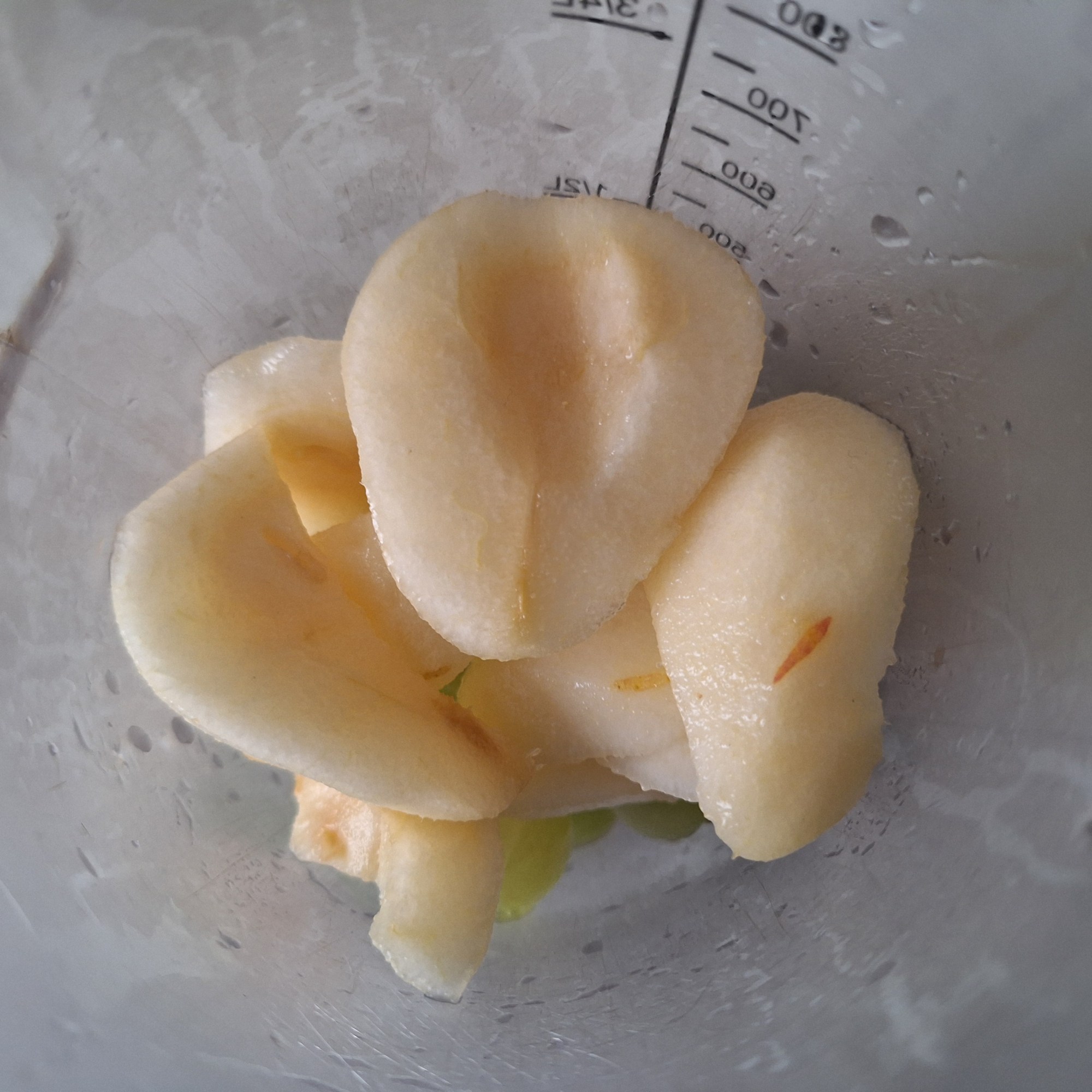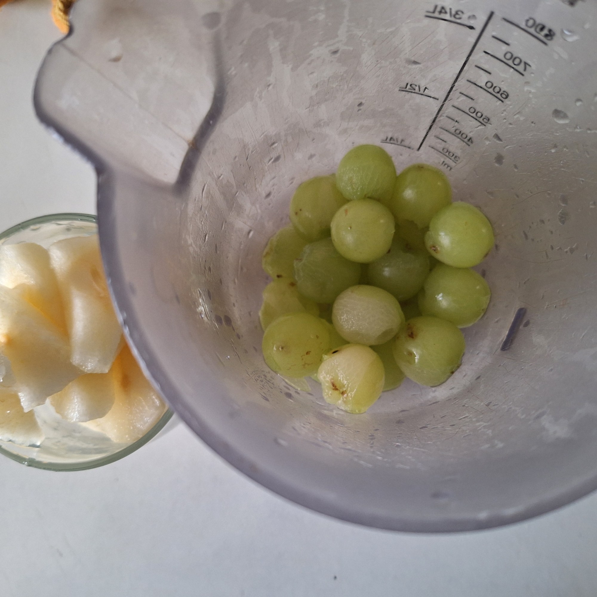 Lava las uvas, pela si lo deseas y retira las semillas. Pela la pera y retira las semillas. Vierte en el vaso de la batidora junto con el aguacate y tritura hasta obtener una crema suave.