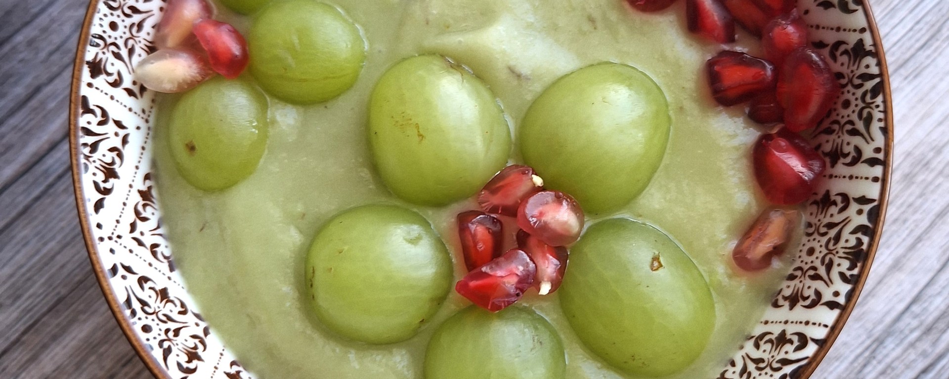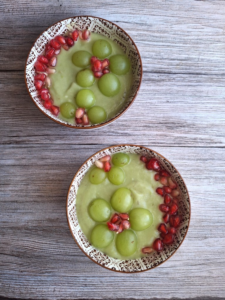 Hoy os traigo un bowl de fruta de temporada. Hacía mucho tiempo que no preparaba uno y es una de mis formas favoritas de consumir fruta (además de en batido o ensaladas). He utilizado uvas y peras, que no me hacen mucha gracia, pero aportar un dulzor natural (no lleva ningún tipo de edulcorante). He combinado con aguacate para dar un toque cremoso y la verdad es que ha quedado delicioso. Para rematar, nada mejor que un poco de granada, tan fresca, colorida y crujiente. El resultado ha sido delicioso para empezar la mañana de domingo.
