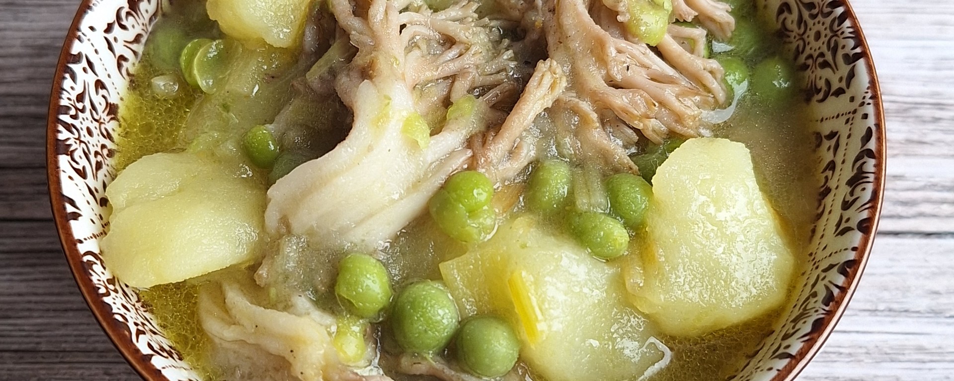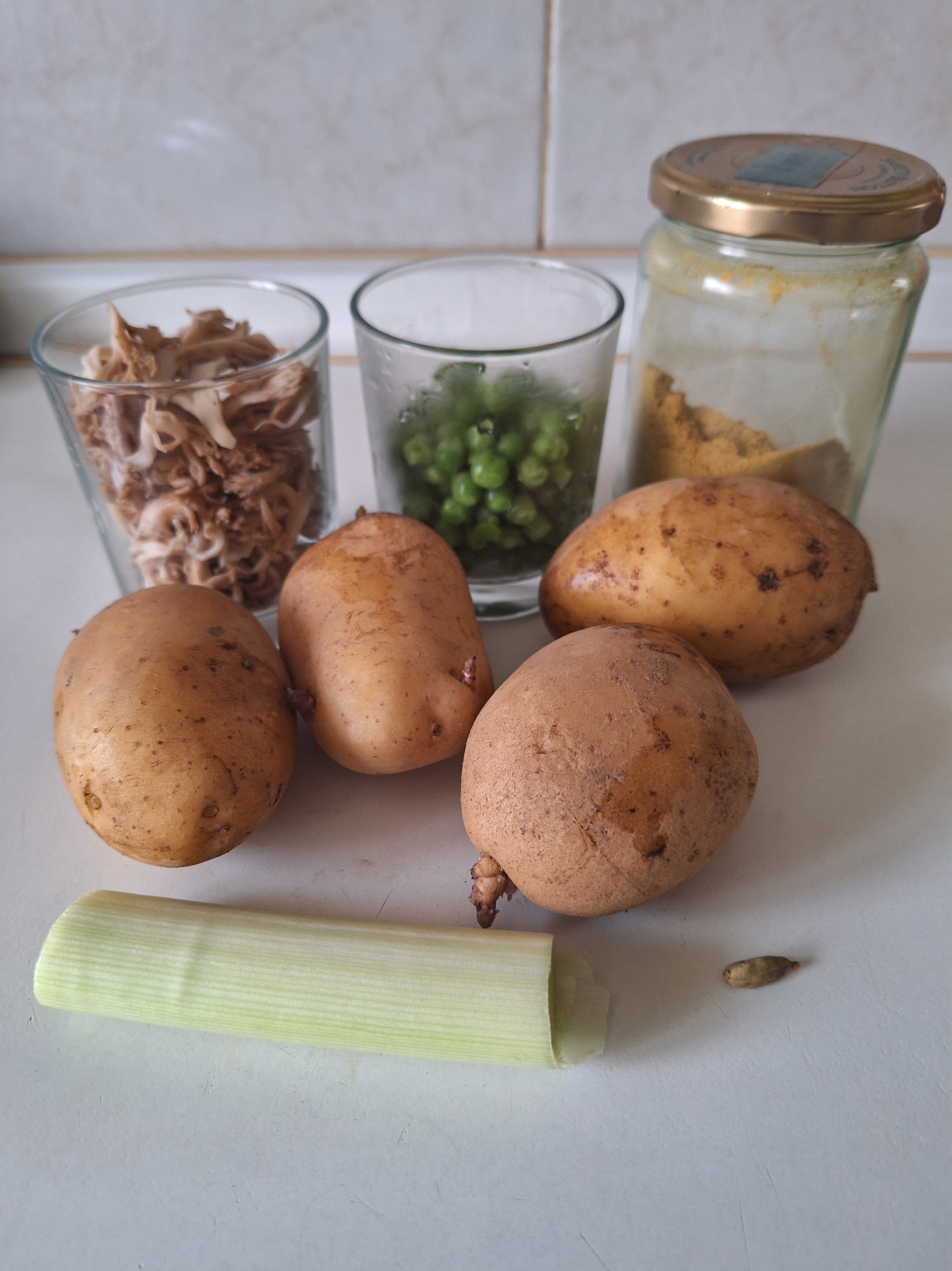 En una cazuela con un poco de aceite pocha el puerro. Cuando empiece a transparentar agrega la ramaria y cocina un par de minutos. Por último, añade las patatas y cocina otros dos minutos. Salpimenta y añade el curry y las semillas de cardamomo. Incorpora el agua y deja cocer hasta que las patatas estén un poco tiernas. Añade los guisantes y cuece unos 20 minutos (si son cocidos añádelos en los últimos 5 minutos). Ajusta el caldo si es necesario y rectifica el punto de sal.