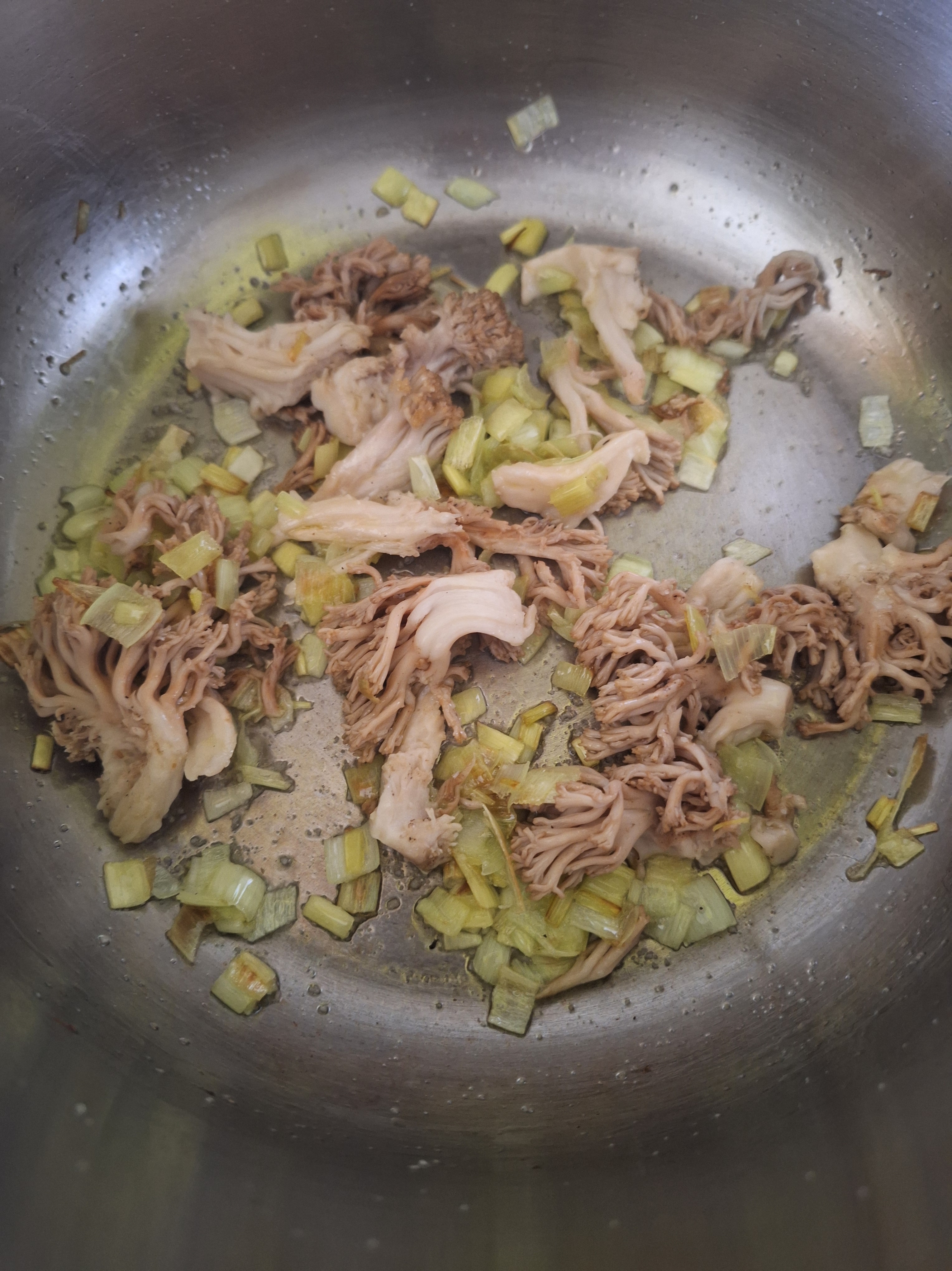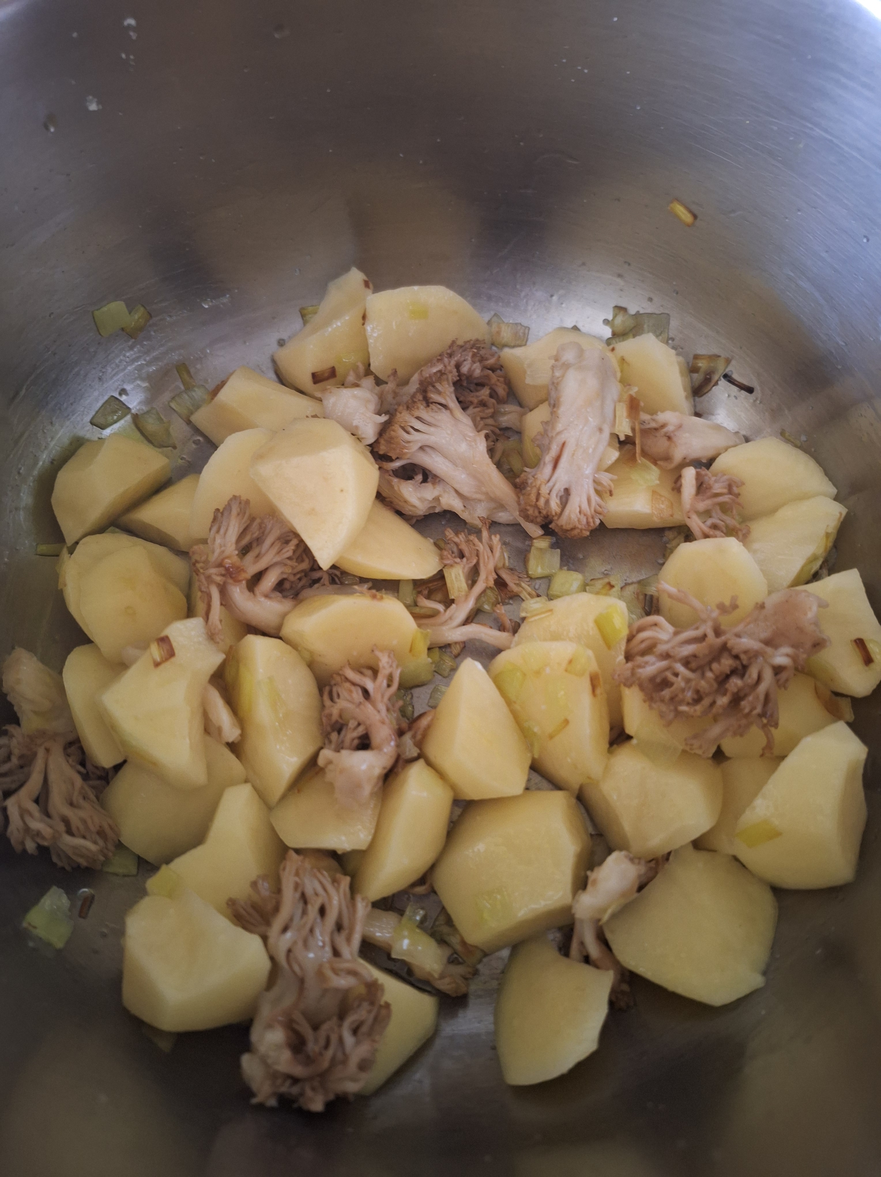 Pela las patatas, lava y corta en cachelos. Limpia el puerro y corta en brunoise. Limpia muy bien la ramaria y trocea. Retira las semillas de cardamomo y reserva.