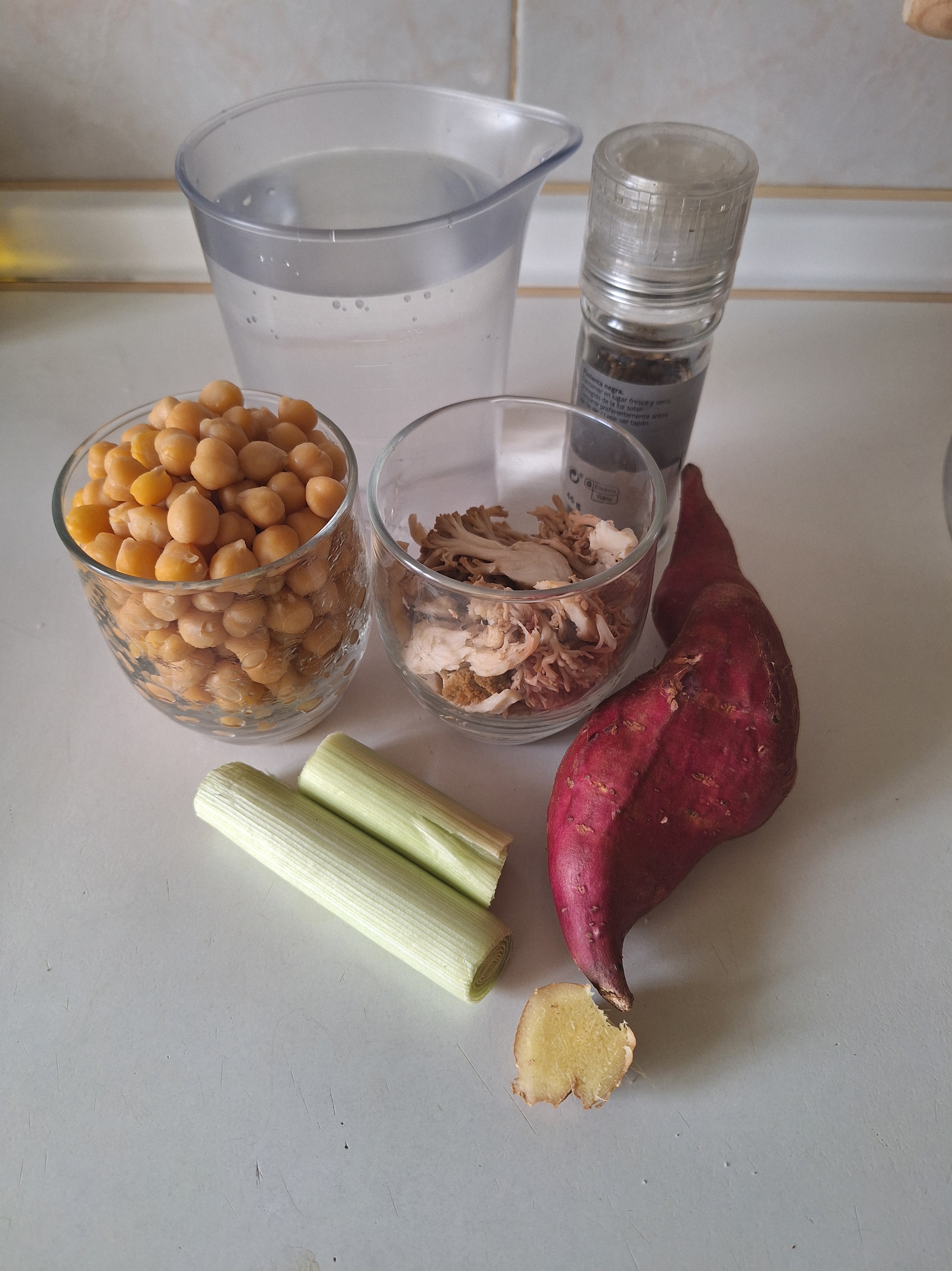 Pocha el puerro en una cazuela con un poco de aceite. Cuando empiece a transparentar agrega la ramaria y el boniato y cocina un par de minutos. Salpimenta, agrega las especias y mezcla bien. Añade el caldo y cuece hasta que el boniato esté tierno. Finalmente incorpora los garbanzos y cuece unos 5 minutos más.