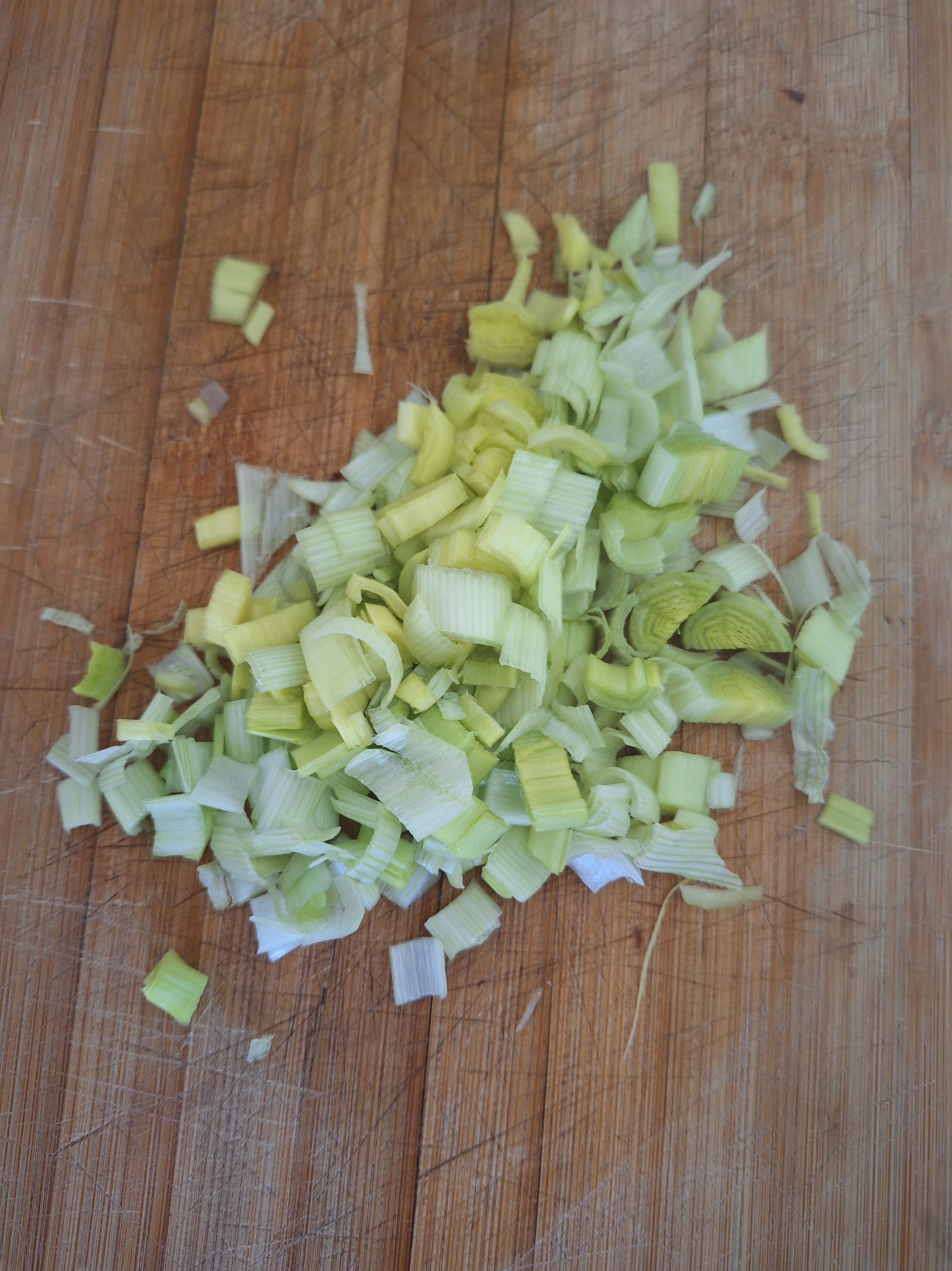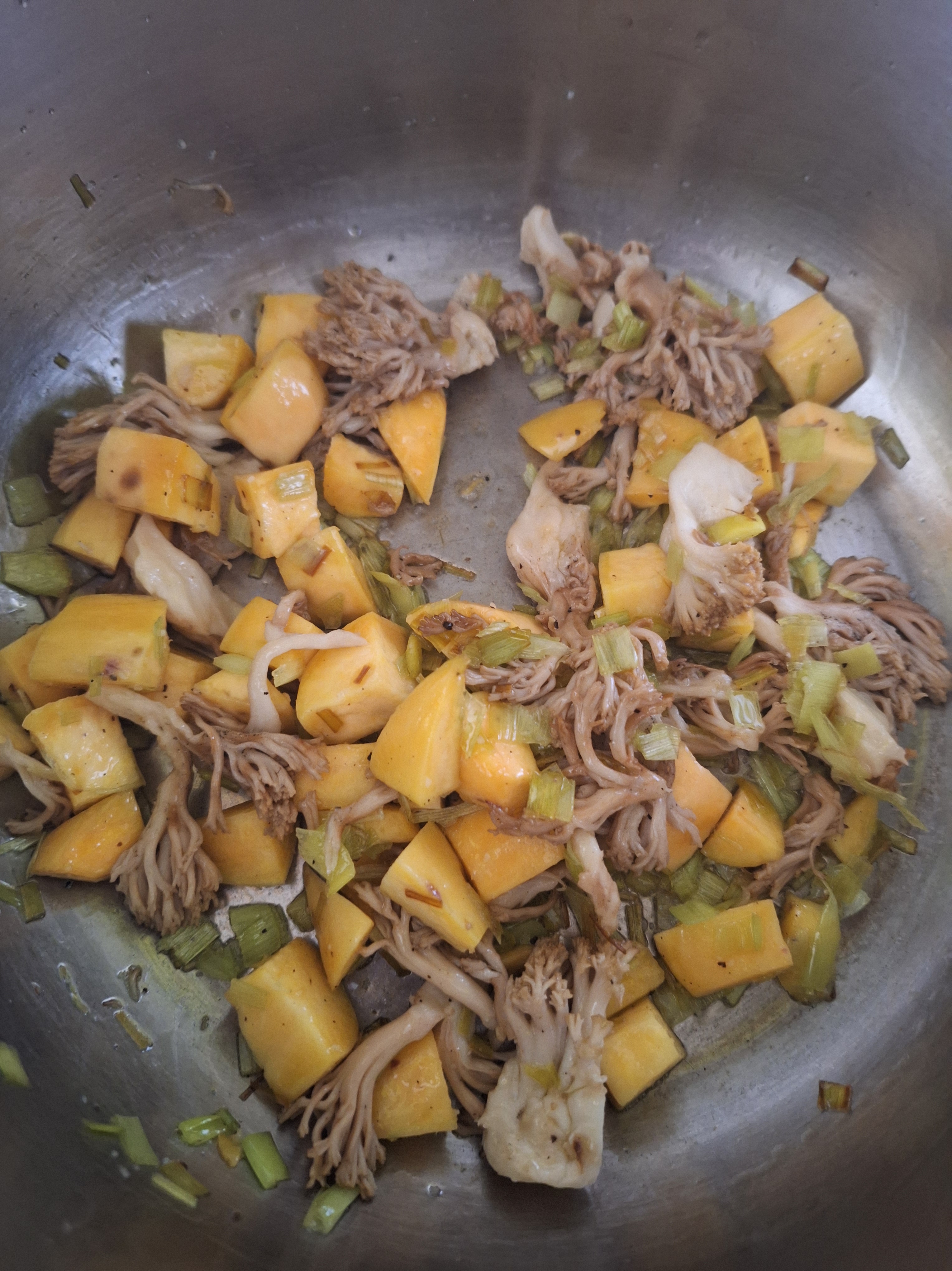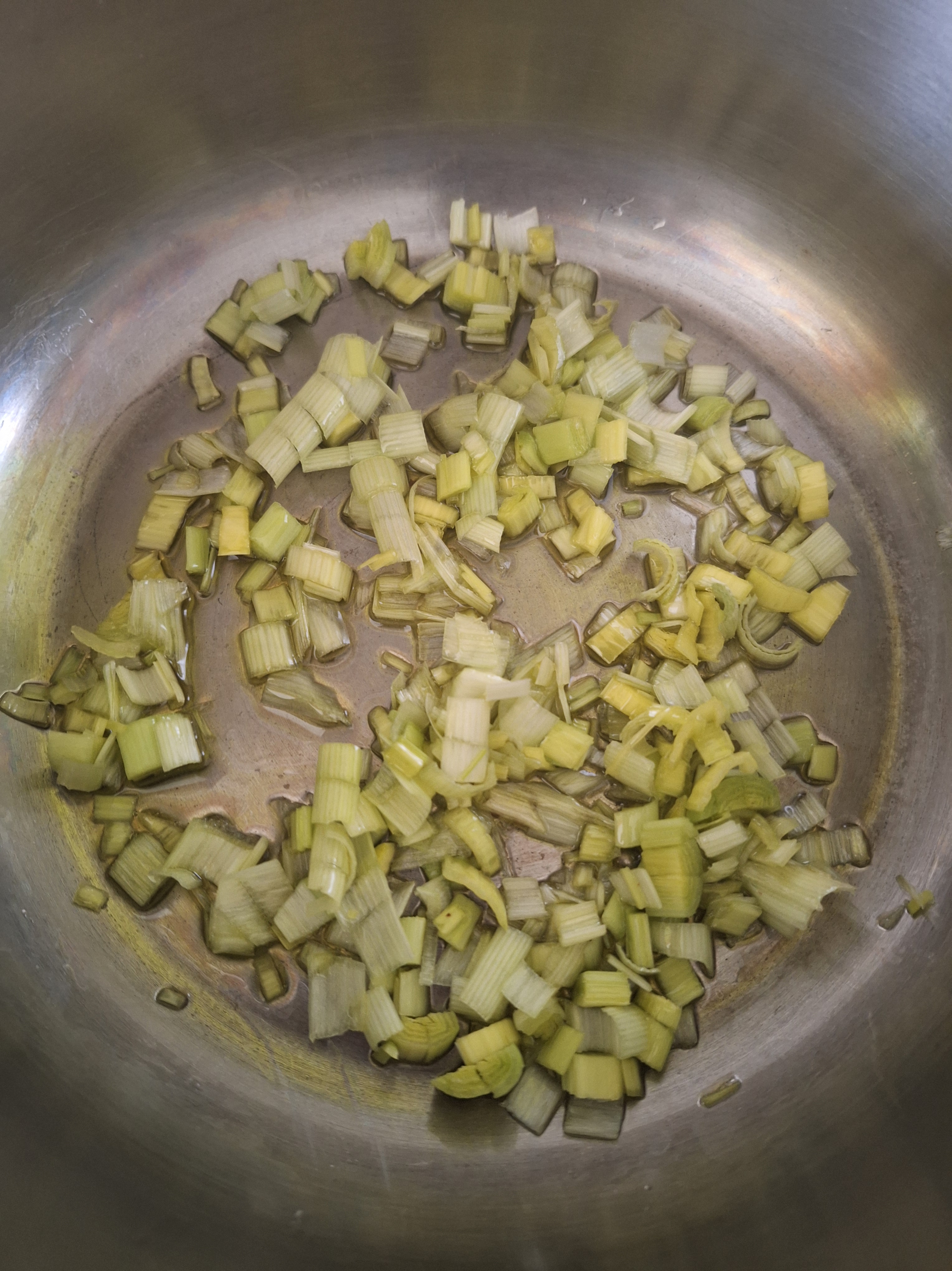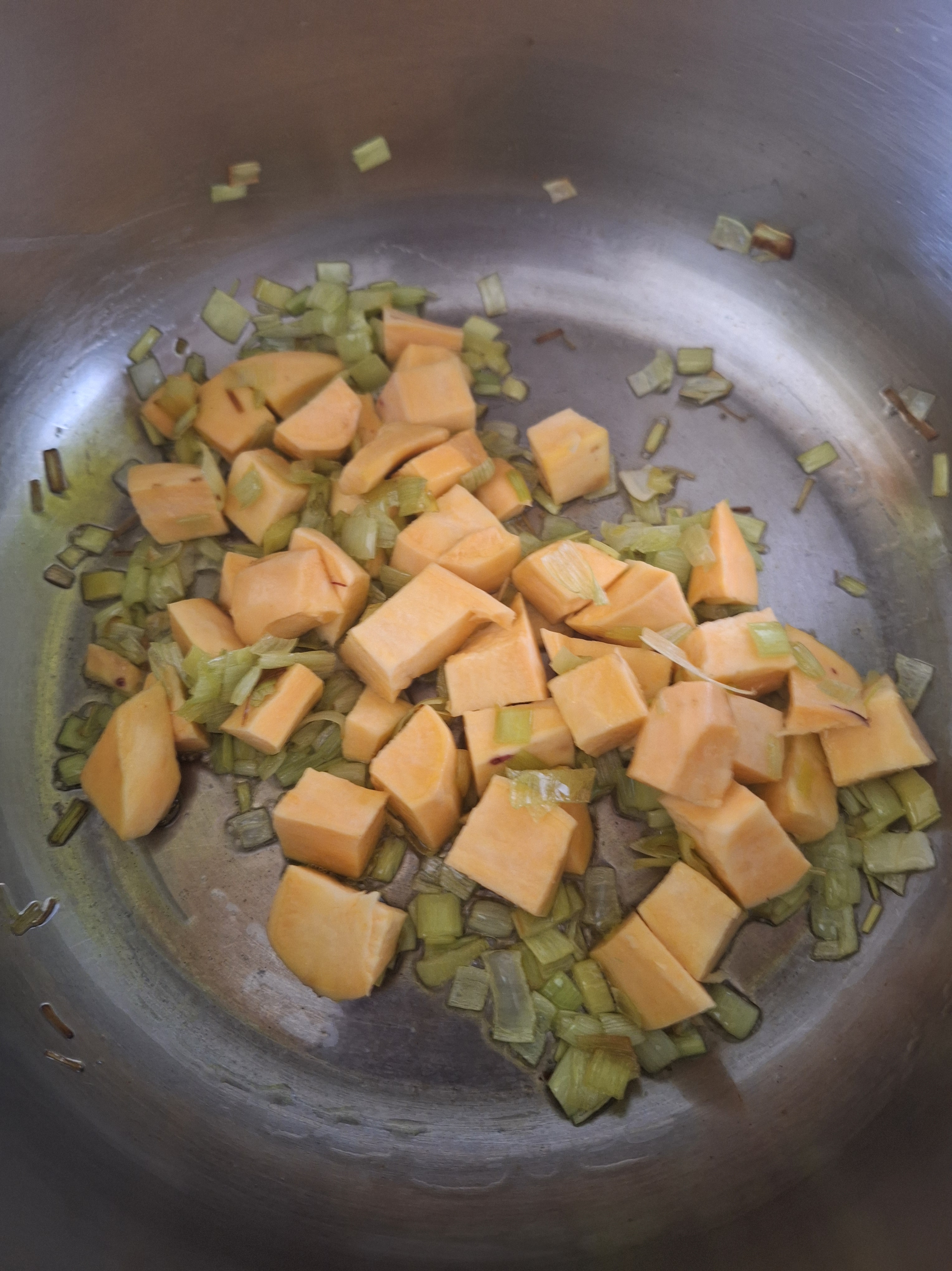 Pela el boniato y corta en cubos. Limpia la ramaria, trocea y reserva. Limpia el puerro y corta en brunoise.
