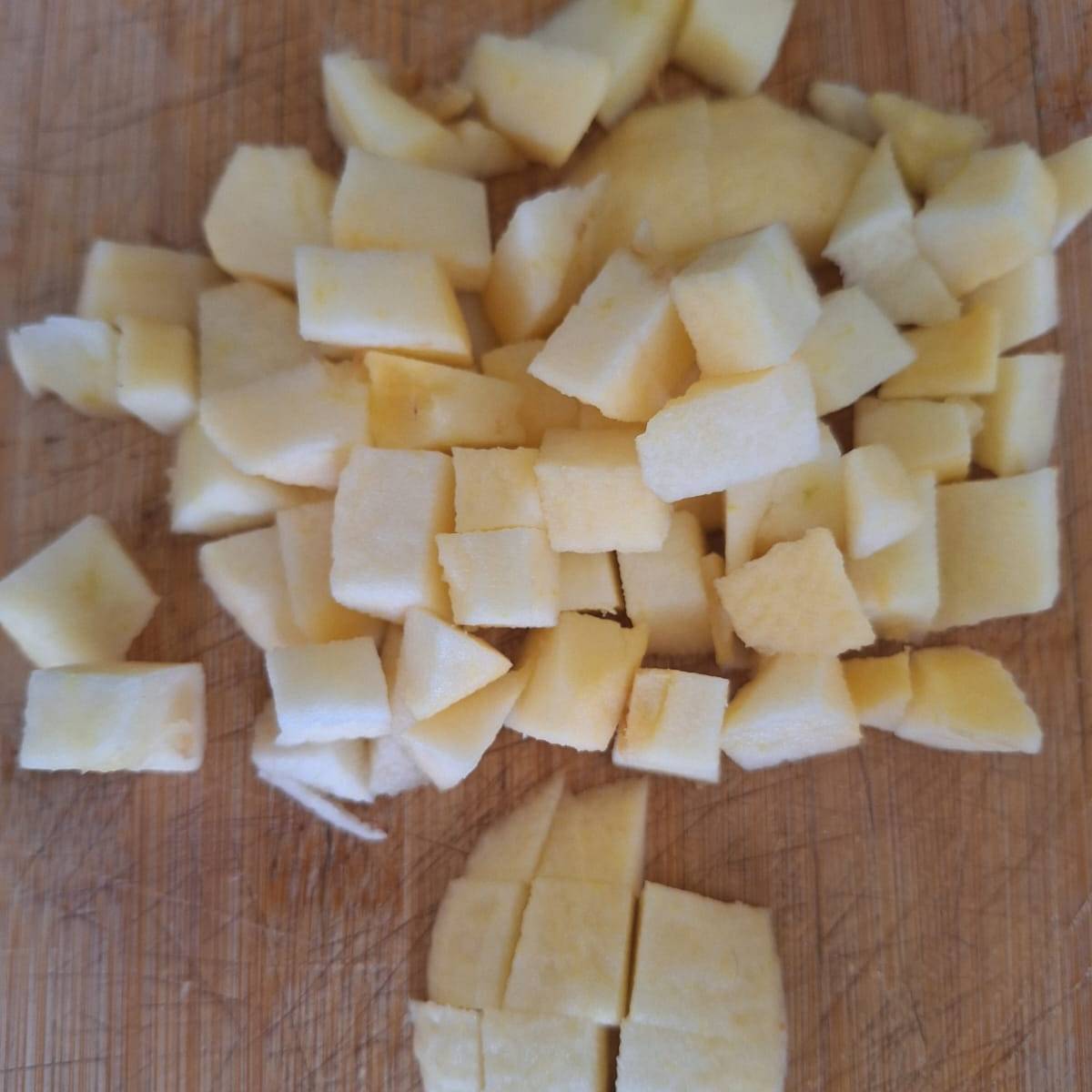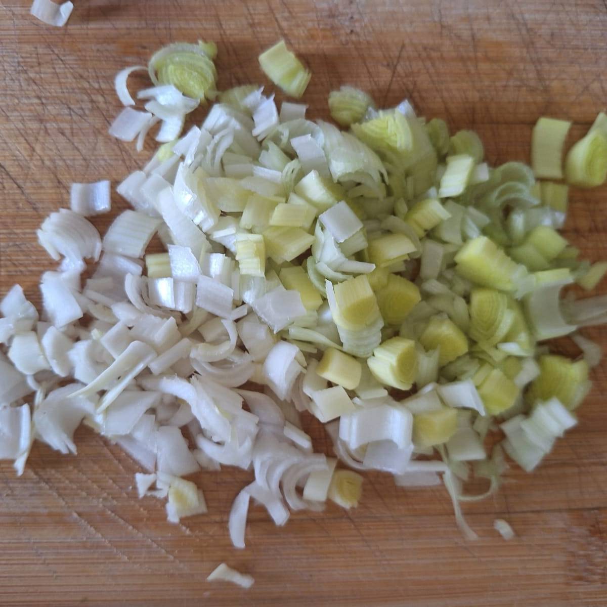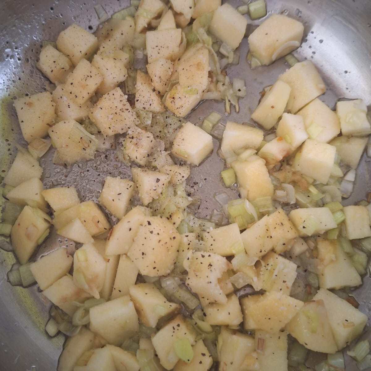 Limpia el puerro, corta en brunoise y pocha en un poco de aceite. Pela la manzana, corta en cubos y agrega a la sartén. Cocina a fuego bajo hasta que esté blandita.