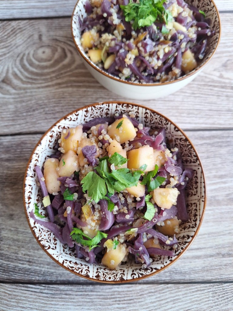 !Buenos días corazones! Con la tontería ya estamos a mitad de semana. Hoy os traigo una receta que, seguramente, tod@s conocéis. Se trata de la famosa lombarda con manzana y piñones pero, en este caso, he hecho una pequeña variación, añadiendo quinoa para aportarle una parte proteica y muy saludable. Como ya sabéis (y si no, os lo cuento), la quinoa es una semilla rica en carbohidratos, aminoácidos y proteína de alta calidad. Además, no contiene gluten, lo que la convierte en un alimento apto para personas con intolerancia.