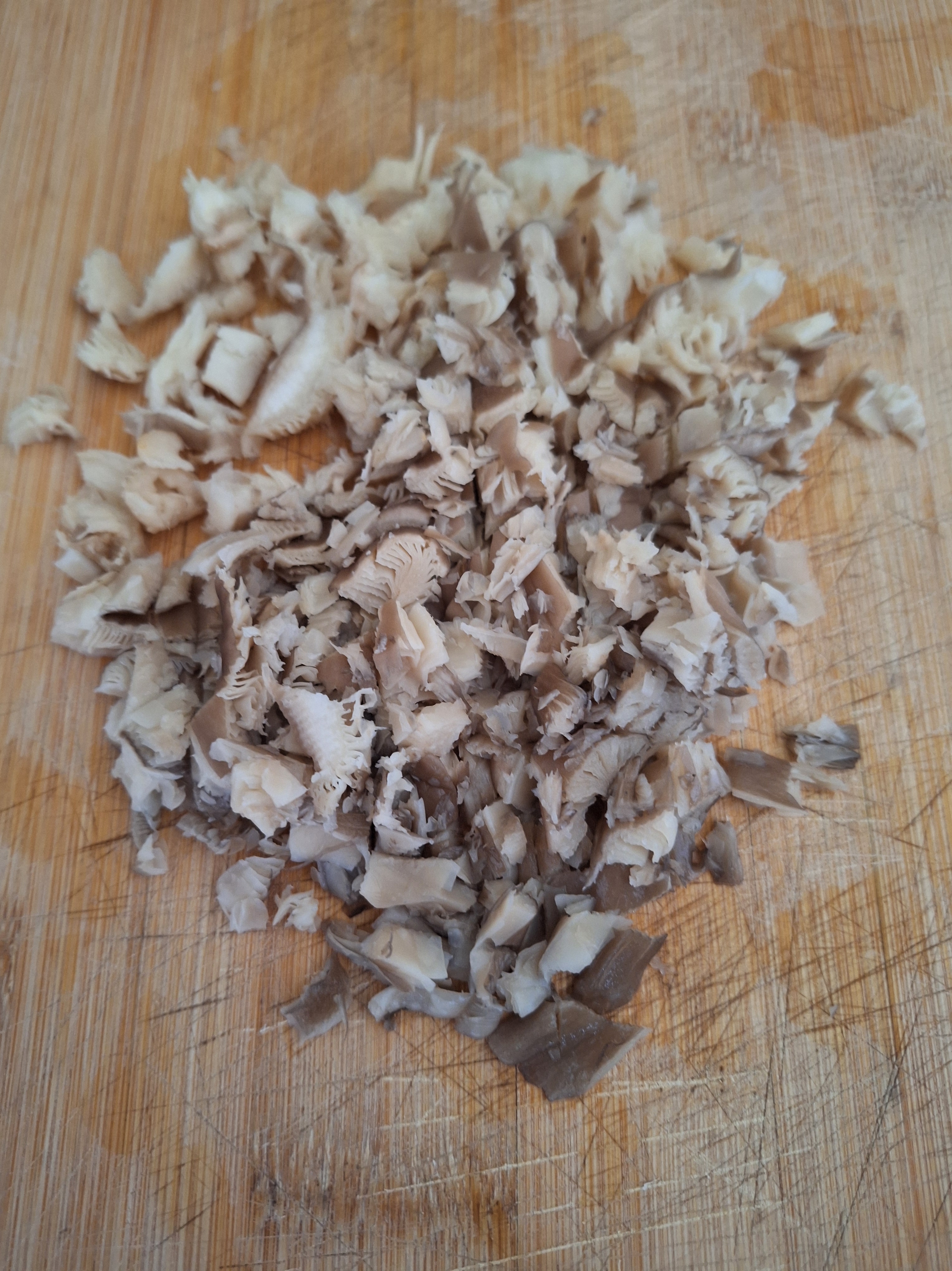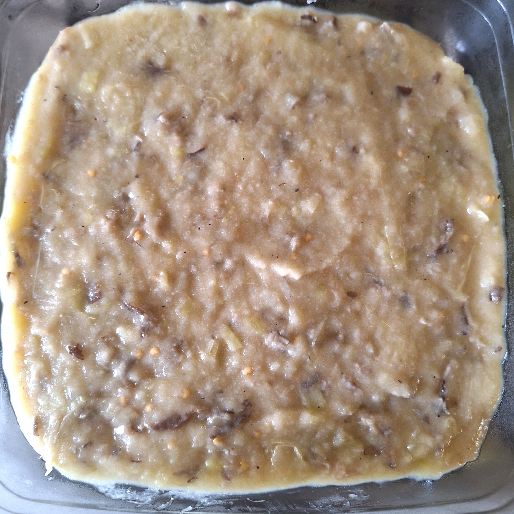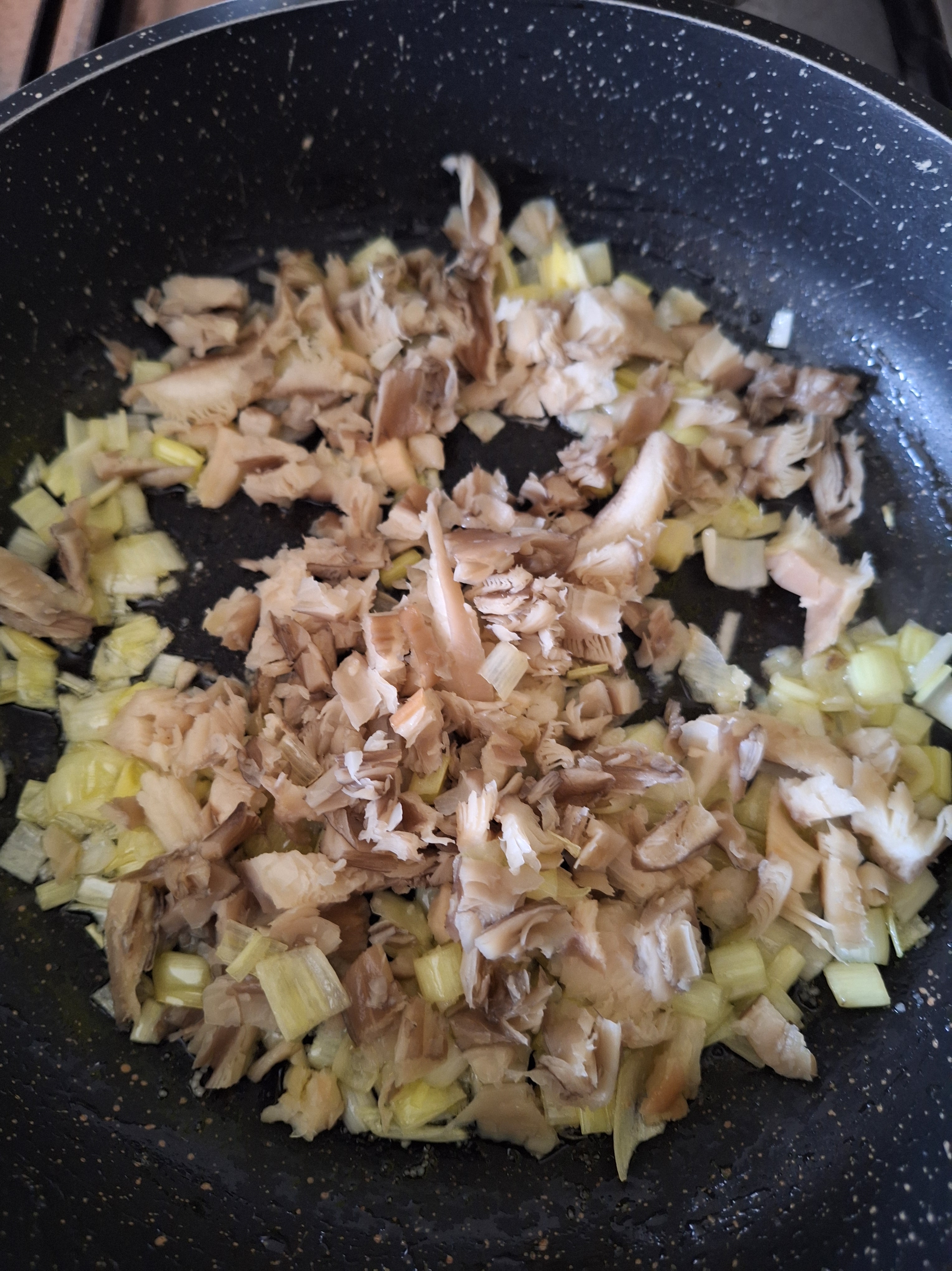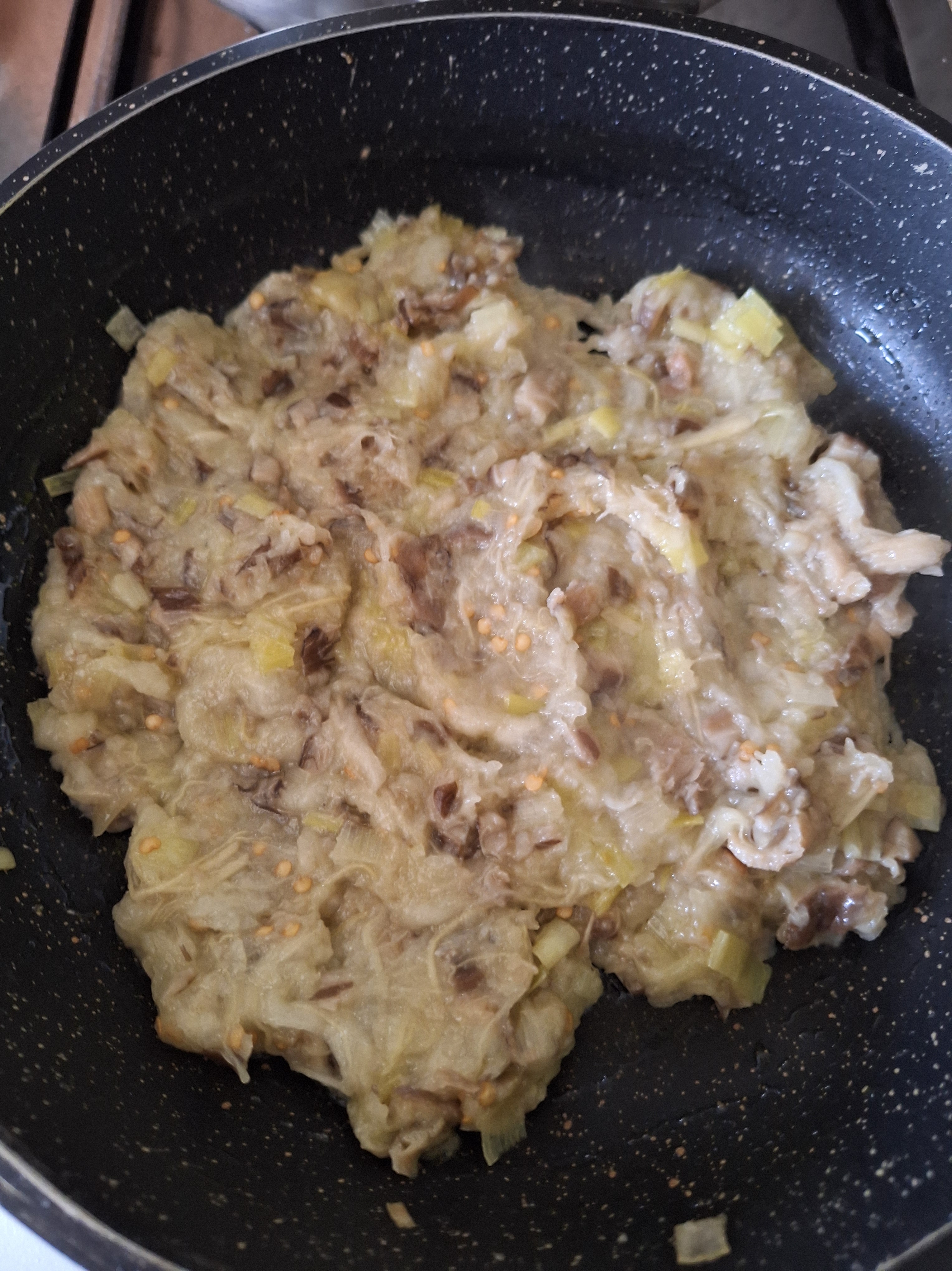 El relleno lleva berenjena (de la blanca, que es más suave), puerro y champiñón. Le habría añadido un poco de queso de cabra, pero ahora mismo no puedo tomar lácteos (así que todo mi gozo en un pozo). Si puedes consumir lácteos, te recomiendo que lo añadas, porque la combinación de sabores es brutal.