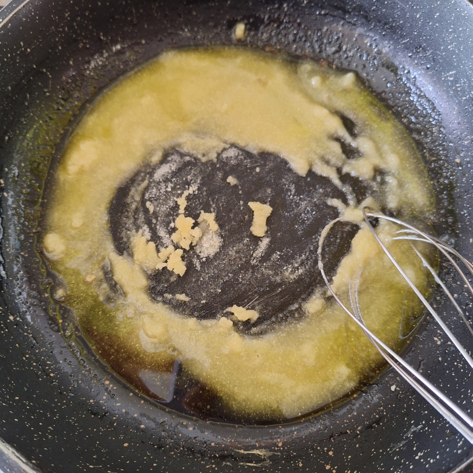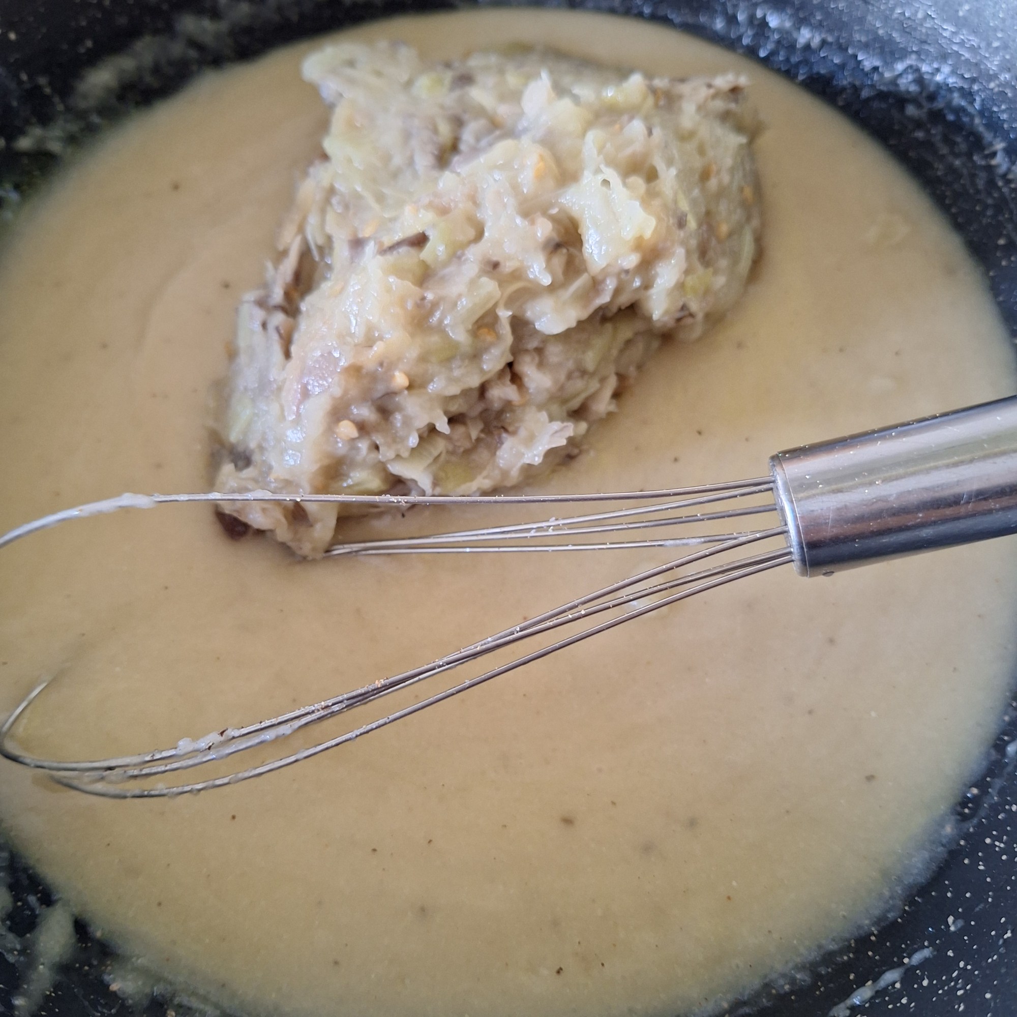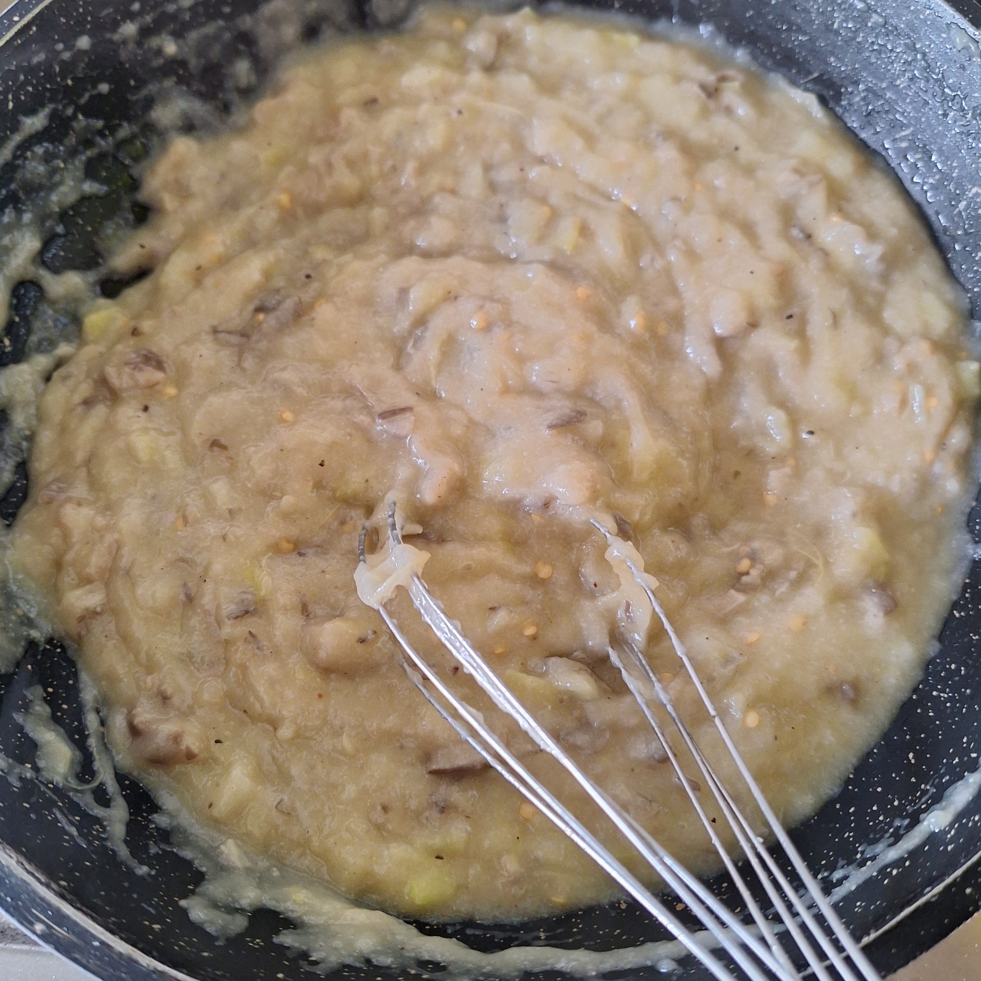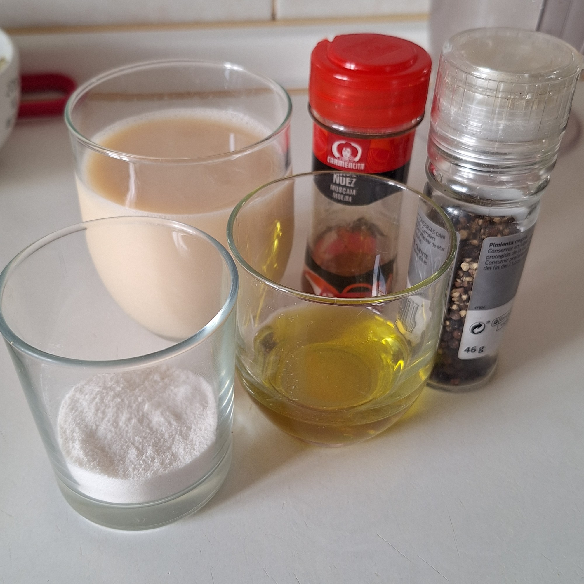 En otra sartén calienta el aceite de oliva y agrega la harina de arroz y la maicena. Mezcla bien, a fuego bajo, hasta que se dore un poco. Agrega la bebida de arroz y sigue cocinando, removiendo constantemente, hasta que espese. Sazona, añade las especias y mezcla bien.