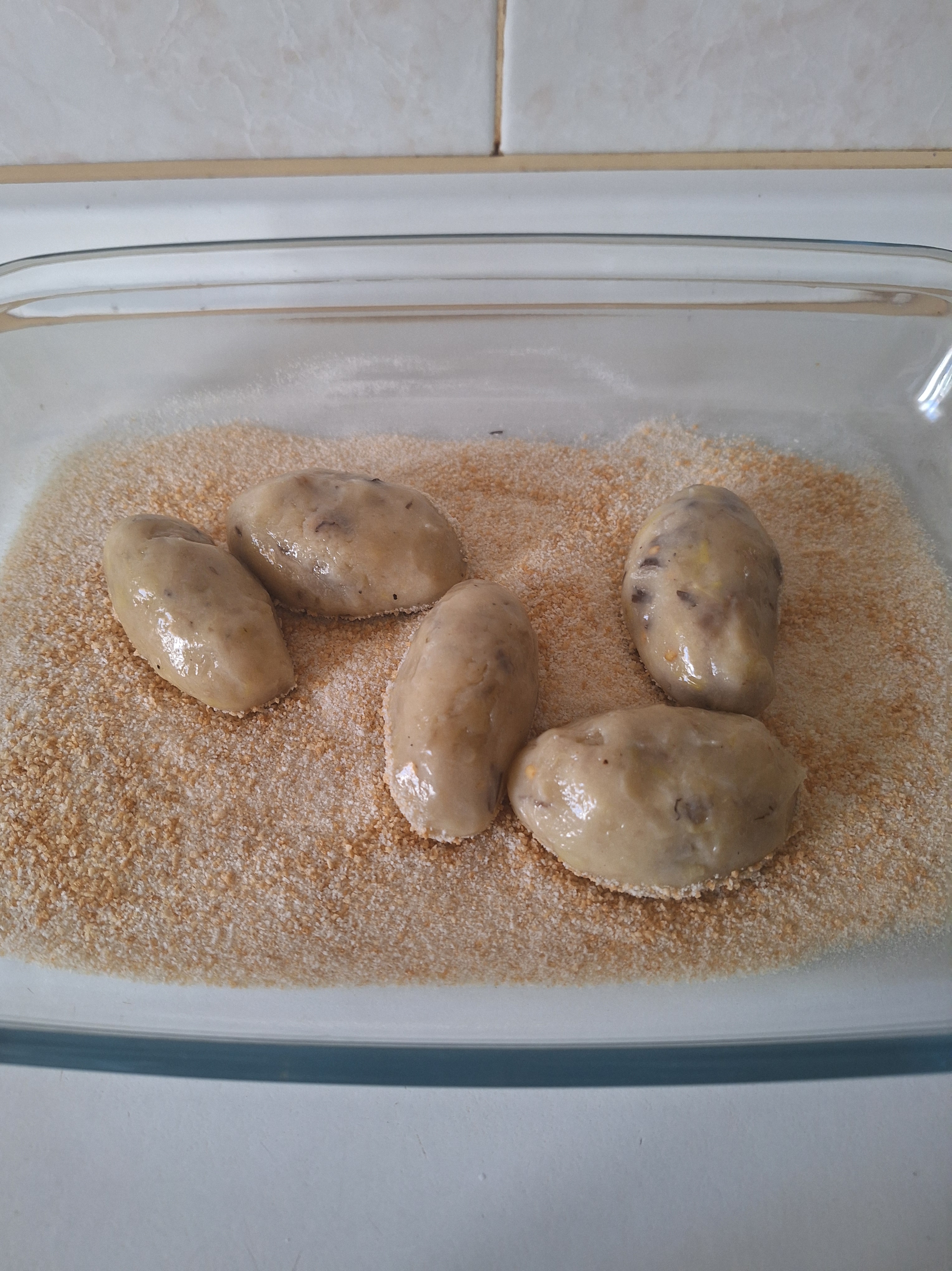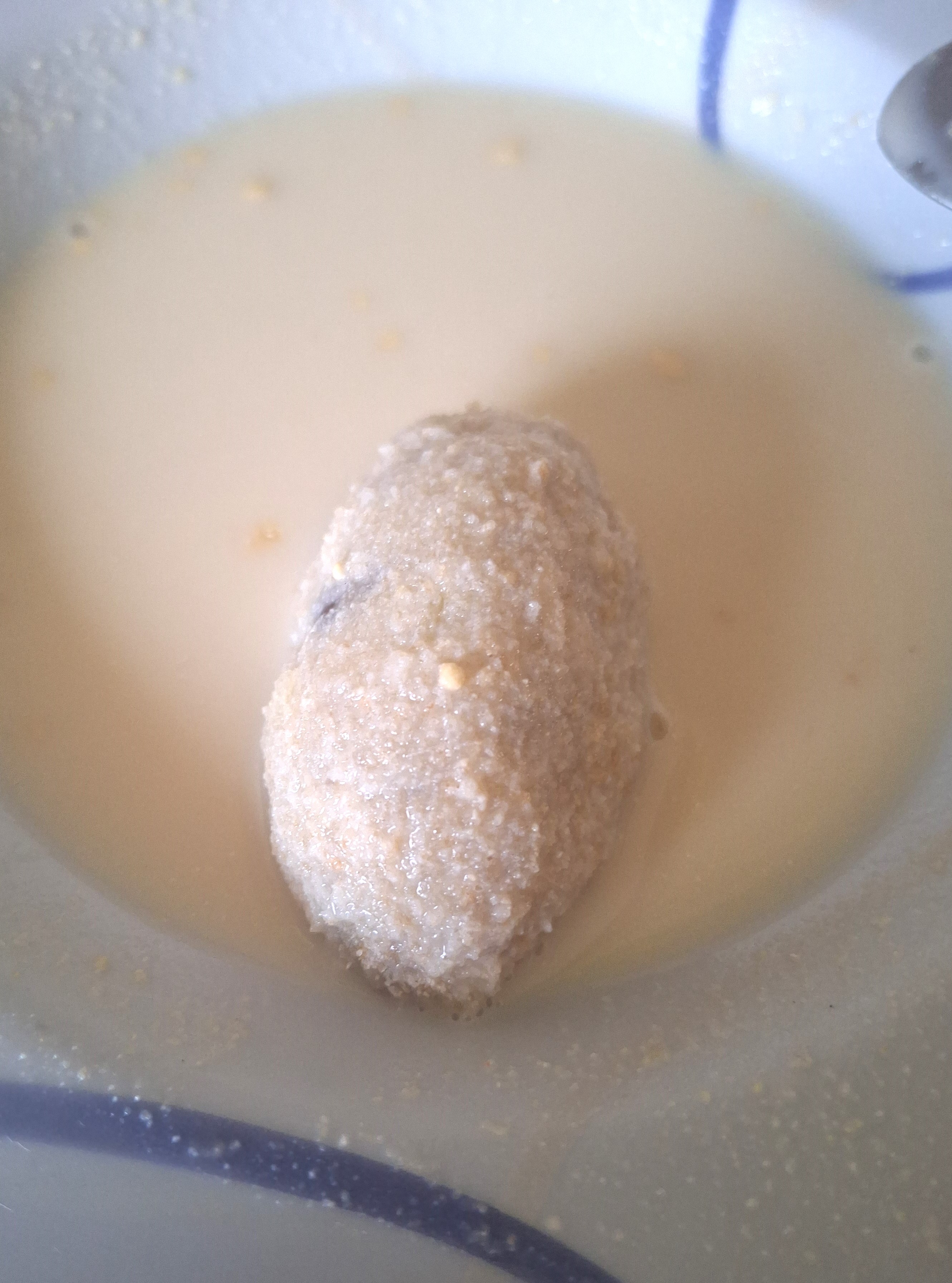 Como sustituto de huevo he utilizado una mezcla de harina de garbanzos y agua. No vais a notar el sabor pero, si os parece muy fuerte, podéis añadir un chorrito de vinagre. Os aconsejo que la mezcla sea un poco espesa y que la dejéis reposar para que se hidrate. Para rebozar, pan rallado sin gluten.