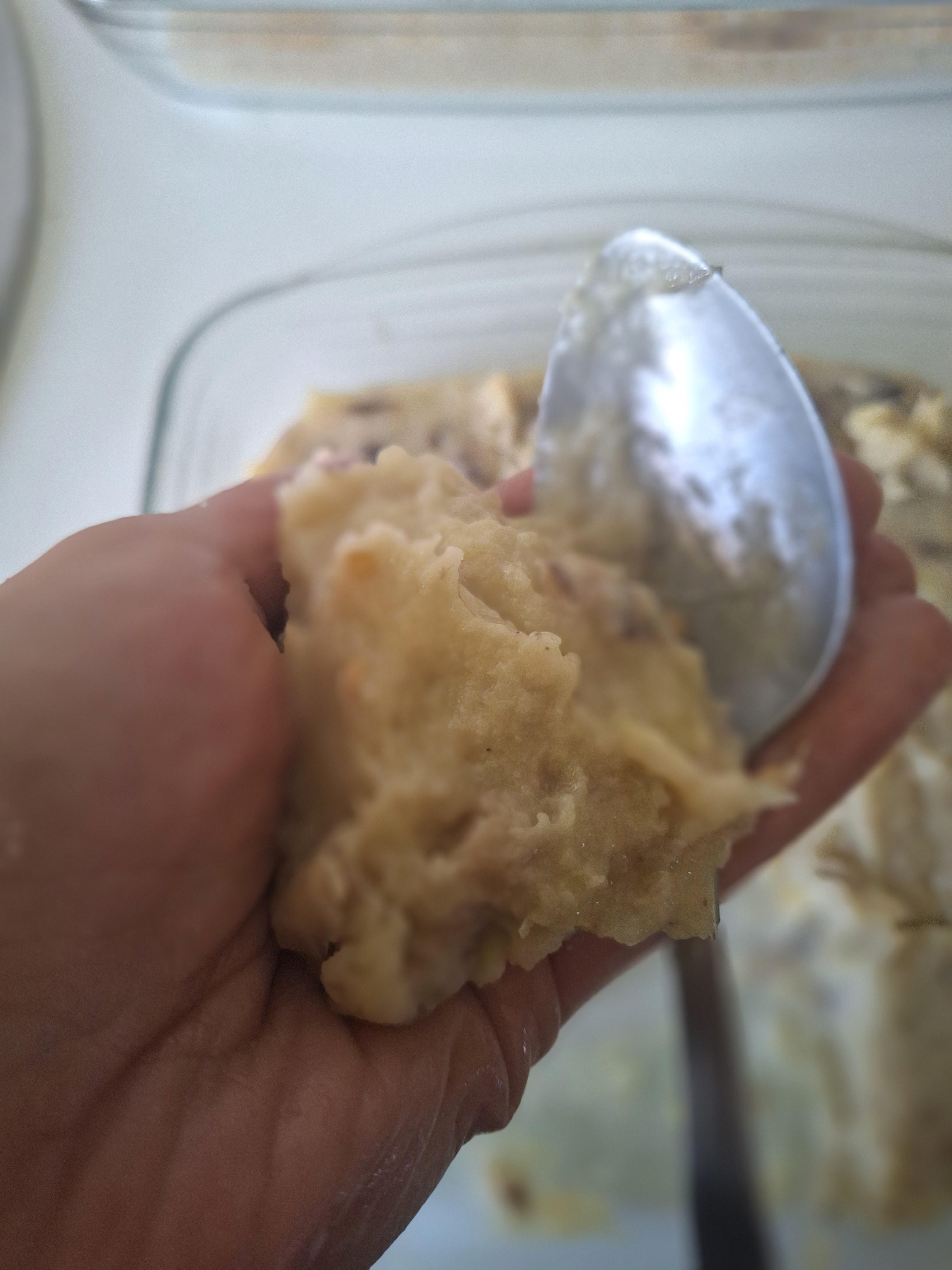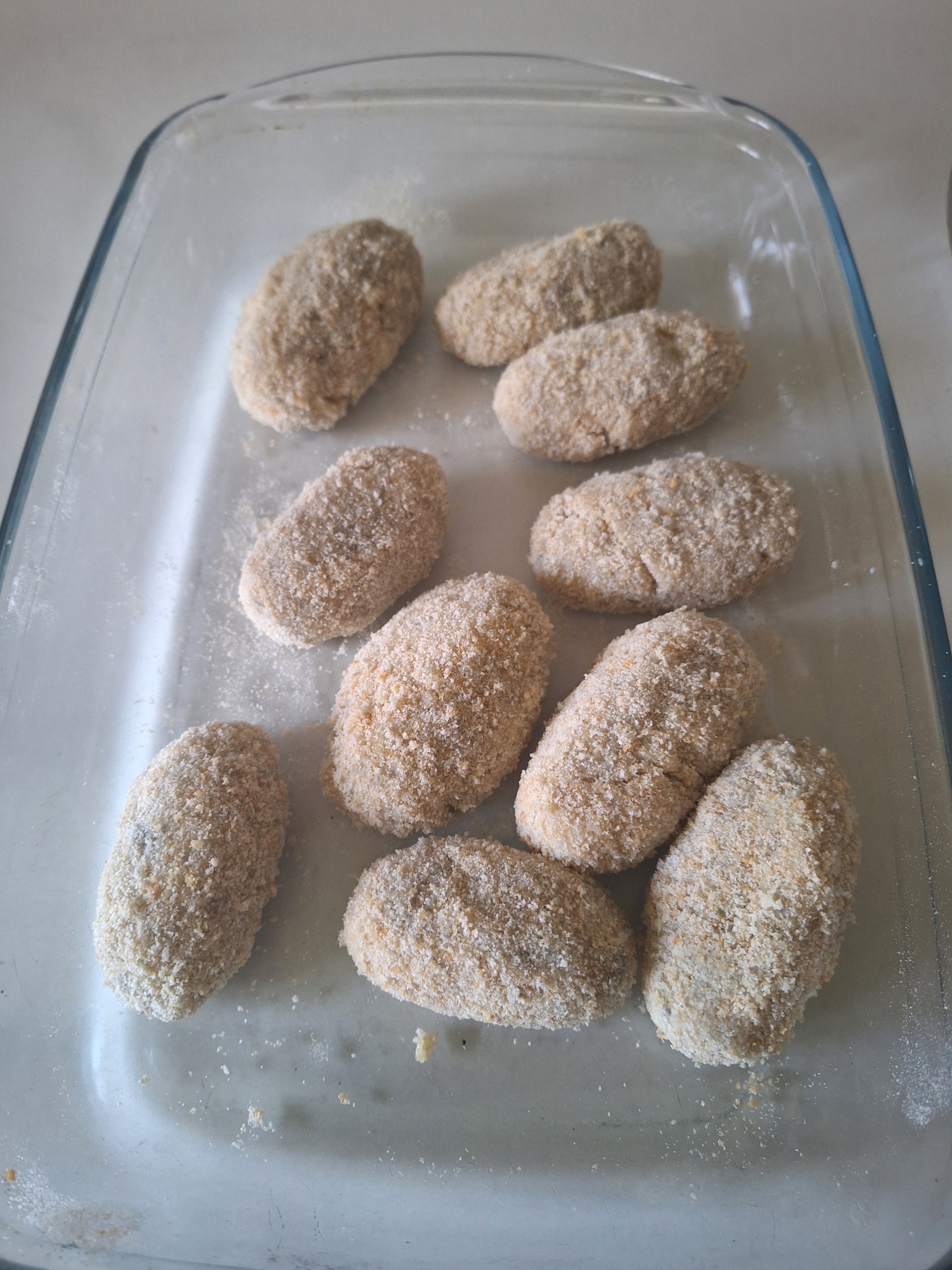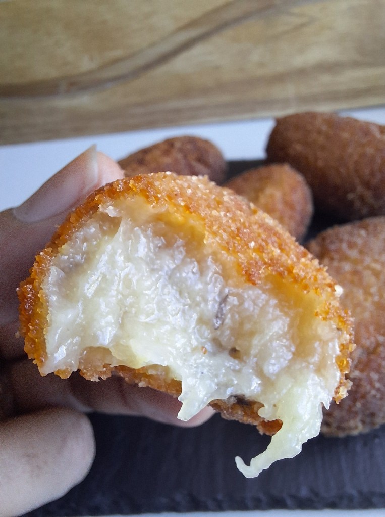 Al igual que ocurre con las croquetas con gluten, es muy importante dejar reposar la masa durante toda la noche para que las harinas se hidraten y la masa se compacte. Si te cuesta manejarla sólo tienes que engrasar un poco las manos. Te recomiendo hacer un rebozado doble: pan rallado – harina de garbanzos- pan rallado, para conseguir una capa externa súper crujiente y un interior cremoso (mira al final del post).