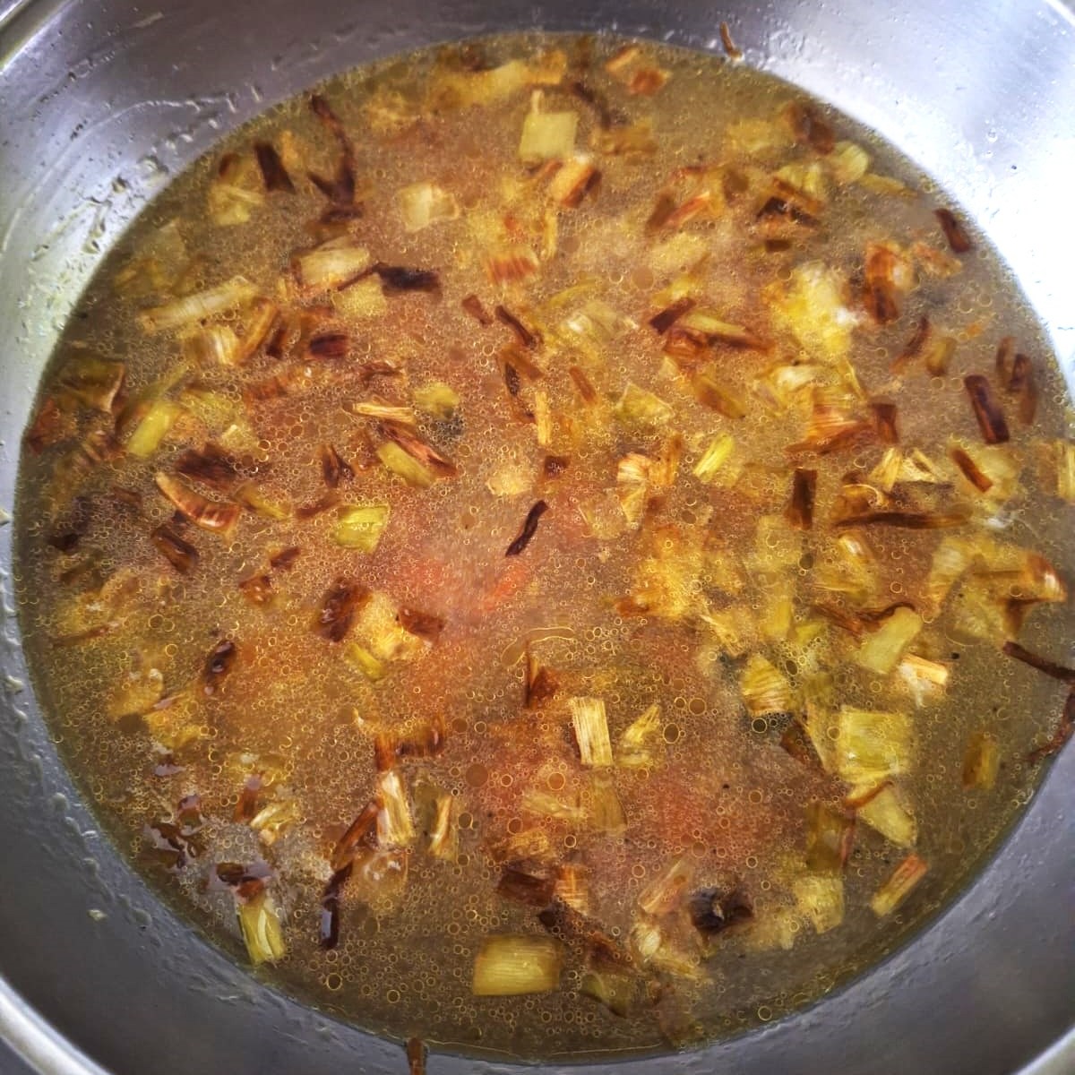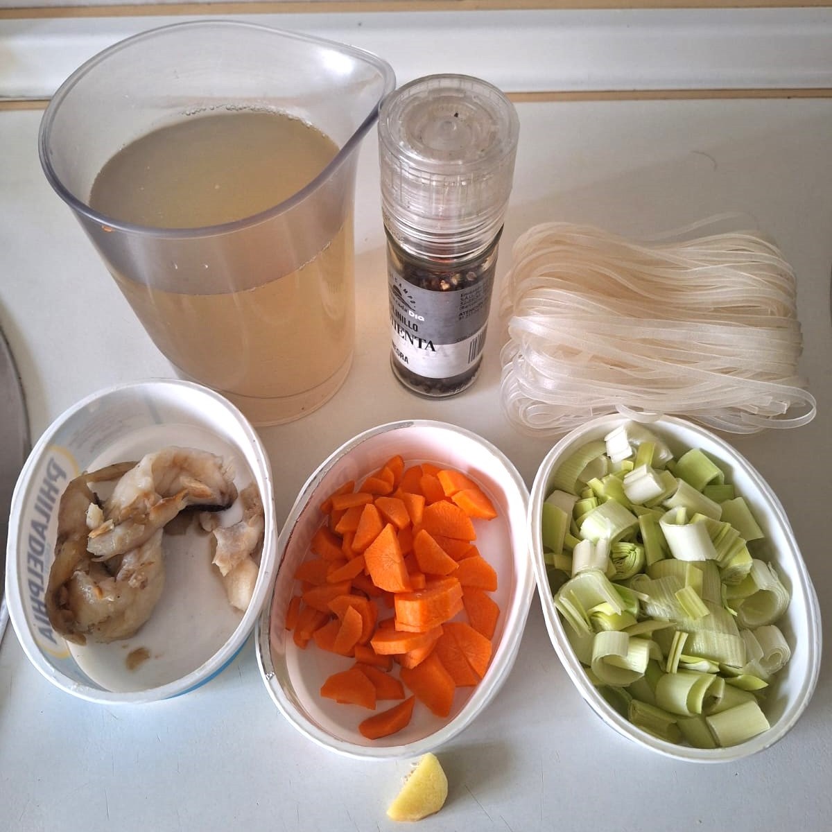 La receta es muy sencilla y, básicamente, lo que más tiempo lleva es preparar el caldo. Para hacerlo sólo he utilizado el hueso de rape, sin verduras, ya que prefiero pocharlas un poquito para que la sopa quede más sabrosa. Sólo le he puesto puerro y zanahoria y un toque de jengibre fresco. Los tallarines de arroz se hacen en un momento y los podéis cocer aparte o, como yo, añadirlos al final al caldo y dejar que absorban el sabor del resto de ingredientes.