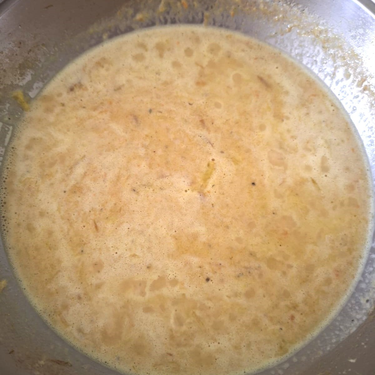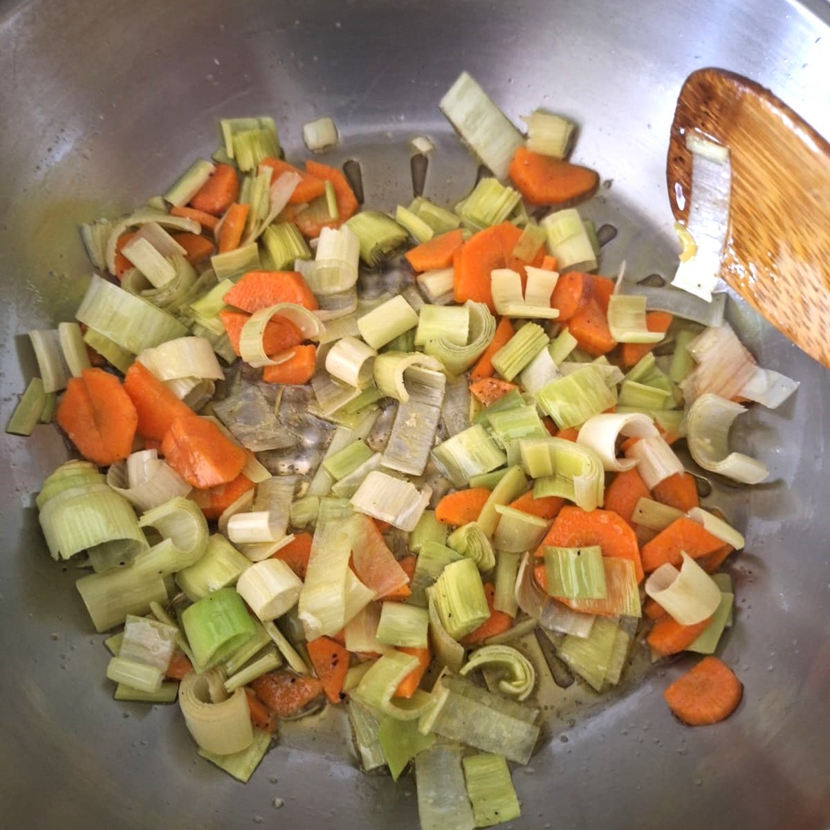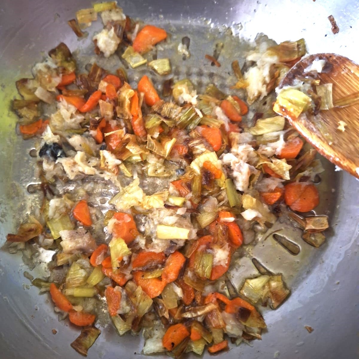 Limpia el puerro y corta en brunoise. Pela la zanahoria y corta en rodajitas. Pocha en un poco de aceite. Agrega el jengibre majado, la sal y la pimienta y, posteriormente, el caldo y el pescado desmigado. Cuece hasta que las verduras estén tiernas y tritura con la batidora.
