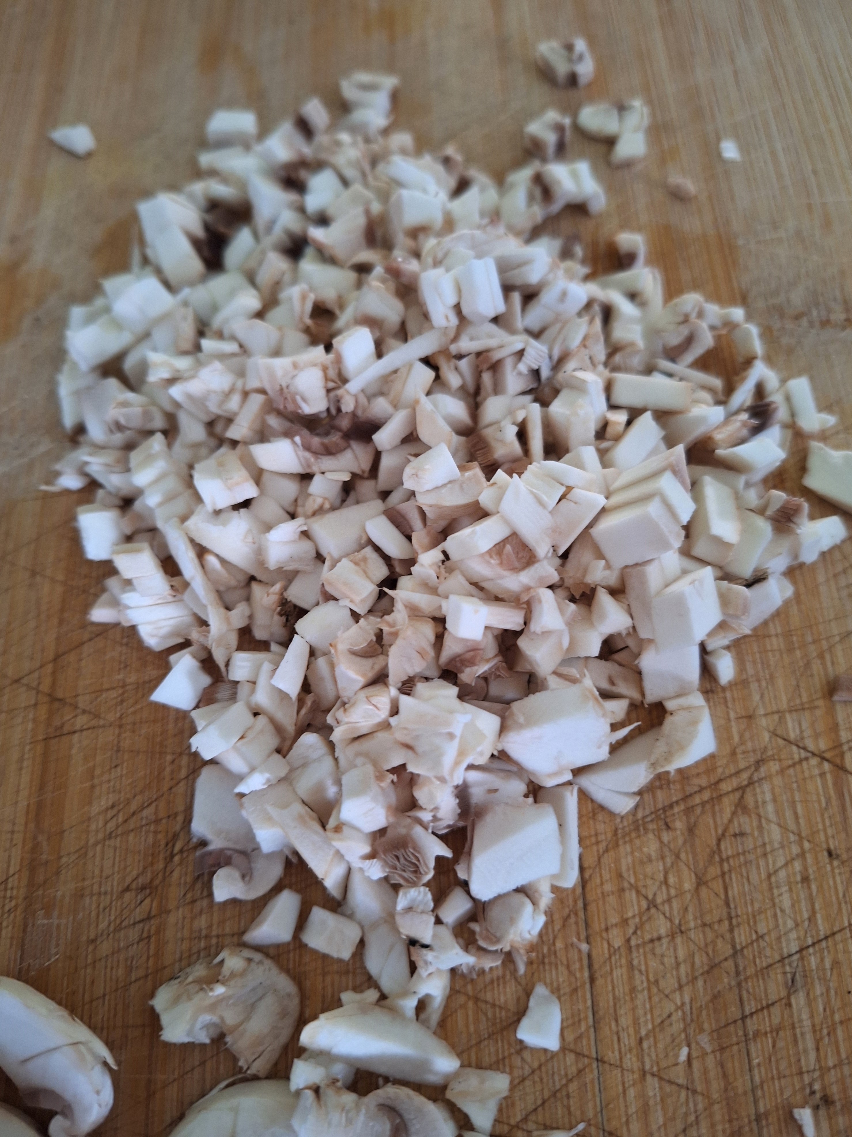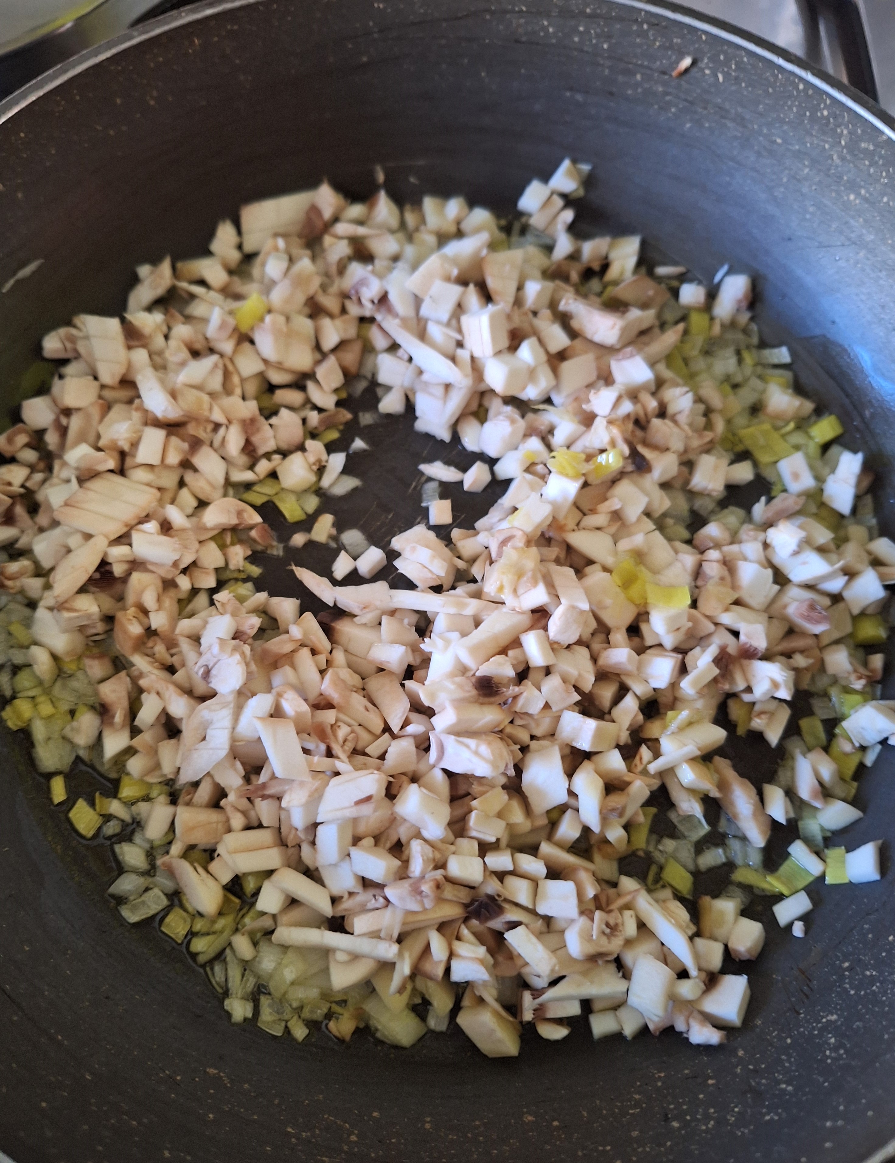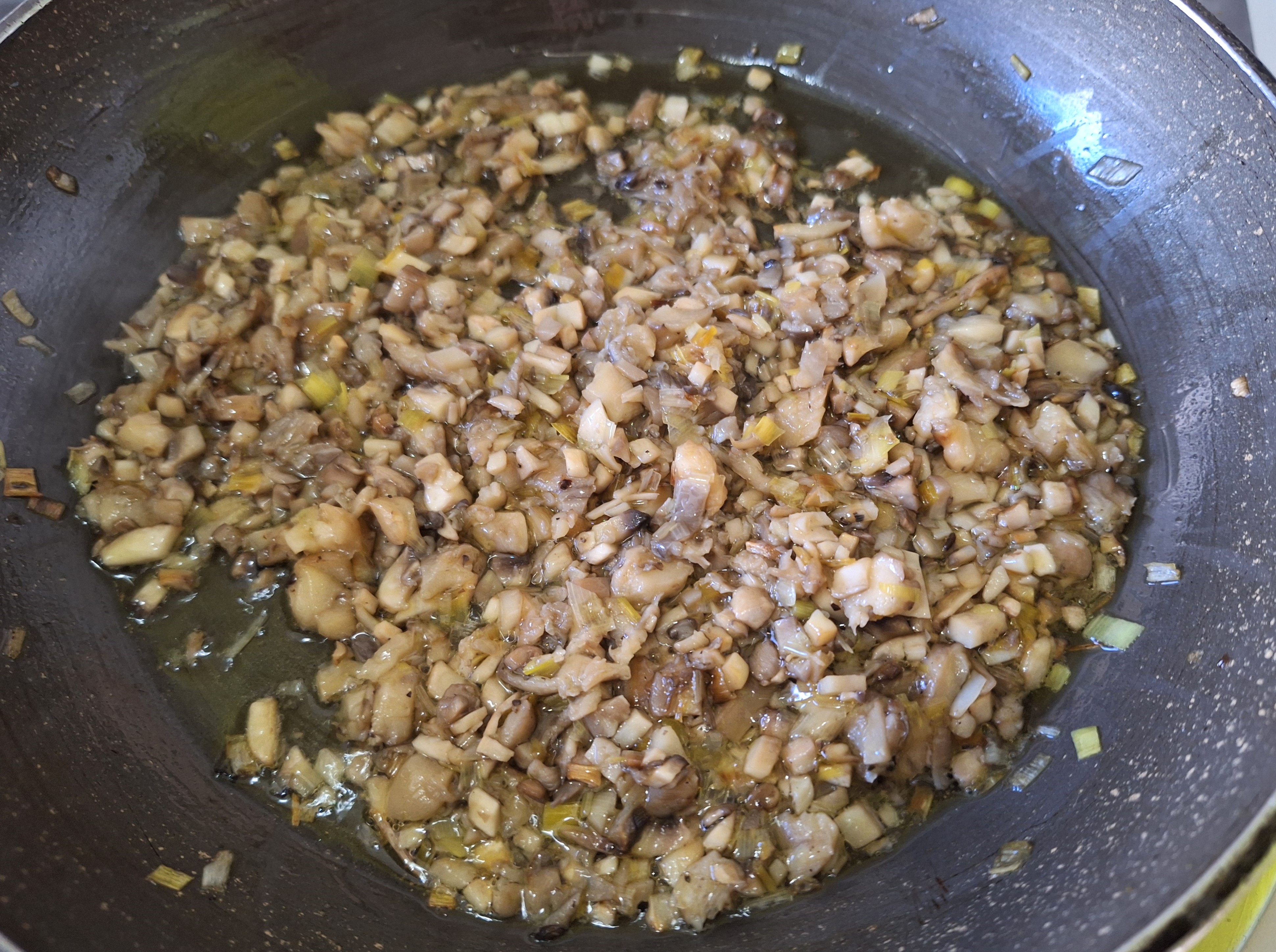 Prepara el relleno: para ello limpia el puerro y las setas y corta en brunoise.