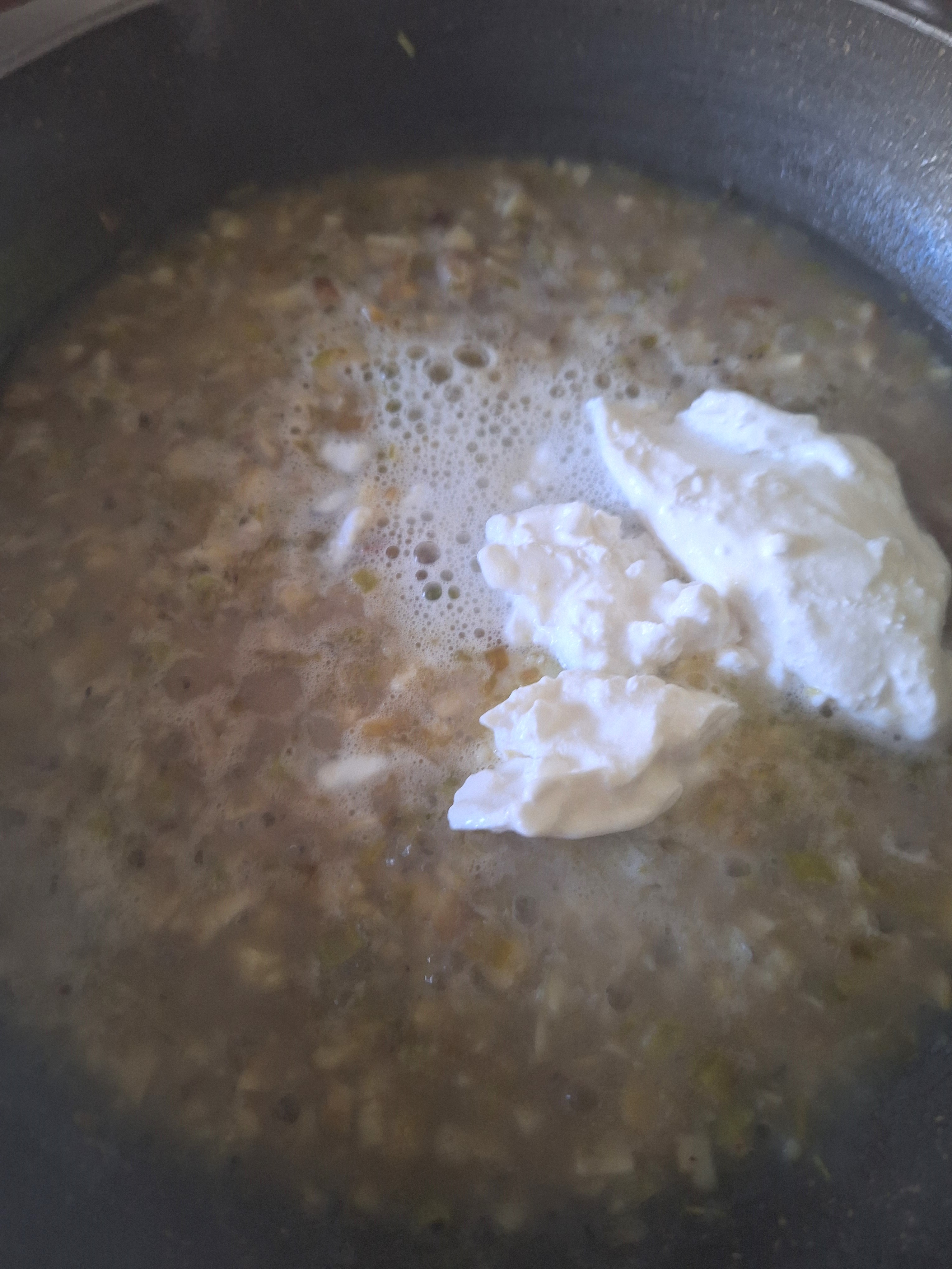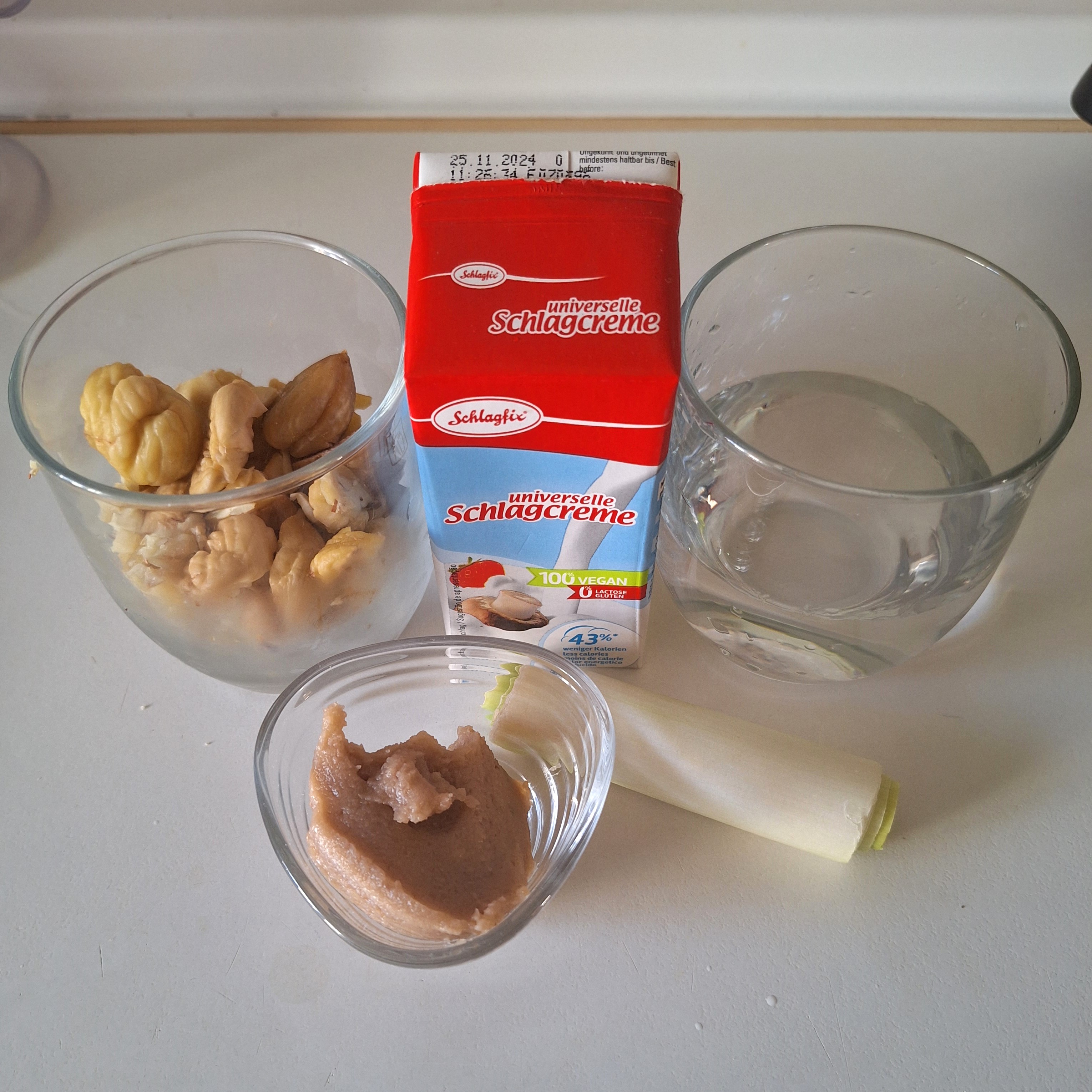 Limpia el puerro y corta en brunoise. Pocha en un poco de aceite hasta que se dore. Agrega las castañas picadas (reserva unas cuantas para decorar), la crema de castañas y el agua y lleva a ebullición. Añade entonces la nata, baja el fuego al mínimo y deja que reduzca un poco. Tritura hasta obtener una crema (puedes añadir más agua para ajustar la textura a tu gusto). Reserva.