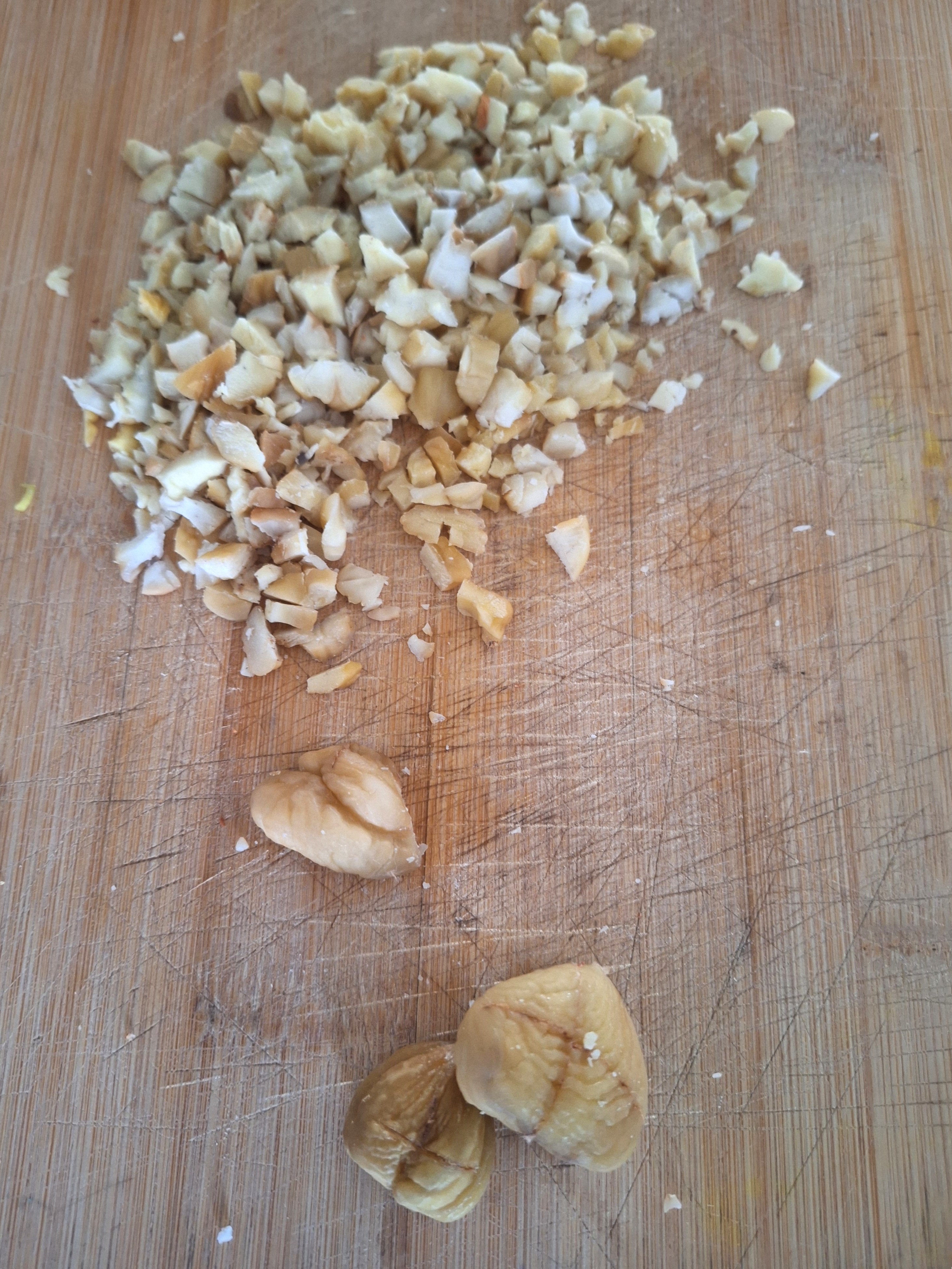 Prepara la salsa: lava las castañas y seca con un paño. Haz un corte en forma de cruz para que no exploten. Coloca en un recipiente de cristal y lleva al microondas un par de minutos. Retira la piel y pica finamente.
