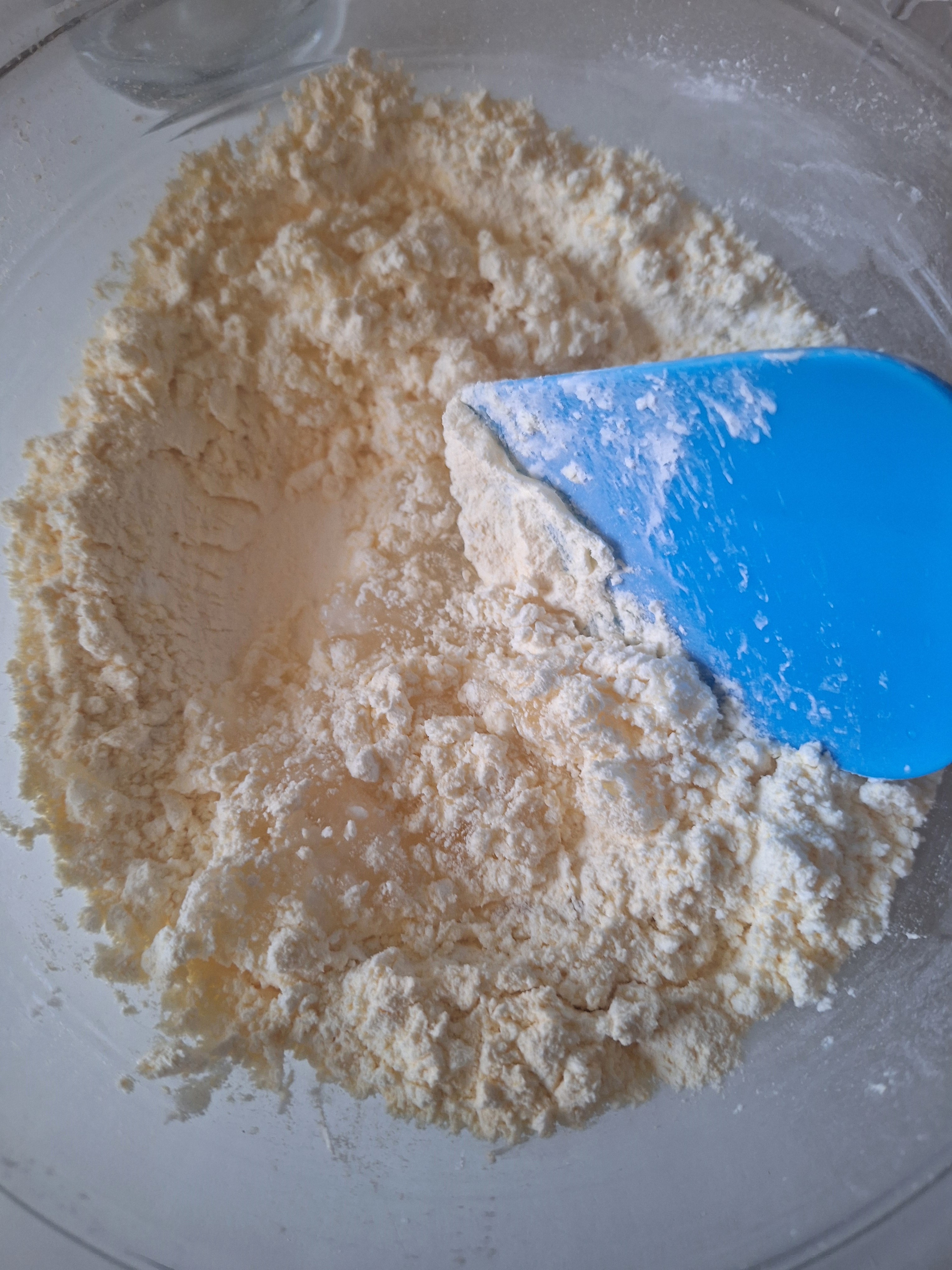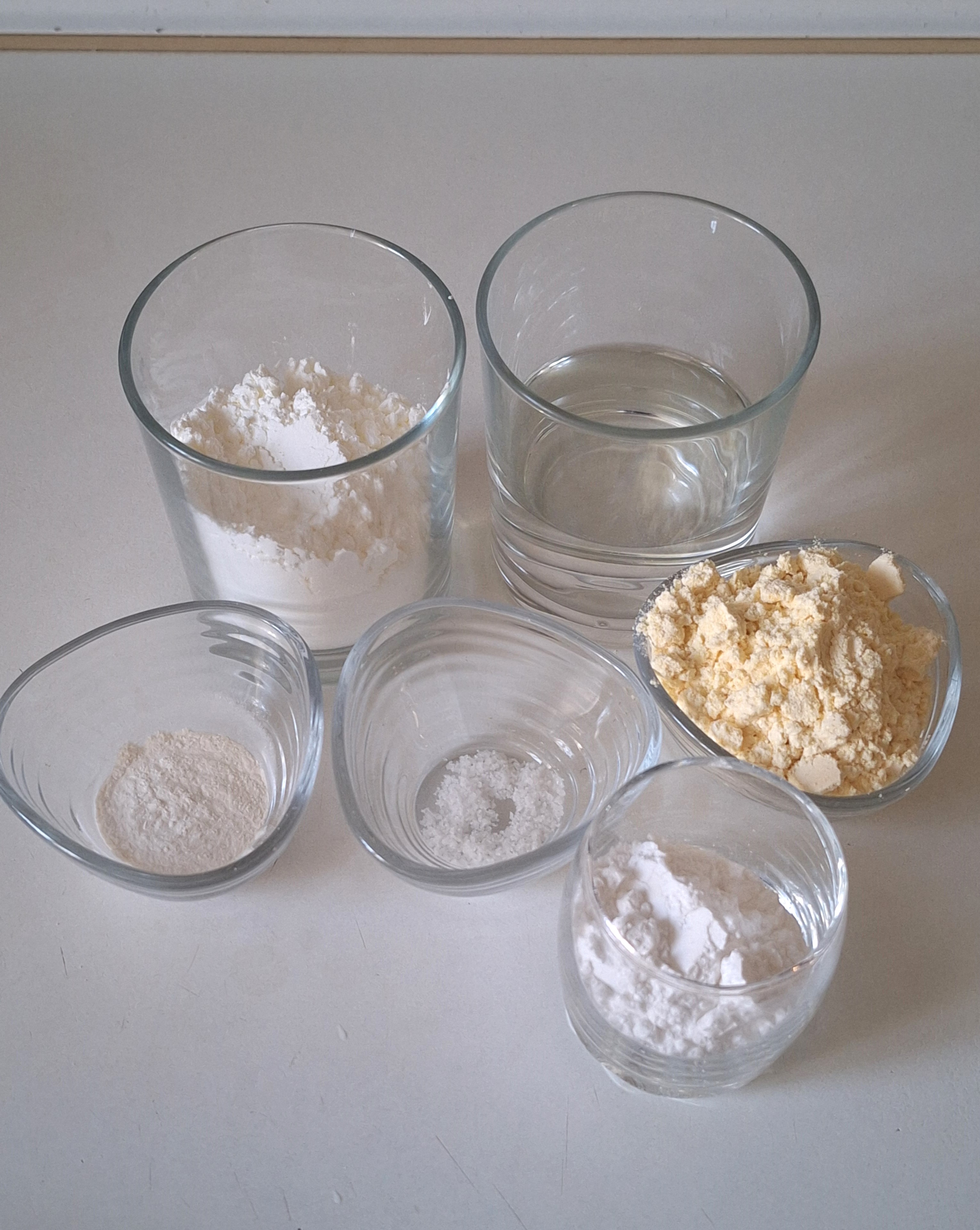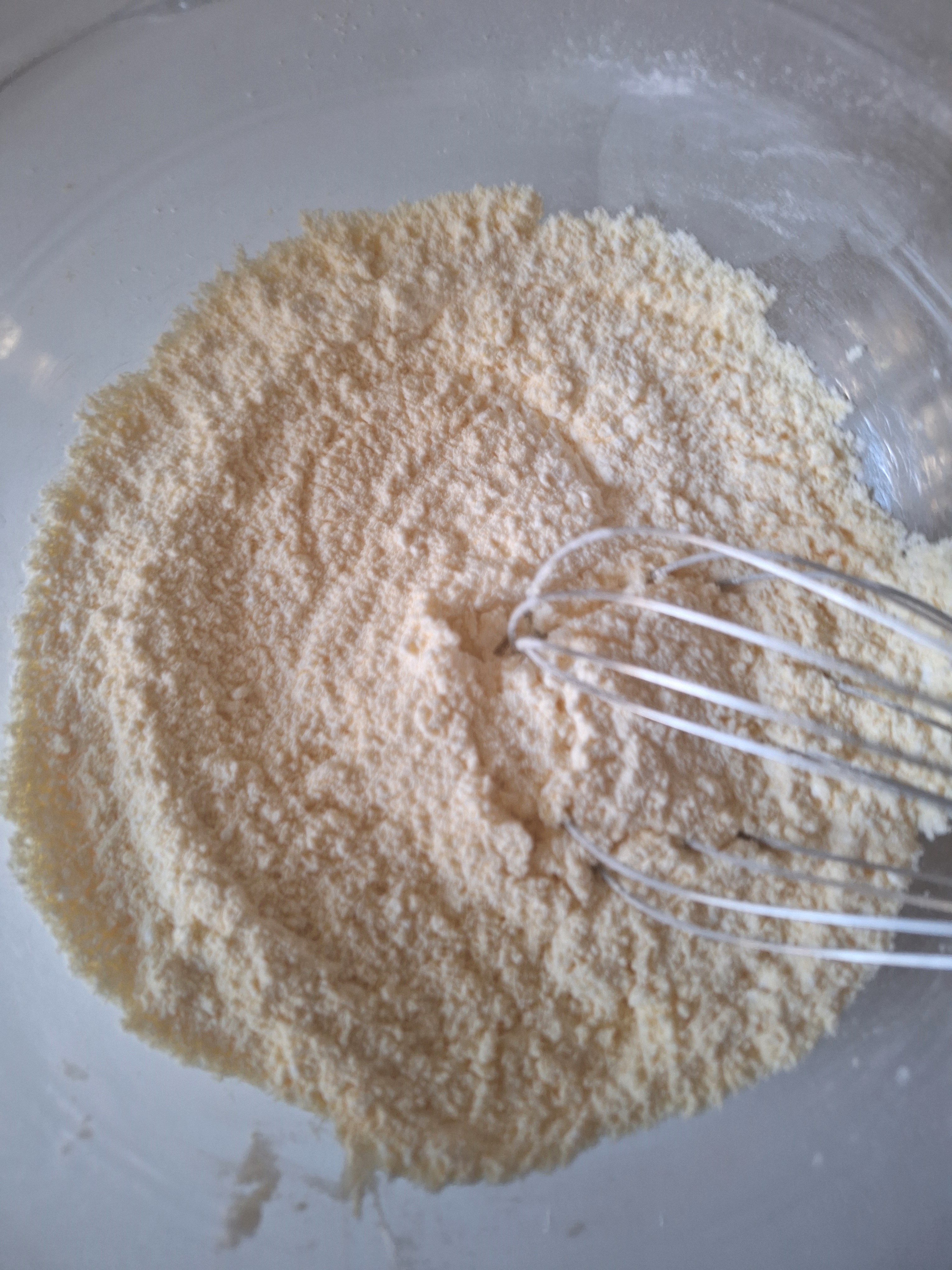 Prepara la pasta: tamiza la harina de maíz y el almidón de maíz y añade la sal y la goma xantana. Mezcla bien.