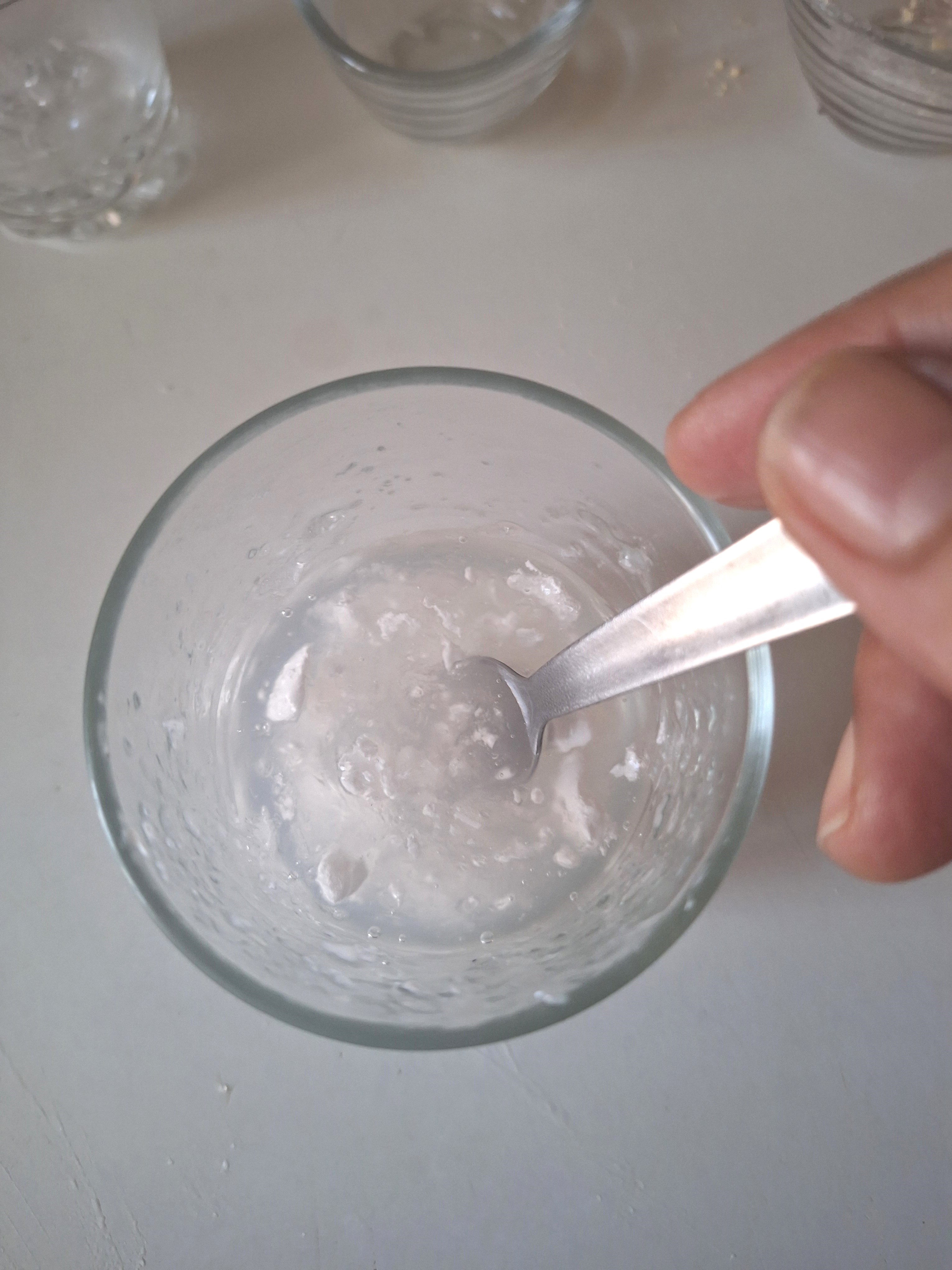 Hierve el agua y vierte sobre el almidón de tapioca, remueve seguidamente para que se forme un gel. Te van a quedar grumos, pero no pasa nada.