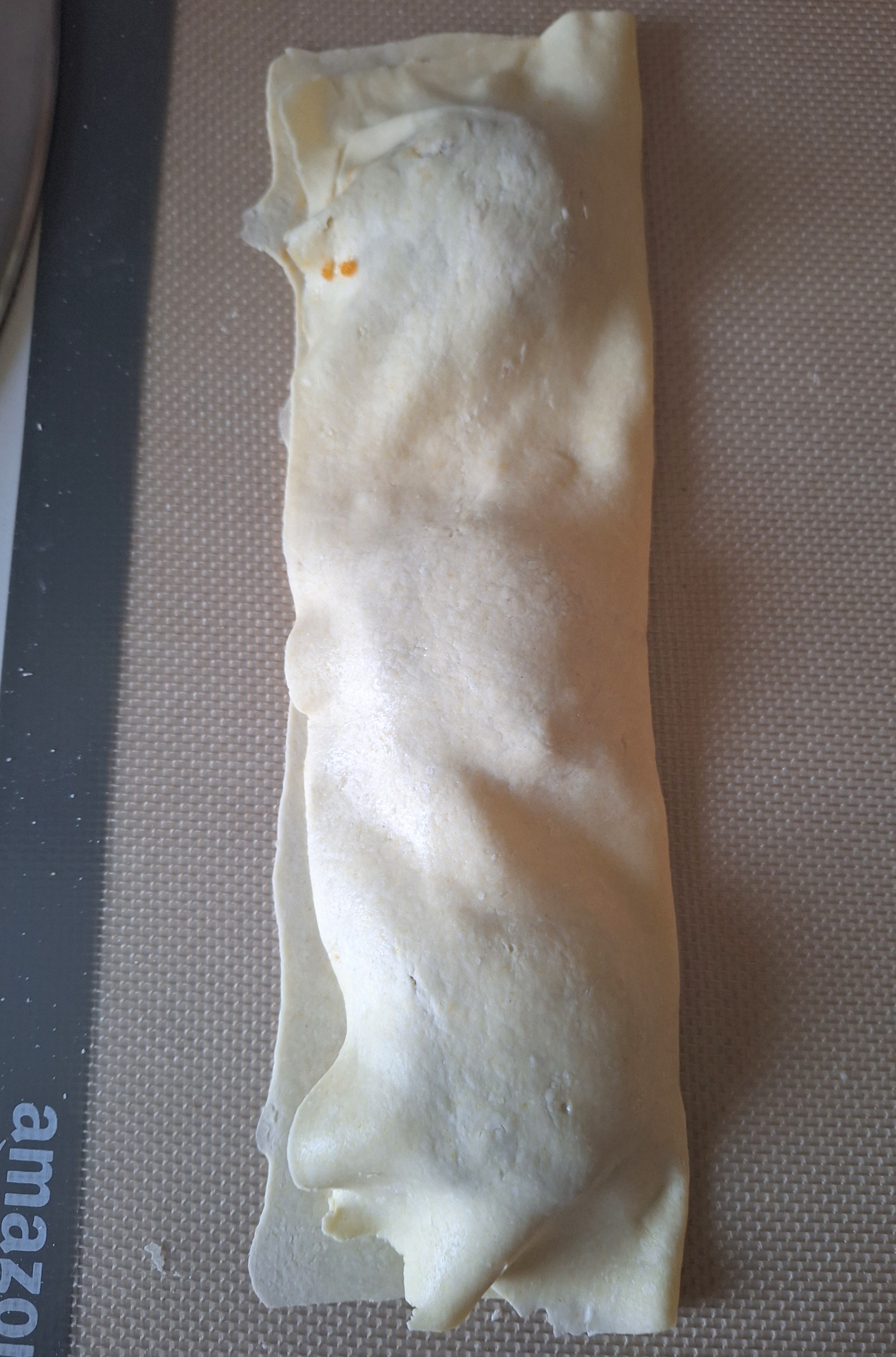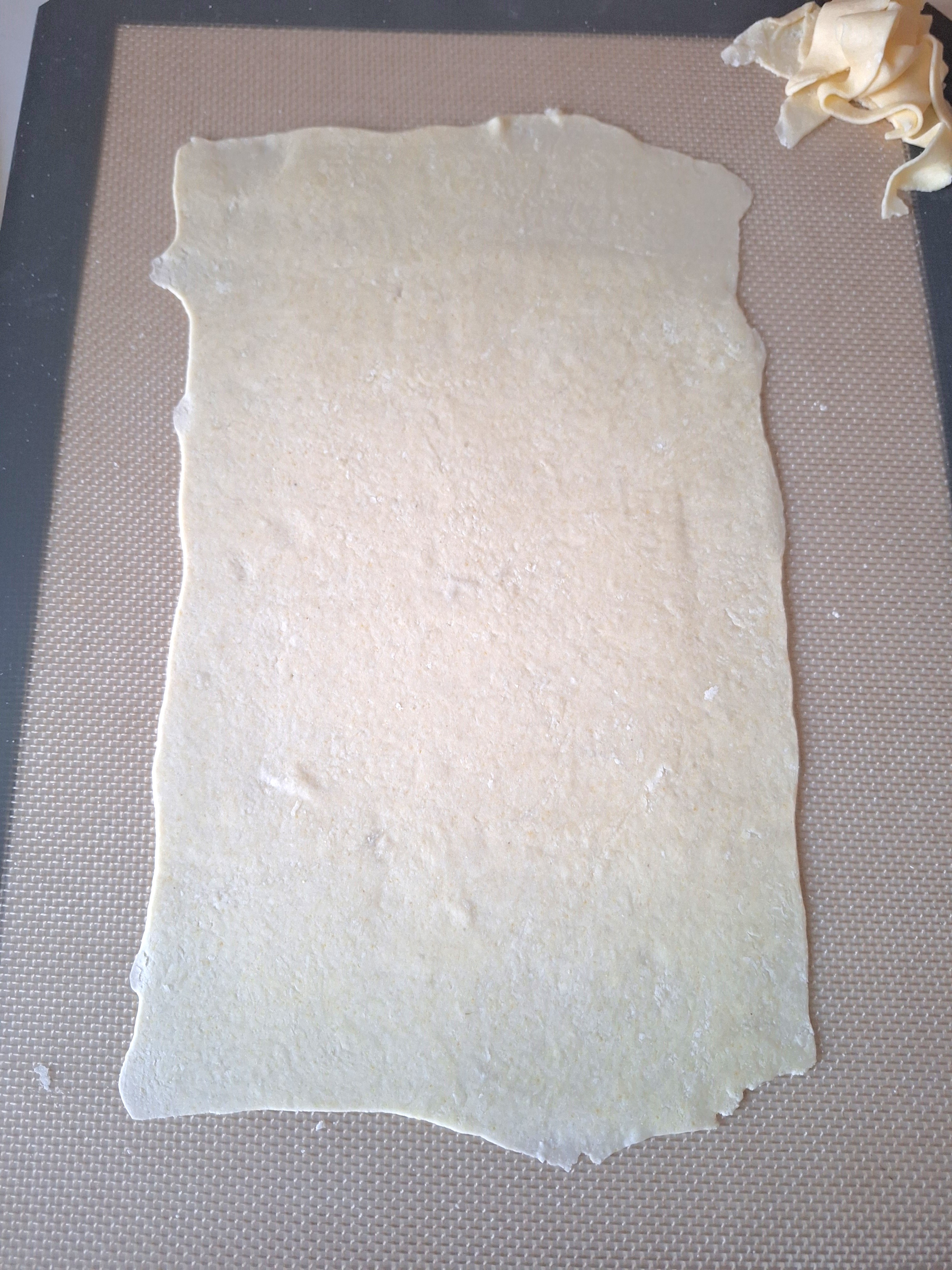 Divide la masa en dos y estira una de ellas con el rodillo sobre la mesa o papel de horno reutilizable. Si se pega mucho, añade un poco de harina a la superficie de amasado, pero la justa. Da forma de rectángulo.