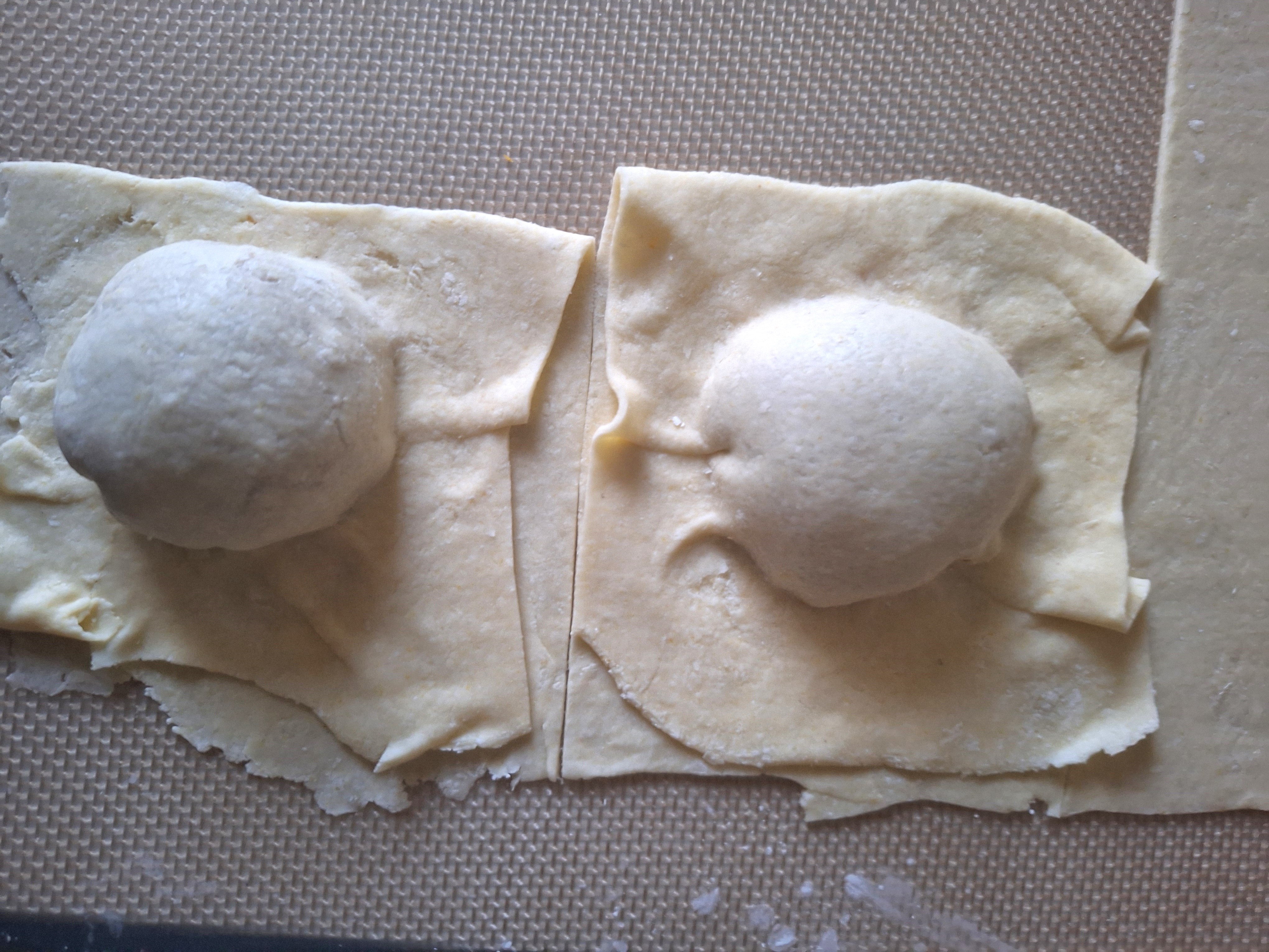 Hay varios consejos que harán más fácil esta tarea y que la propia autora dice en su web: utilizar agua !hirviendo!; si se pega mucho al amasar dejar que atempere un poco envuelta en film y utilizar la harina justa al estirar en caso de que se pegue. También señala que la harina a utilizar es la de maíz cruda (la amarilla normal, no la precocida que se utiliza para arepas). Otro de sus consejos es estirarla muy bien y, cuando creas que ya está, seguir estirando… Yo creo que la estiré demasiado porque al montar los raviolos se me fastidiaron un par de ellos… Pero bueno, lo importante es que quede fina y manipulable.