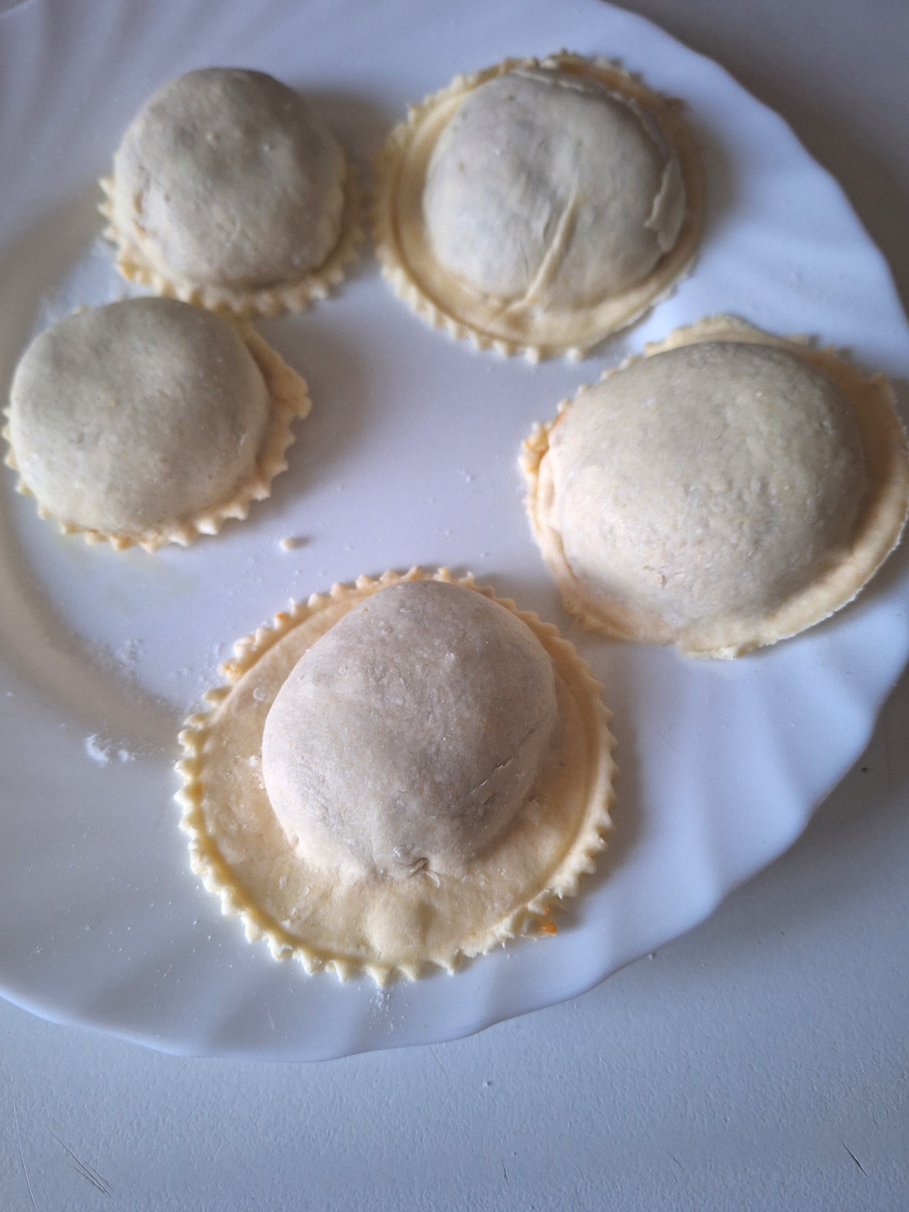 En uno de los extremos coloca un poco del relleno dejando un hueco entre los montoncitos. Con una brocha o el dedo moja la masa con un poco de agua para que se pegue mejor. Pliega la masa y con cuidado presiona para que se pegue alrededor de la masa, intentado que no quede aire. Con un cortador de pasta termina de preparar el raviolo.