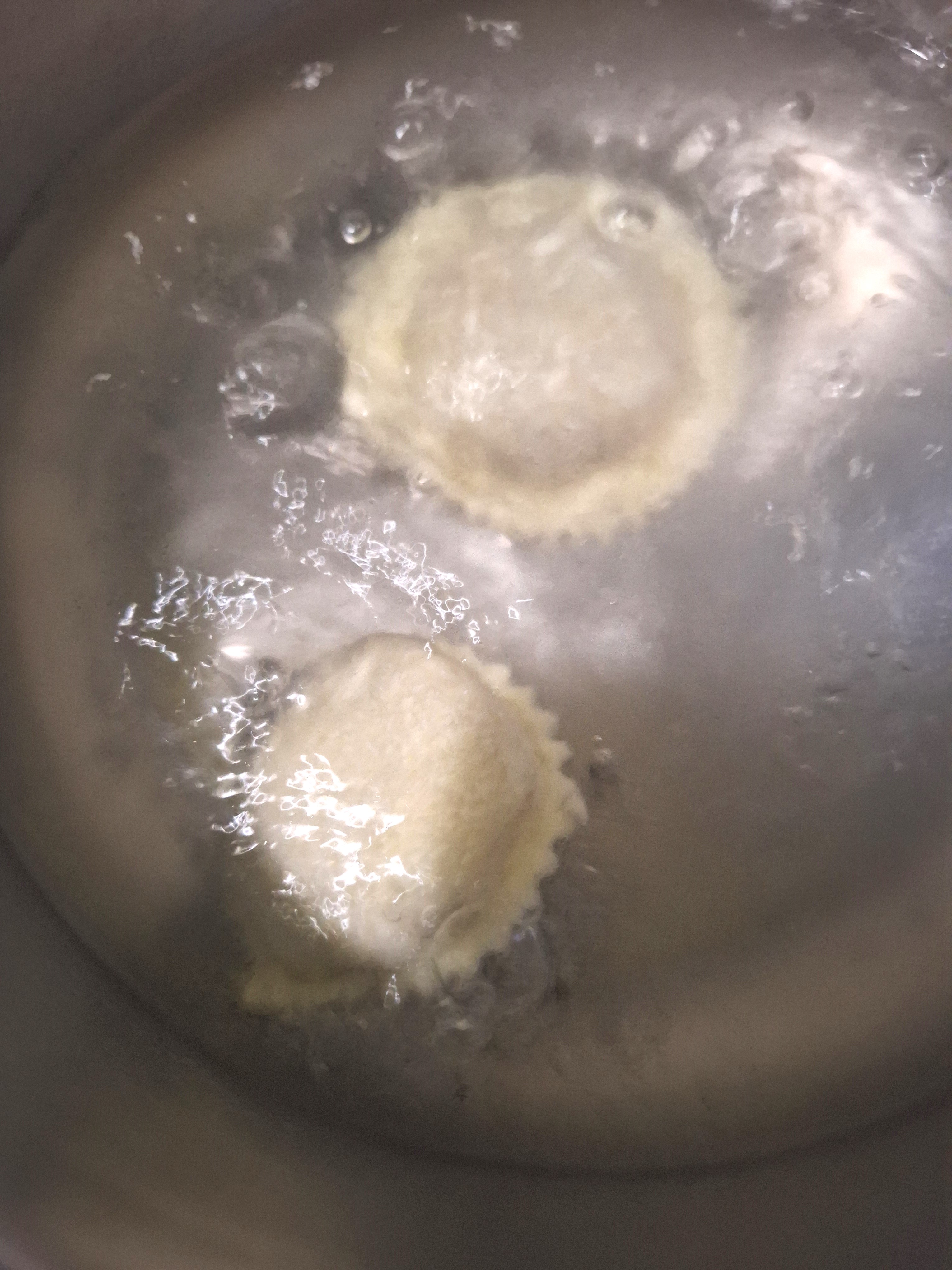 Hierve abundante agua con sal en una olla grande y añade los raviolos (no muchos a la vez). Cocina durante 2-3 minutos, hasta que empiecen a flotar.