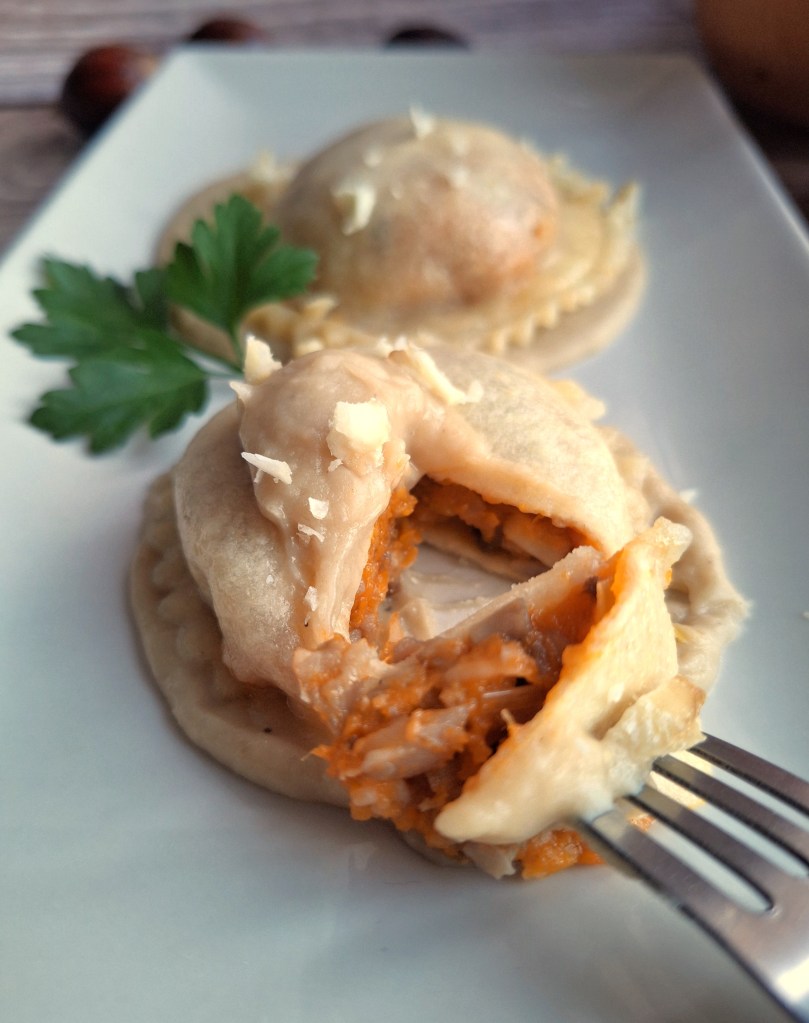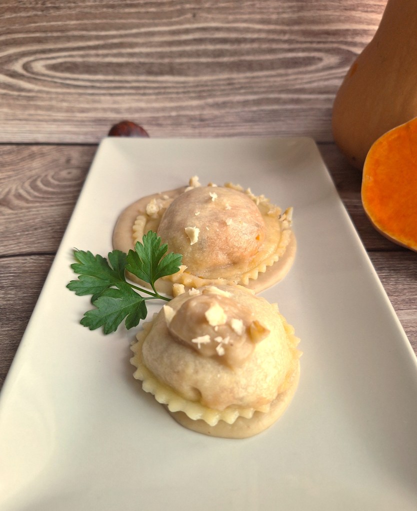 RAVIOLO RELLENO DE CALABAZA Y SETAS CON SALSA DE CASTAÑAS