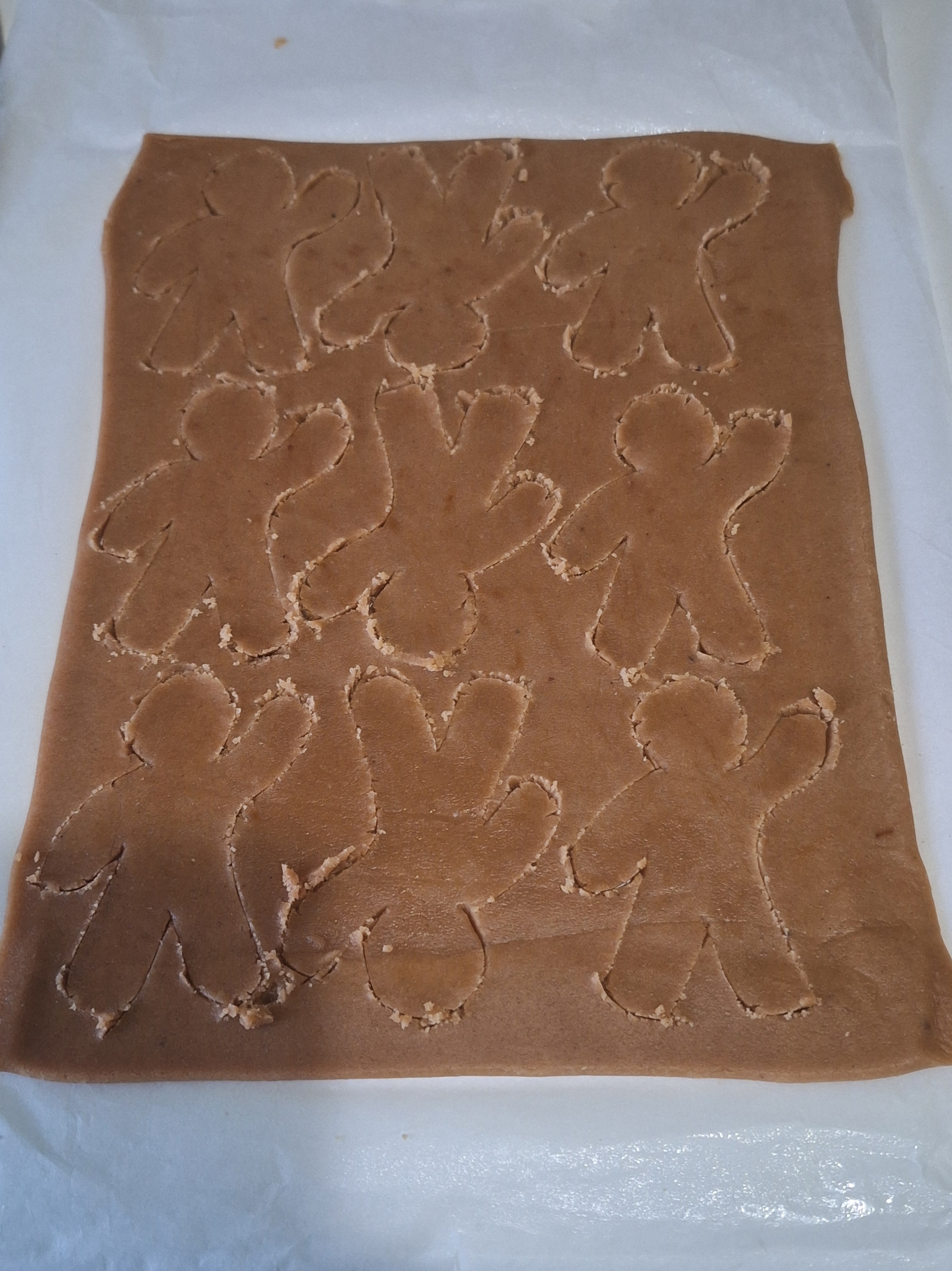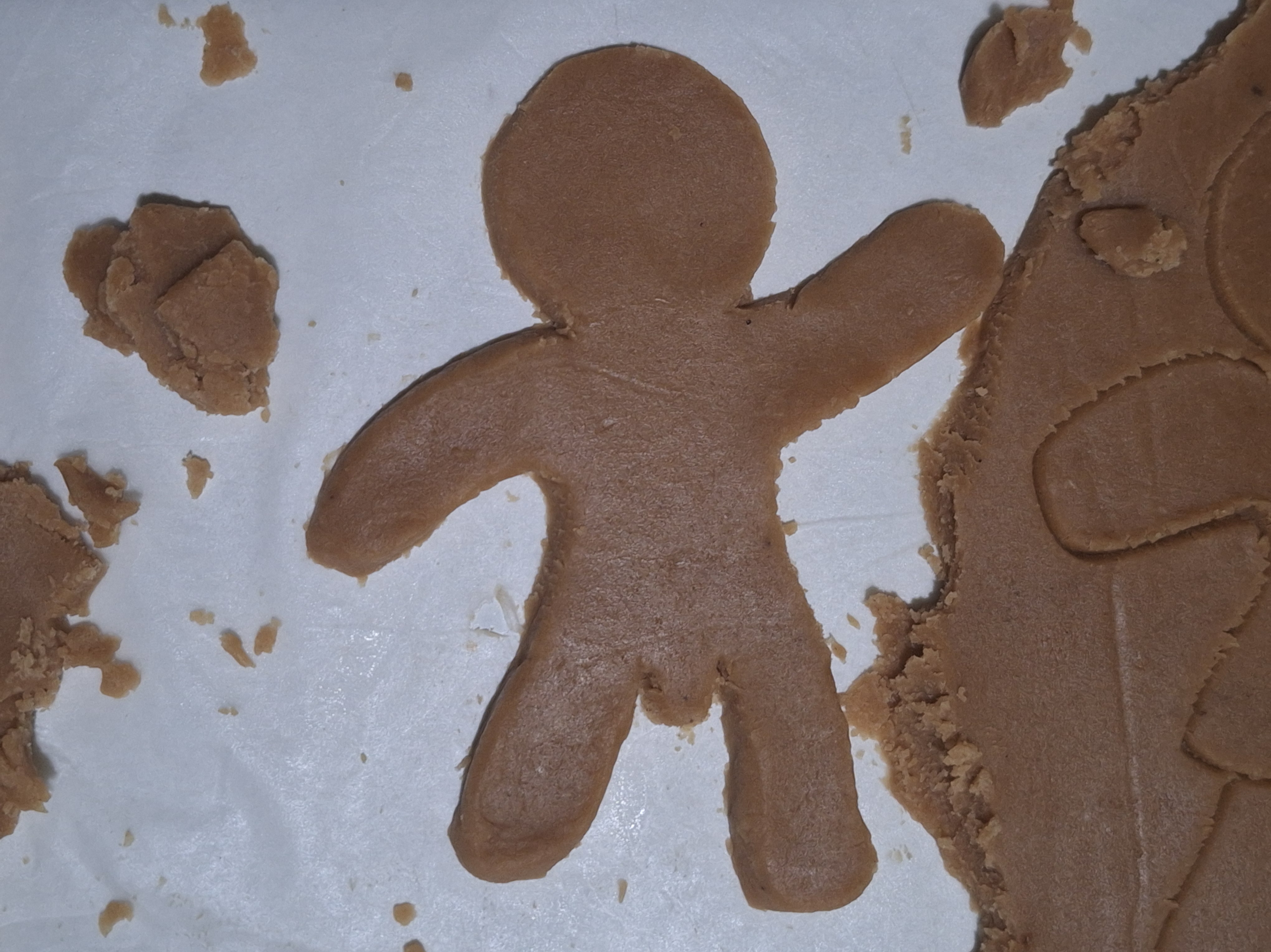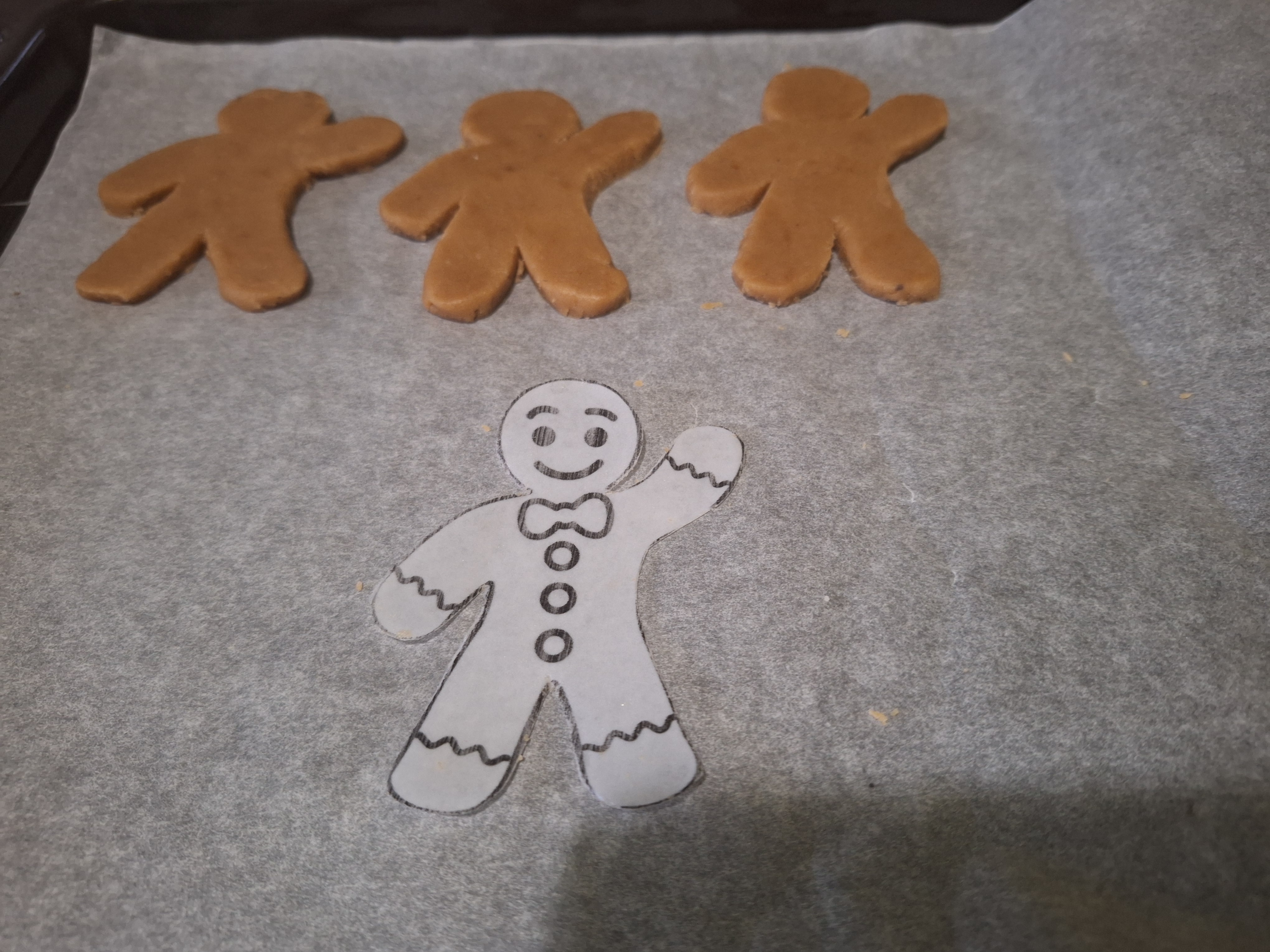 La masa es un poco complicada de trabajar. Bueno, es complicada porque como no tenía molde tuve que utilizar un molde de papel y cortar con un cutter. Un trabajo de chinos, pero no sabéis las risas que me eché yo solita esa tarde. Como me costaba mucho hacer la forma, decidí hacer un par de ellos en tamaño XL, Gingerman y Gingerwoman, a mano alzada y sin molde (de ahí que algunas partes hayan quedado más tostadas que otras). Para el resto de la masa utilicé un cortador en forma de estrella. La verdad es que fue mucho más fácil de manipular y quedaron perfectas.