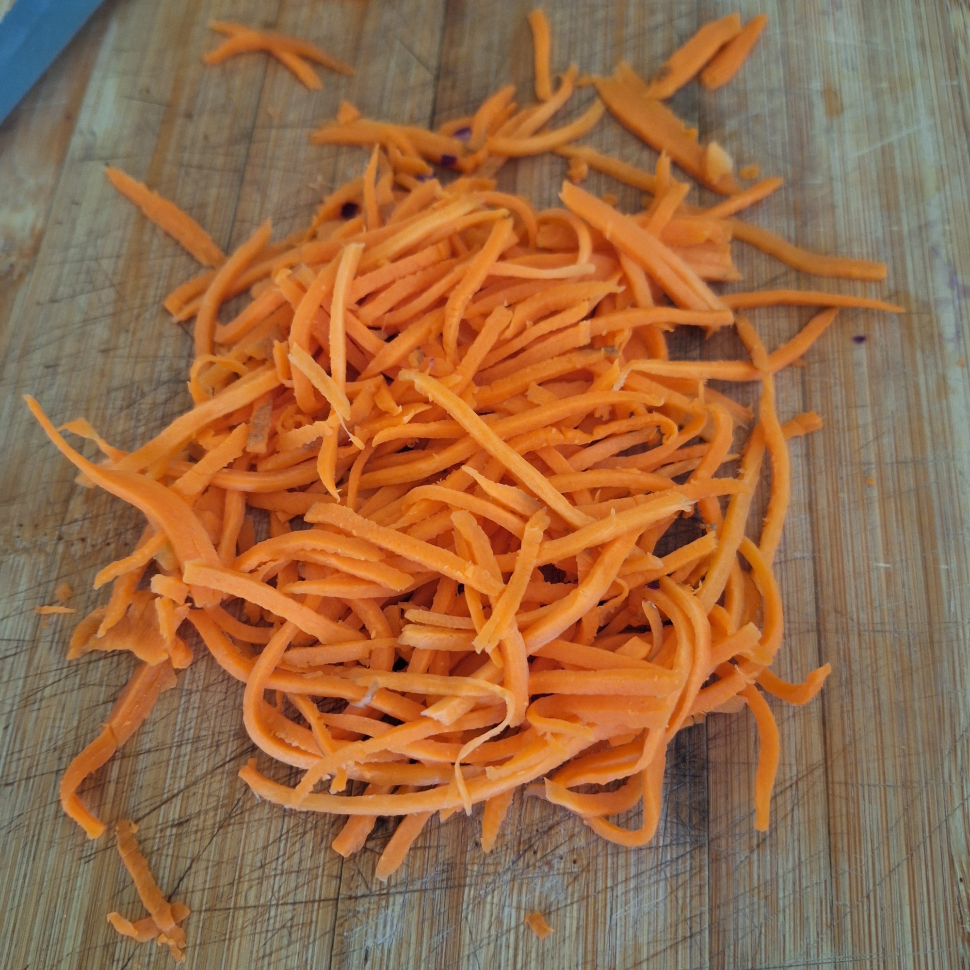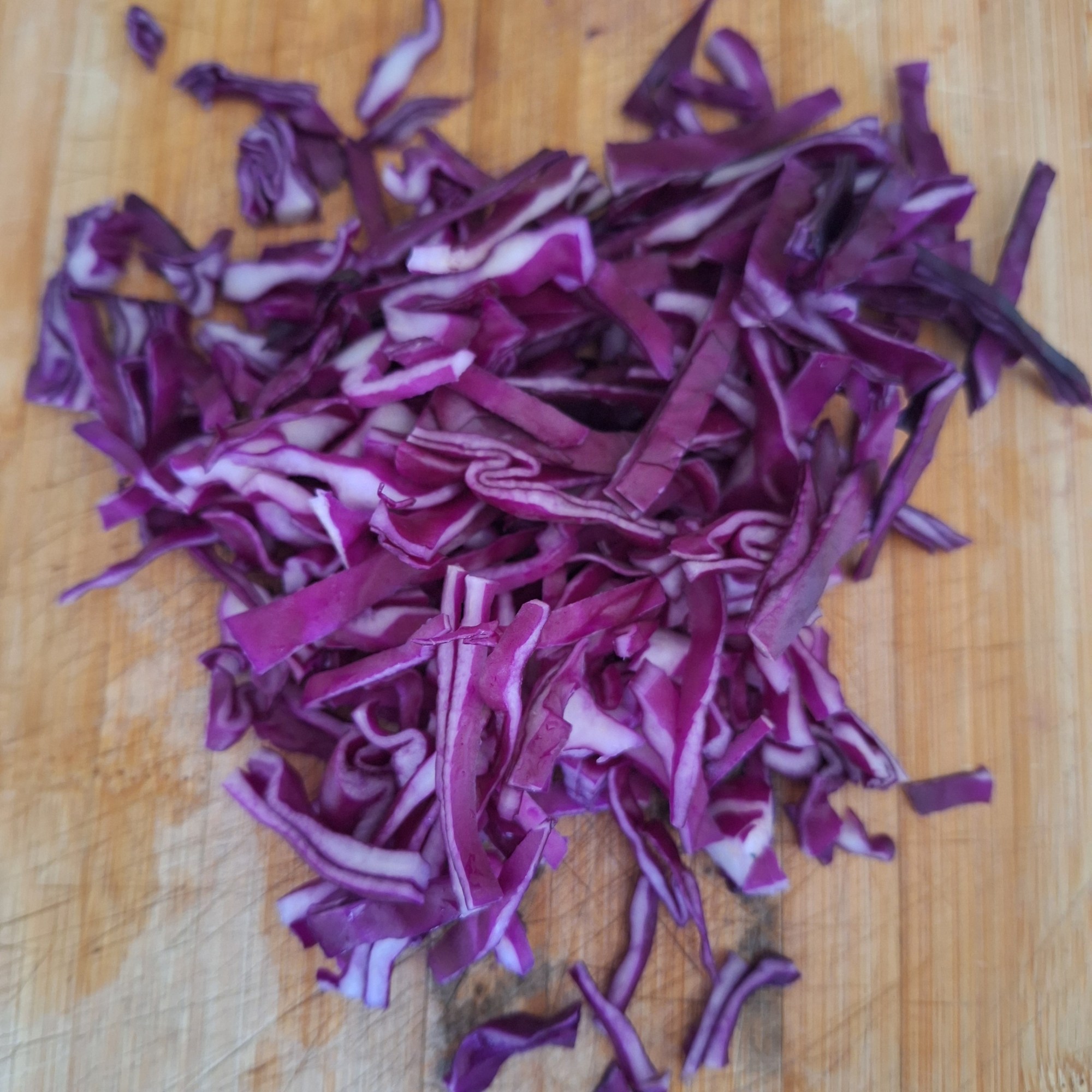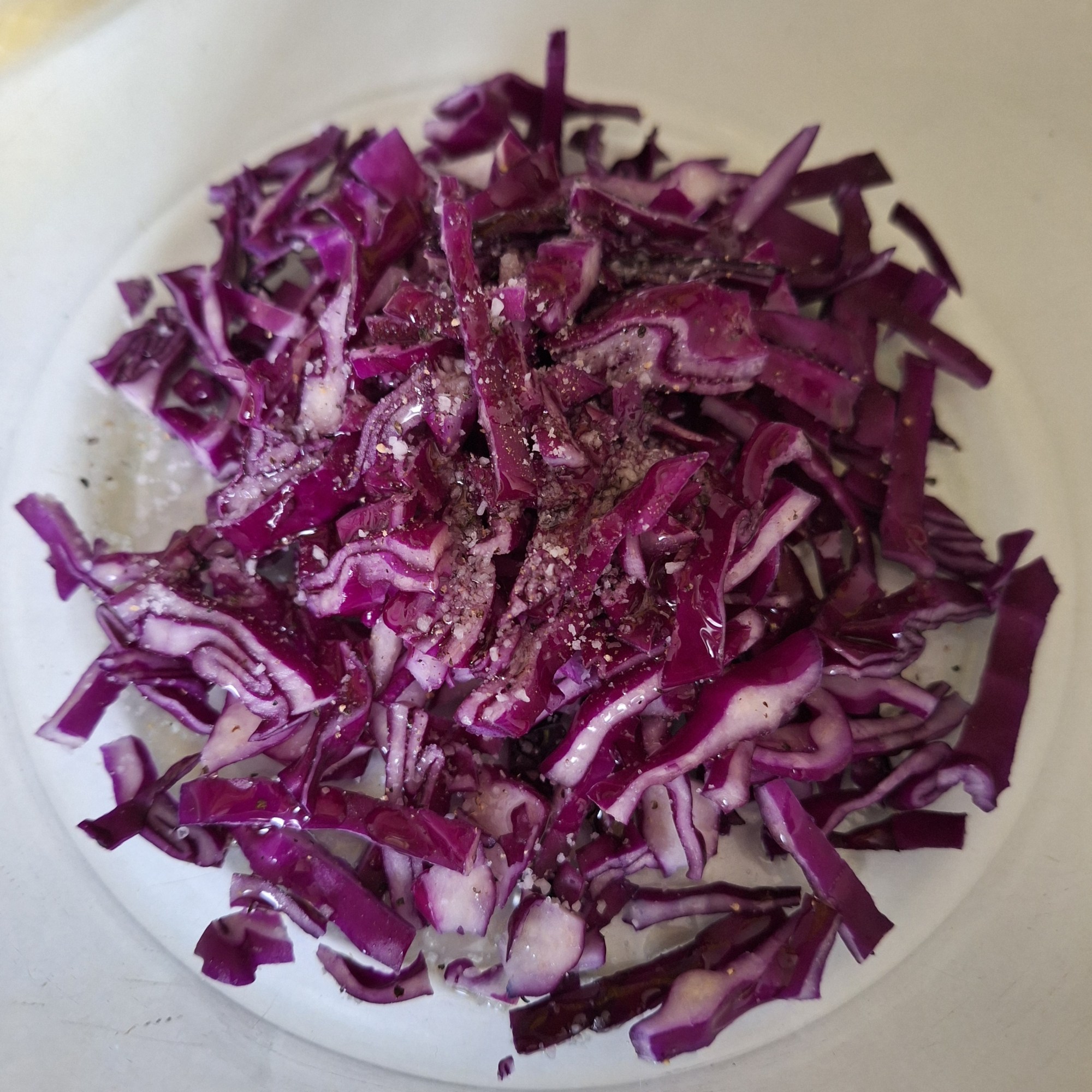 Corta la lombarda en juliana fina. Aliña con aceite, y sal y estruja con las manos para que se ablande un poco. Deja macerar mientras preparas el resto. Pela y ralla la zanahoria. Añade a la lombarda y sazona con pimienta. Mezcla bien y coloca en el centro de la ensalada.