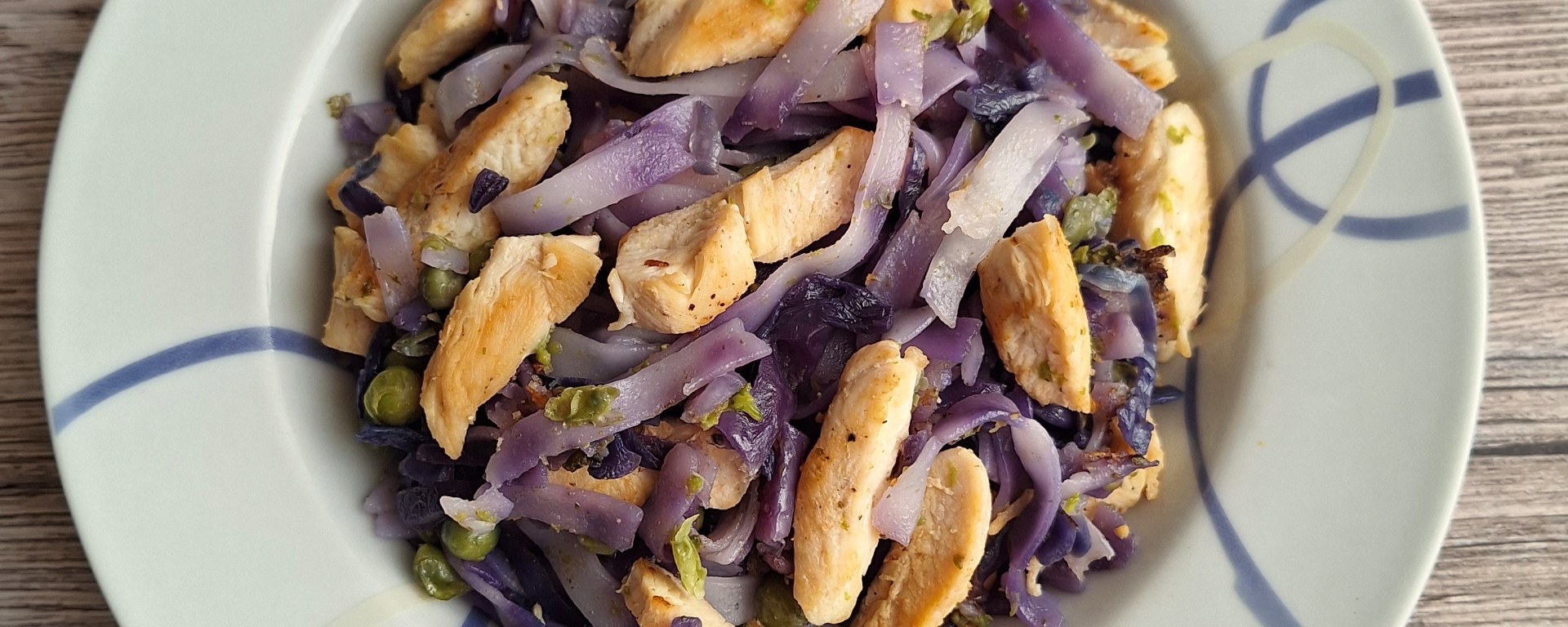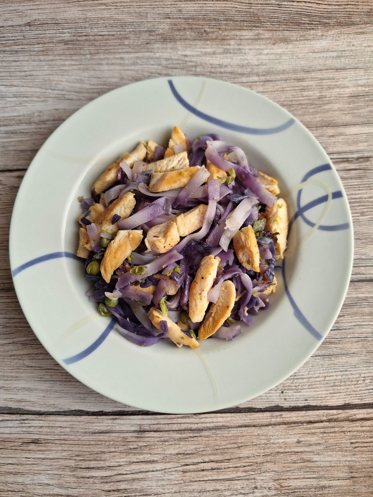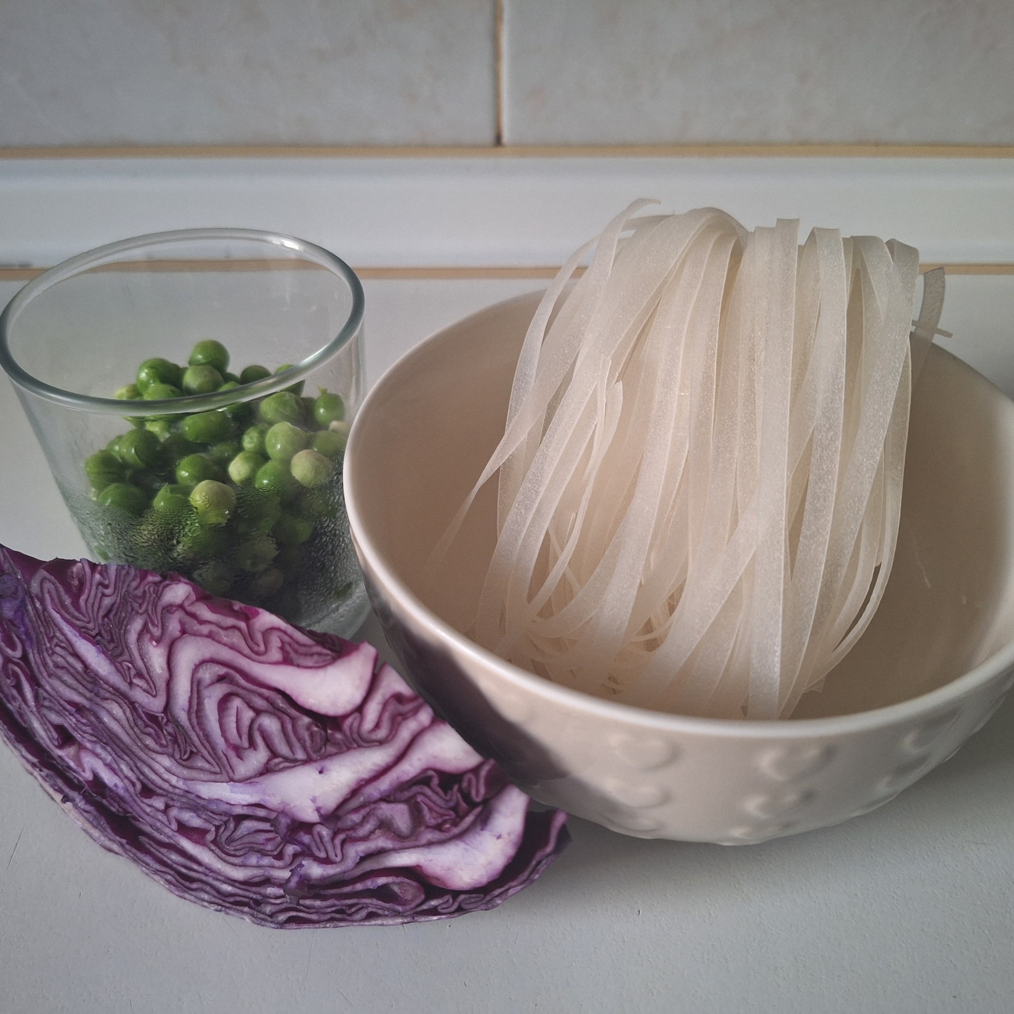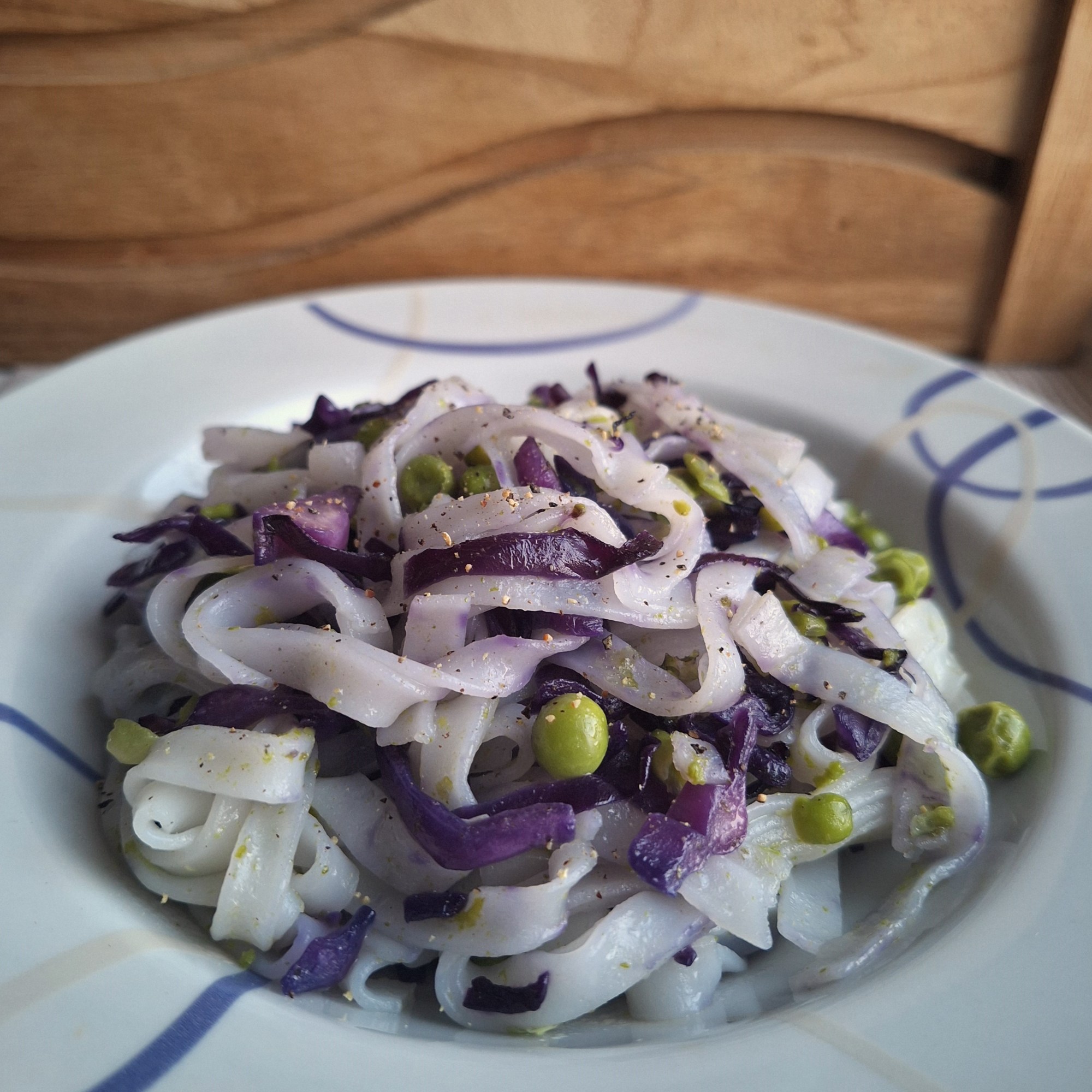 TALLARINES DE ARROZ CON POLLO, LOMBARDA Y GUISANTES