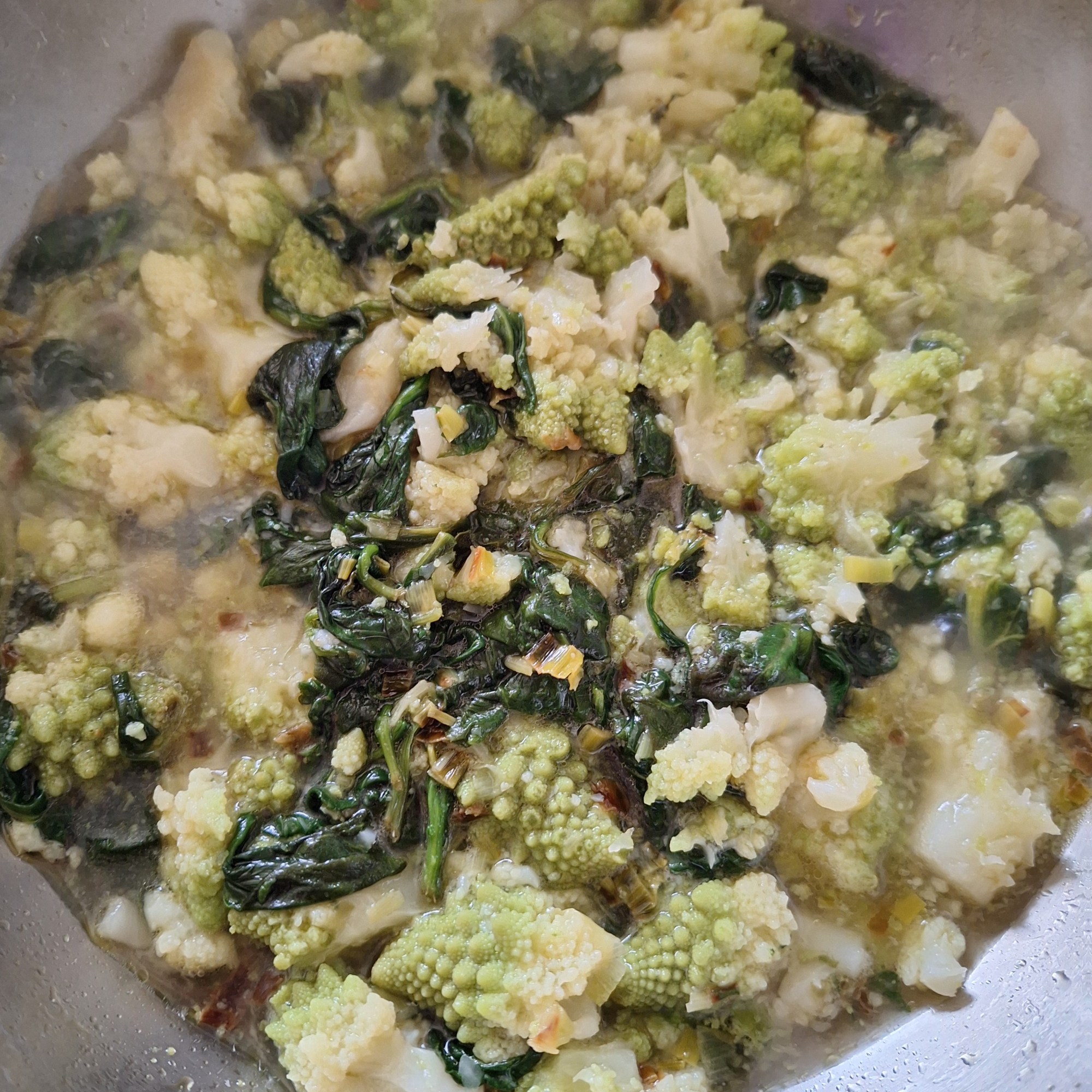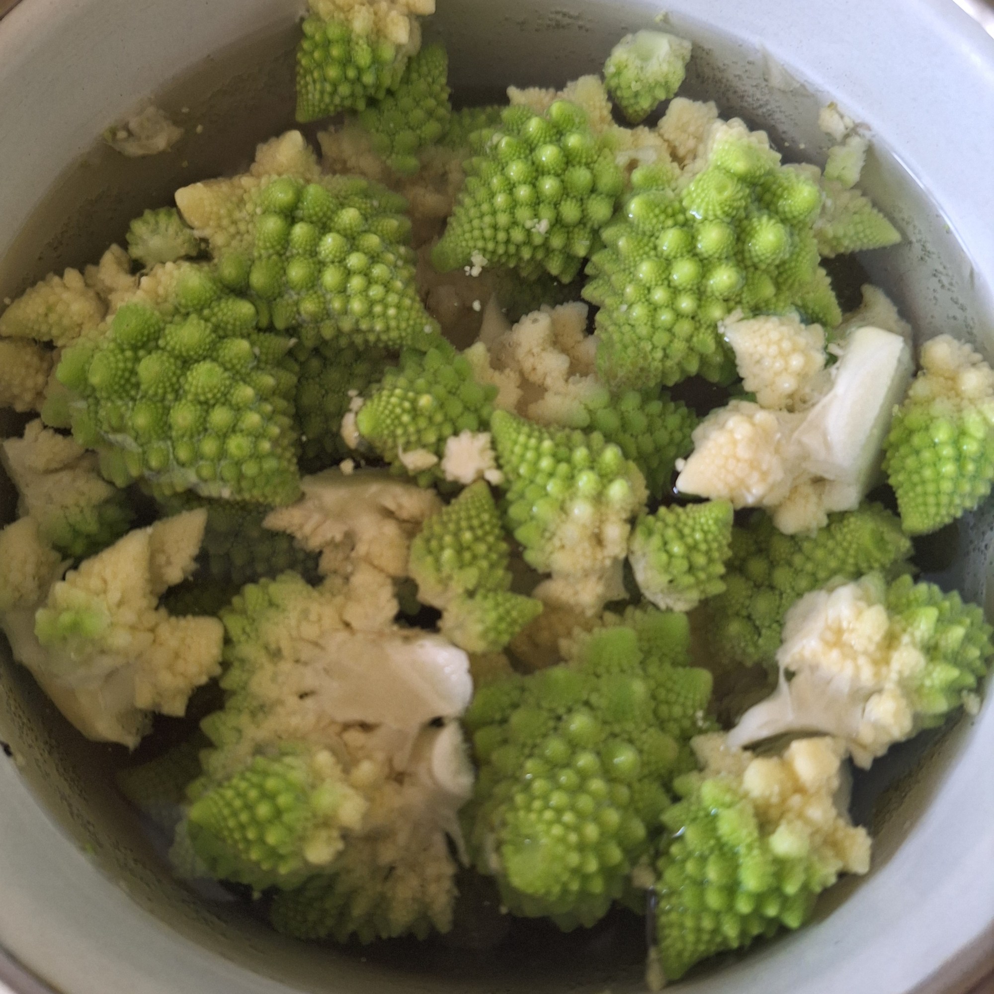 Lava el romanesco y separa las flores. Cuece en abundante agua con sal. Escurre (reserva el agua de cocción en un recipiente) y reserva unas flores para decorar.