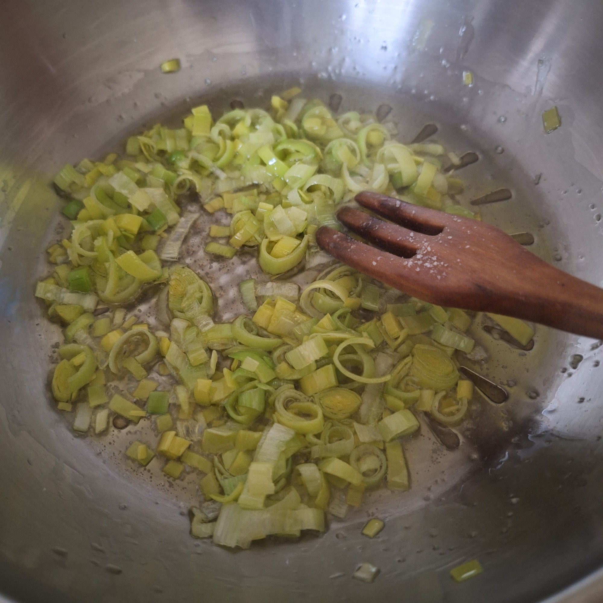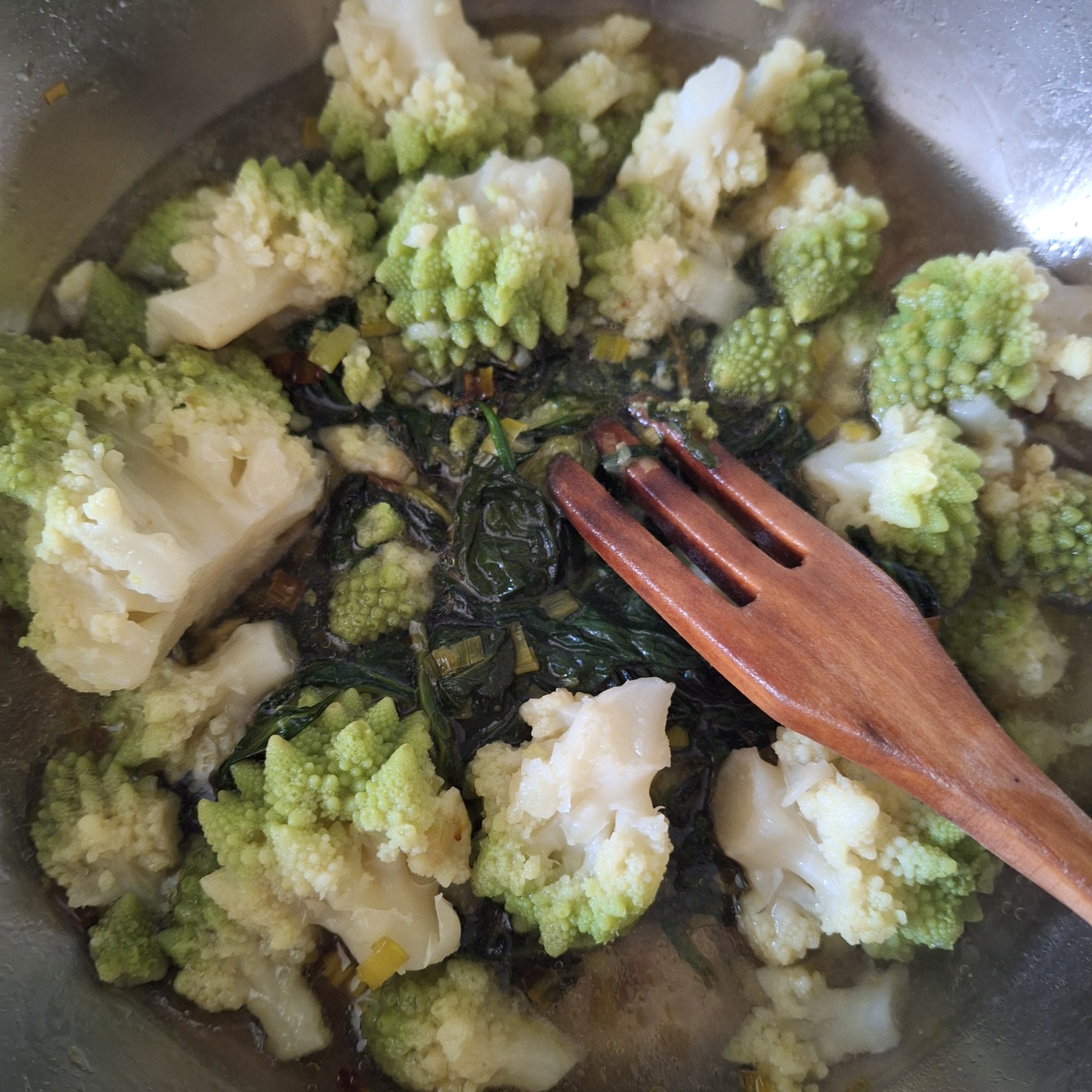 Limpia el puerro y corta en brunoise. Pocha en un poco de aceite. Añade las espinacas lavadas y cocina hasta que queden tiernas. Salpimenta y añade el romanesco.
