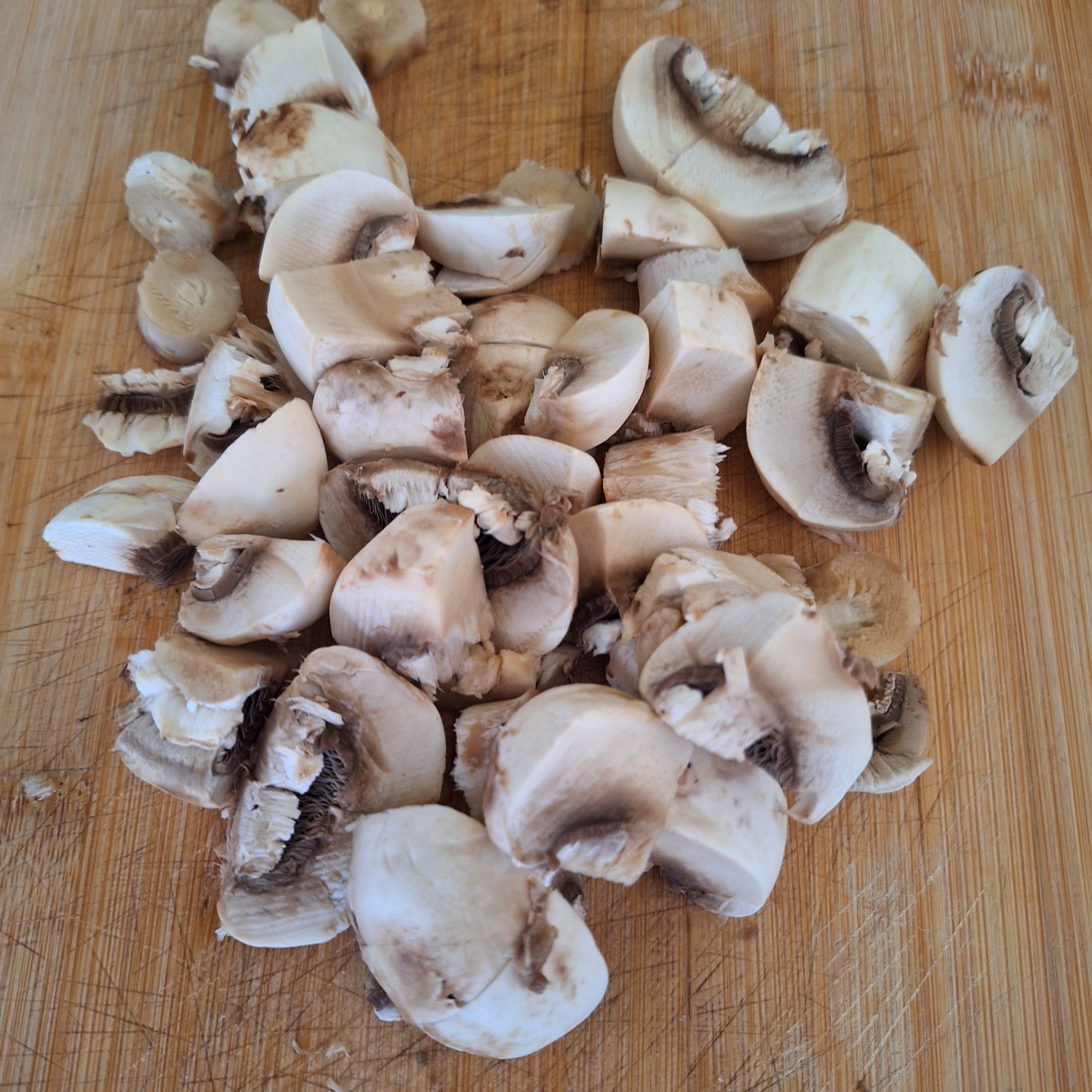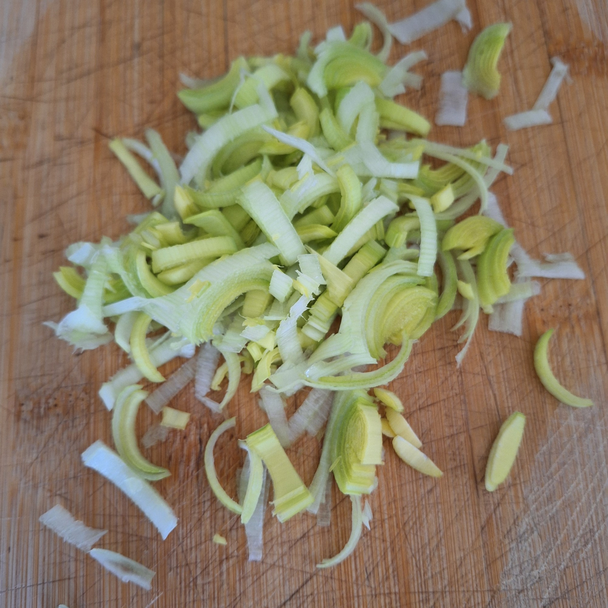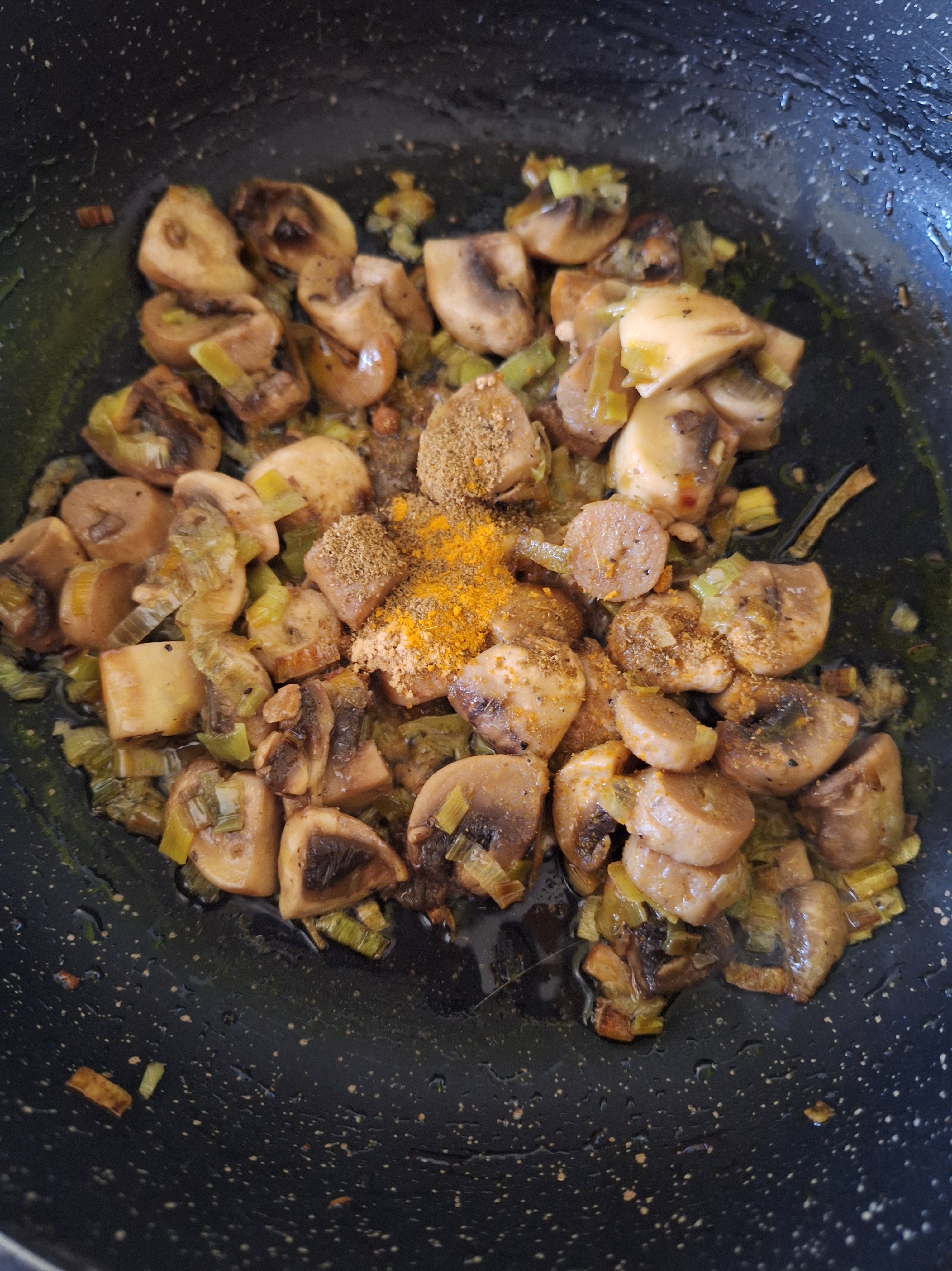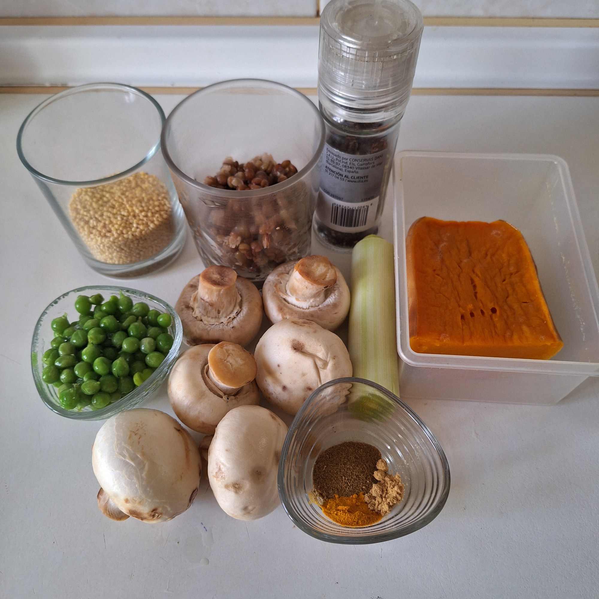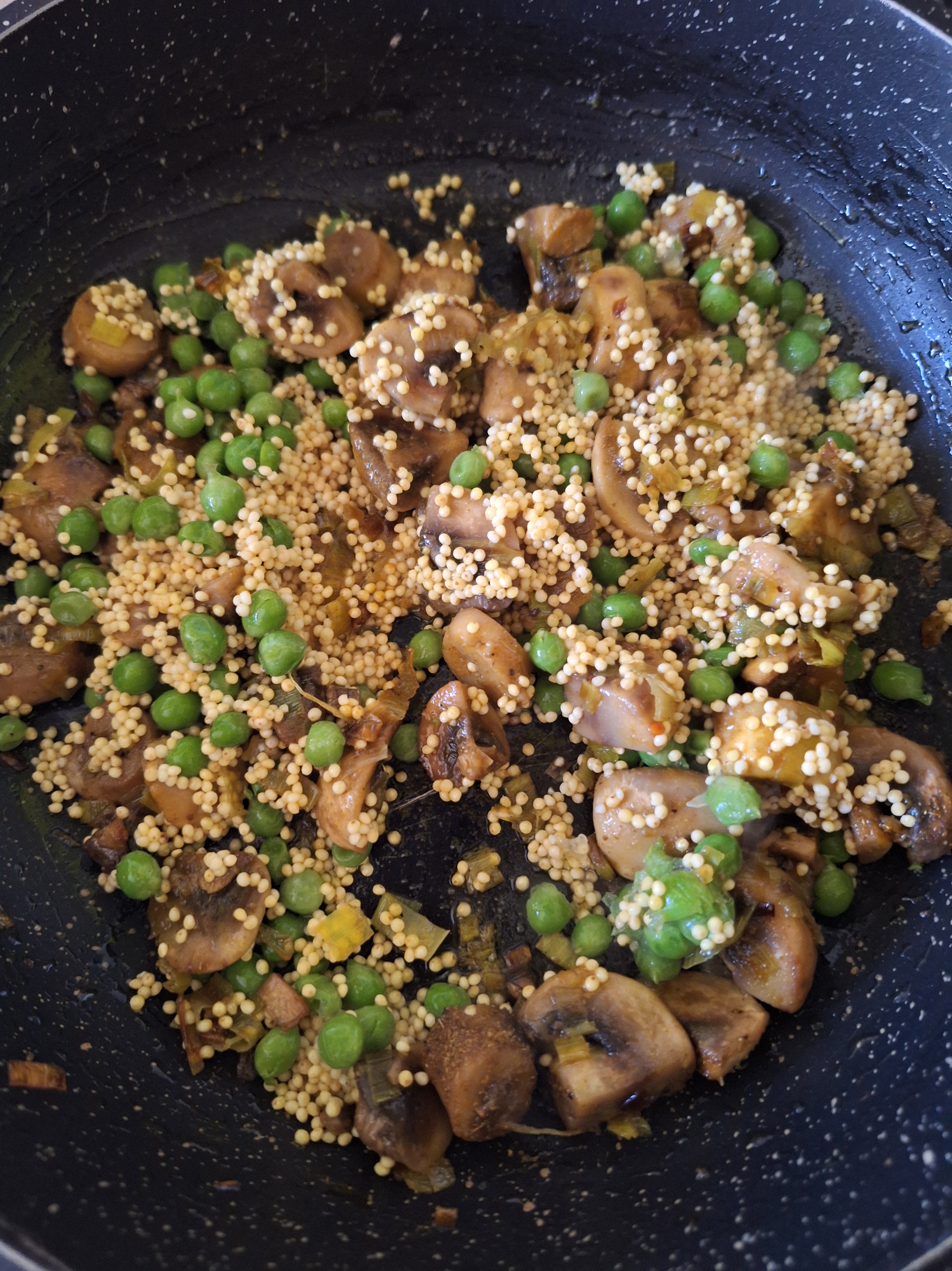 Pocha el puerro y, una vez transparente, agrega los champiñones. Cocina hasta que estén tierno. Agrega las especias, sazona y añade el mijo y los guisantes. Incorpora 500 ml de agua y deja cocer durante unos 20 minutos.