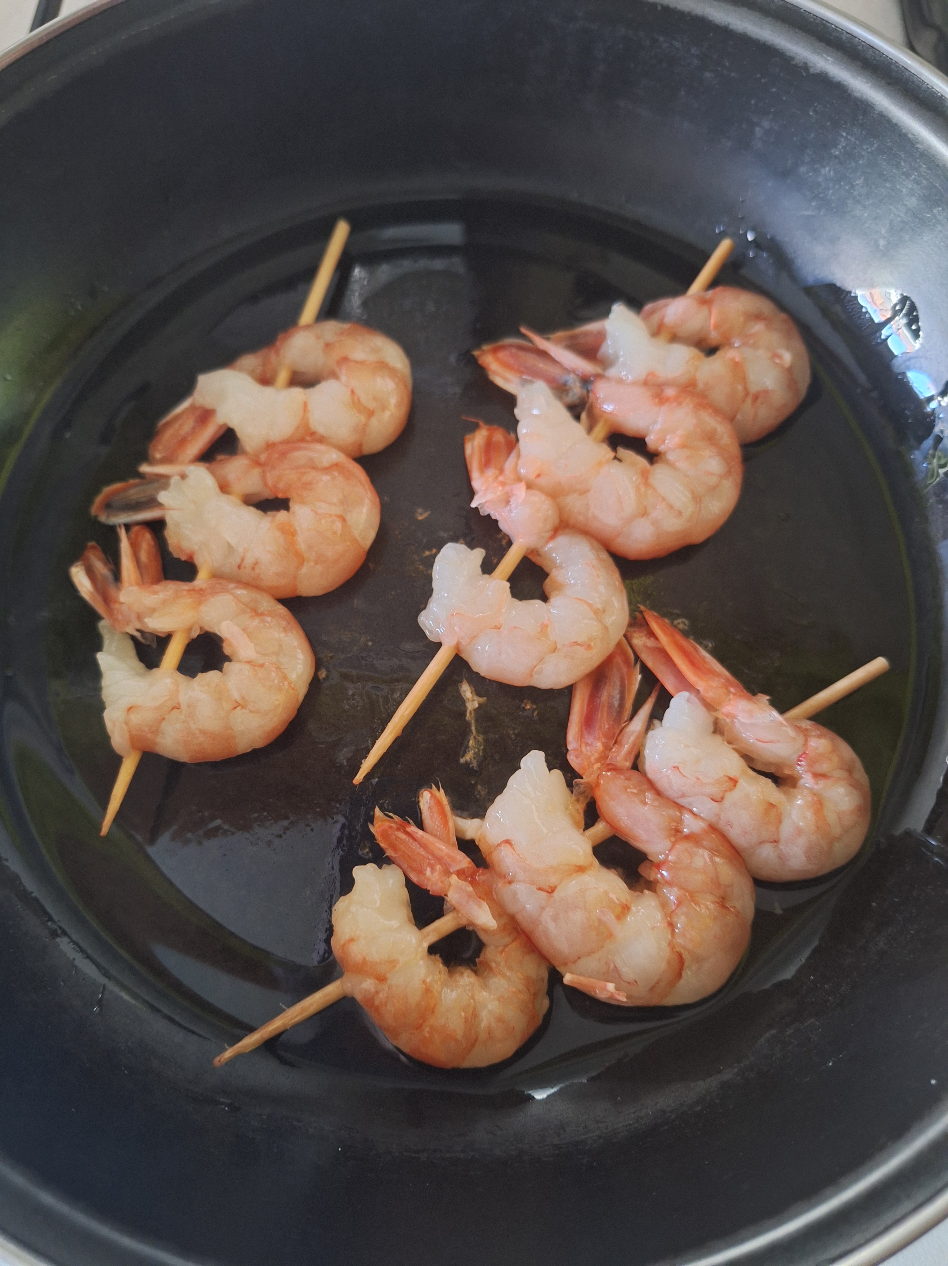 Inserta 3 gambones por brocheta y cocina en un poco de aceite, 1 minuto por una cara y otros dos por la otra, hasta que estén dorados.