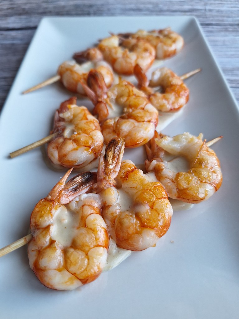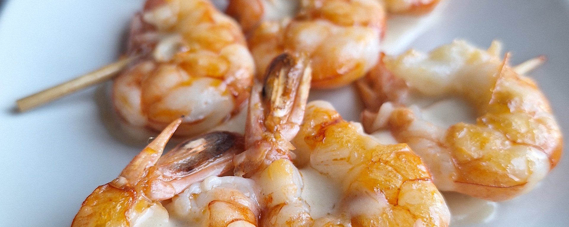 BROCHETAS DE GAMBONES CON SALSA DE CURRY Y COCO