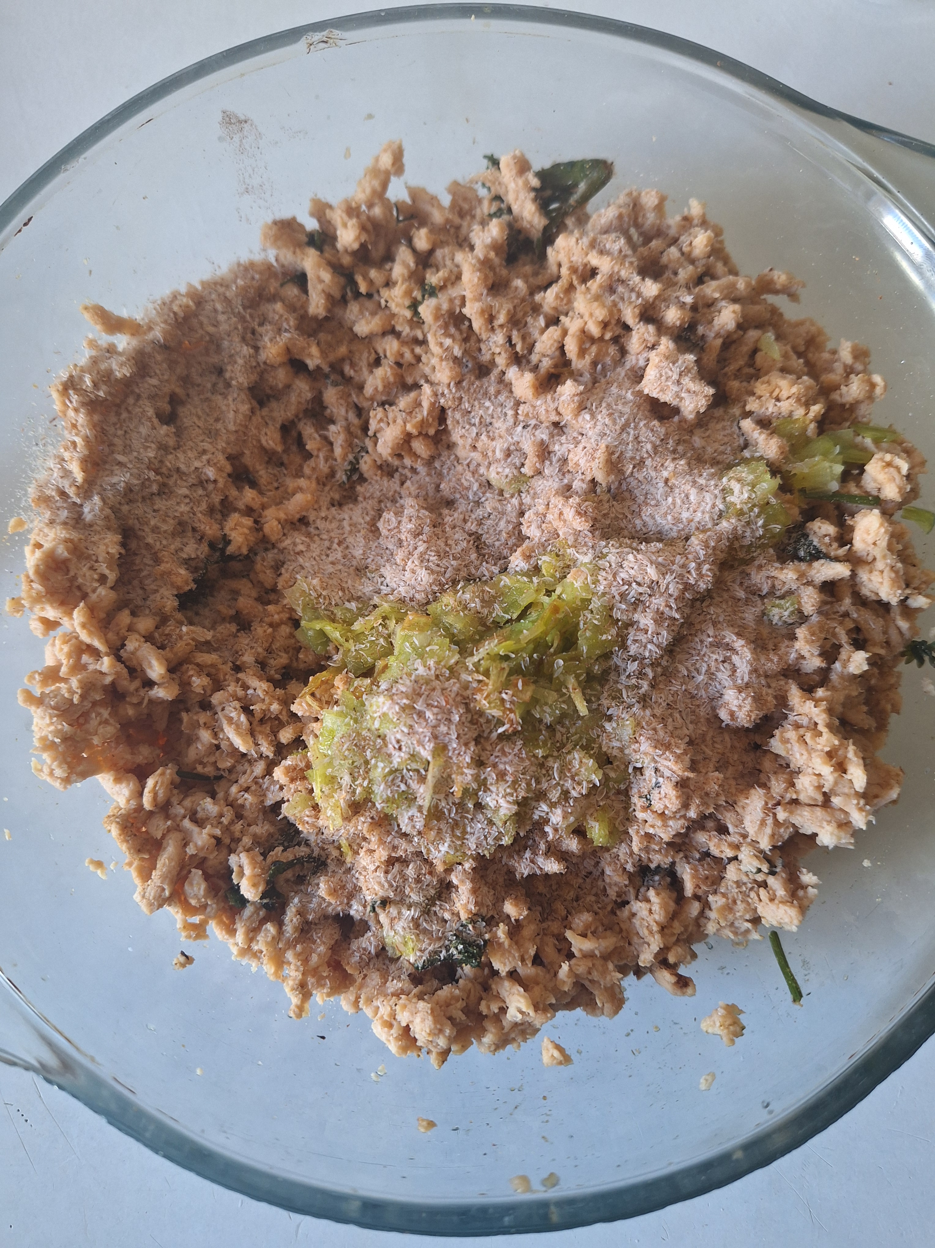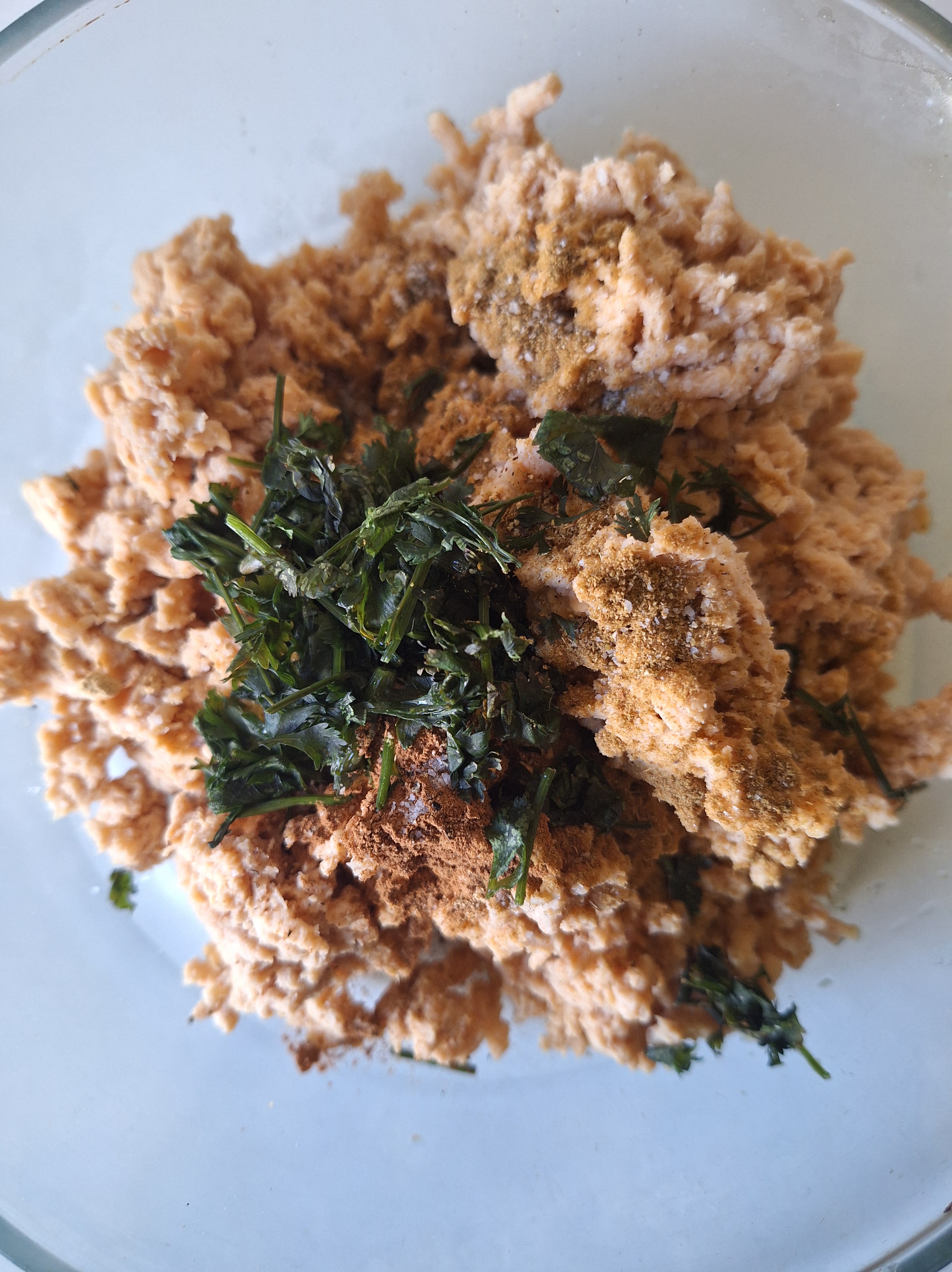 Hierve agua en una cazuela e hidrata la proteína de guisante durante 5 minutos. Aclara y escurre con las manos para eliminar la máxima cantidad de agua. Agrega las especias y mezcla todo bien.