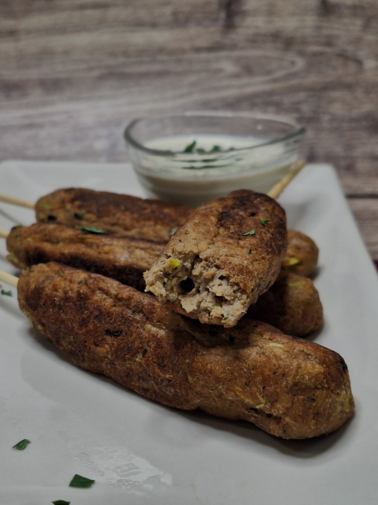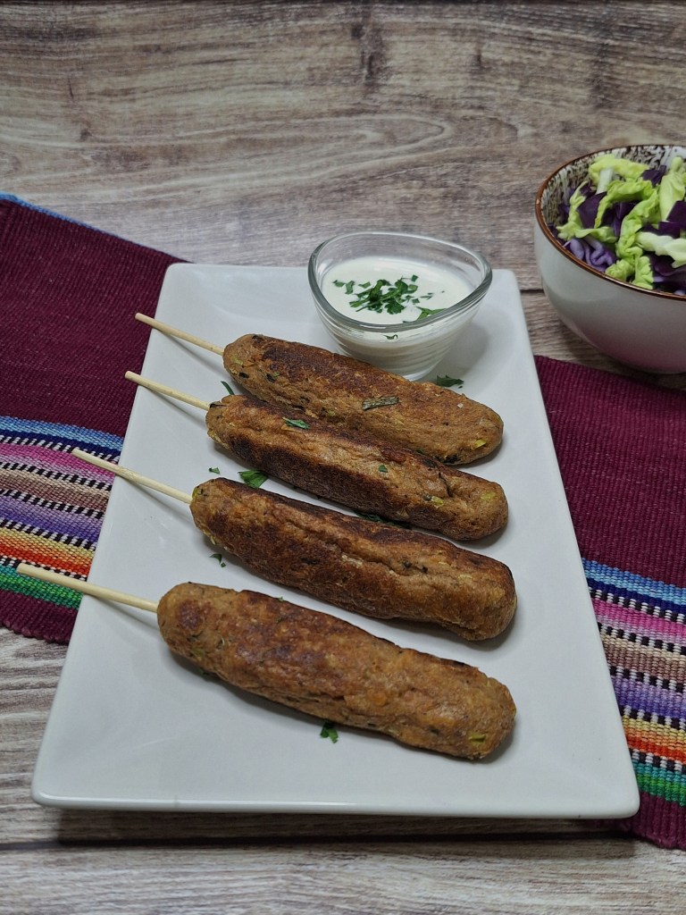 Para la receta he triturado la masa, ya que es más fácil de manipular y darle forma alrededor del pincho. Para ayudar a ligar he utilizado psyllium husk, ya que no quería añadir harinas porque las masas quedan mucho más densas. El resultado ha quedado muy bien, con un sabor especiado muy suave y rico. He acompañado con una salsa de tahini porque no puedo tomar yogur, pero si no tenéis problema os recomiendo acompañar estas koftas con salsa de yogur, limón y ajo. El contraste de sabores os va a encantar.