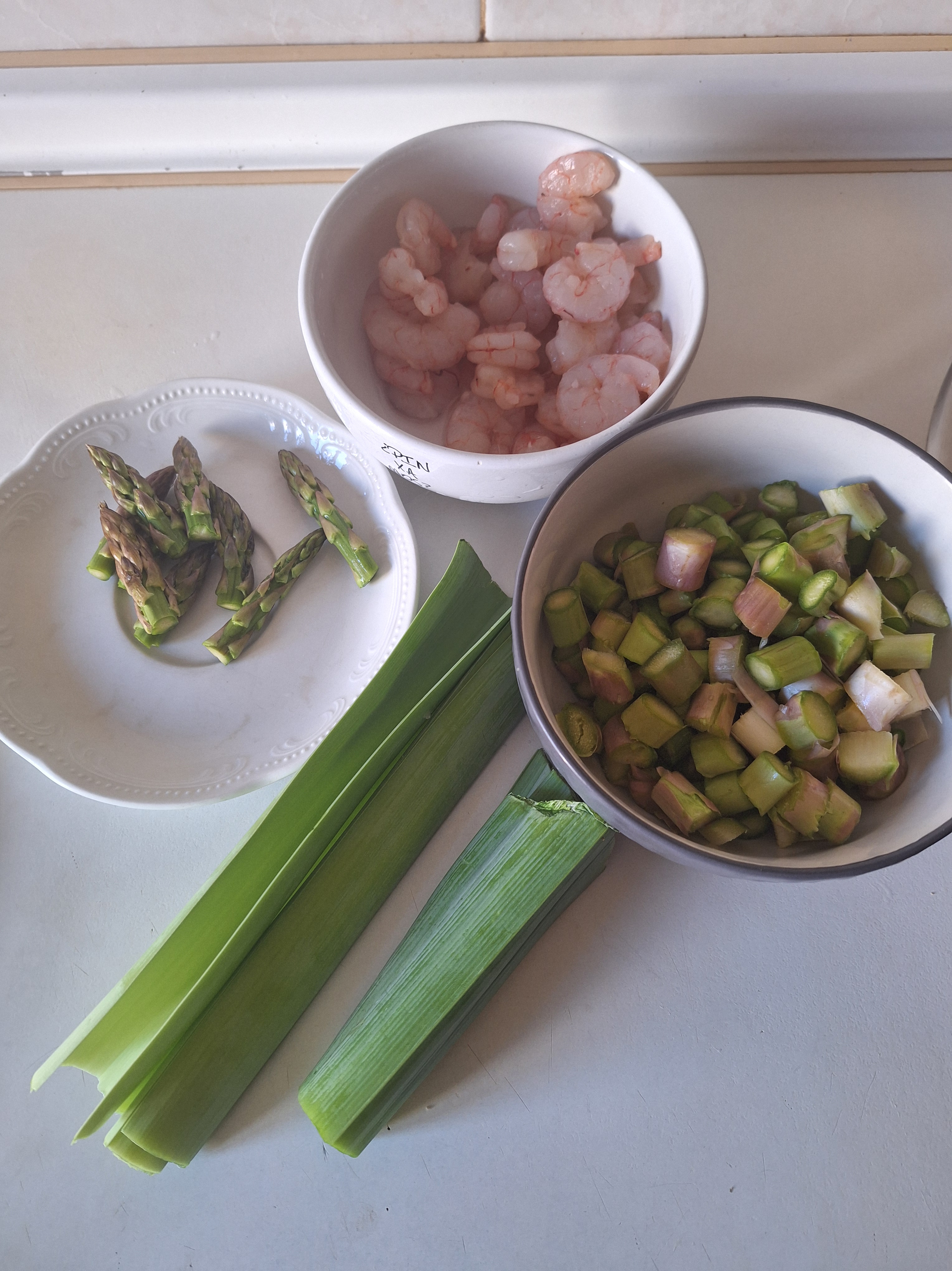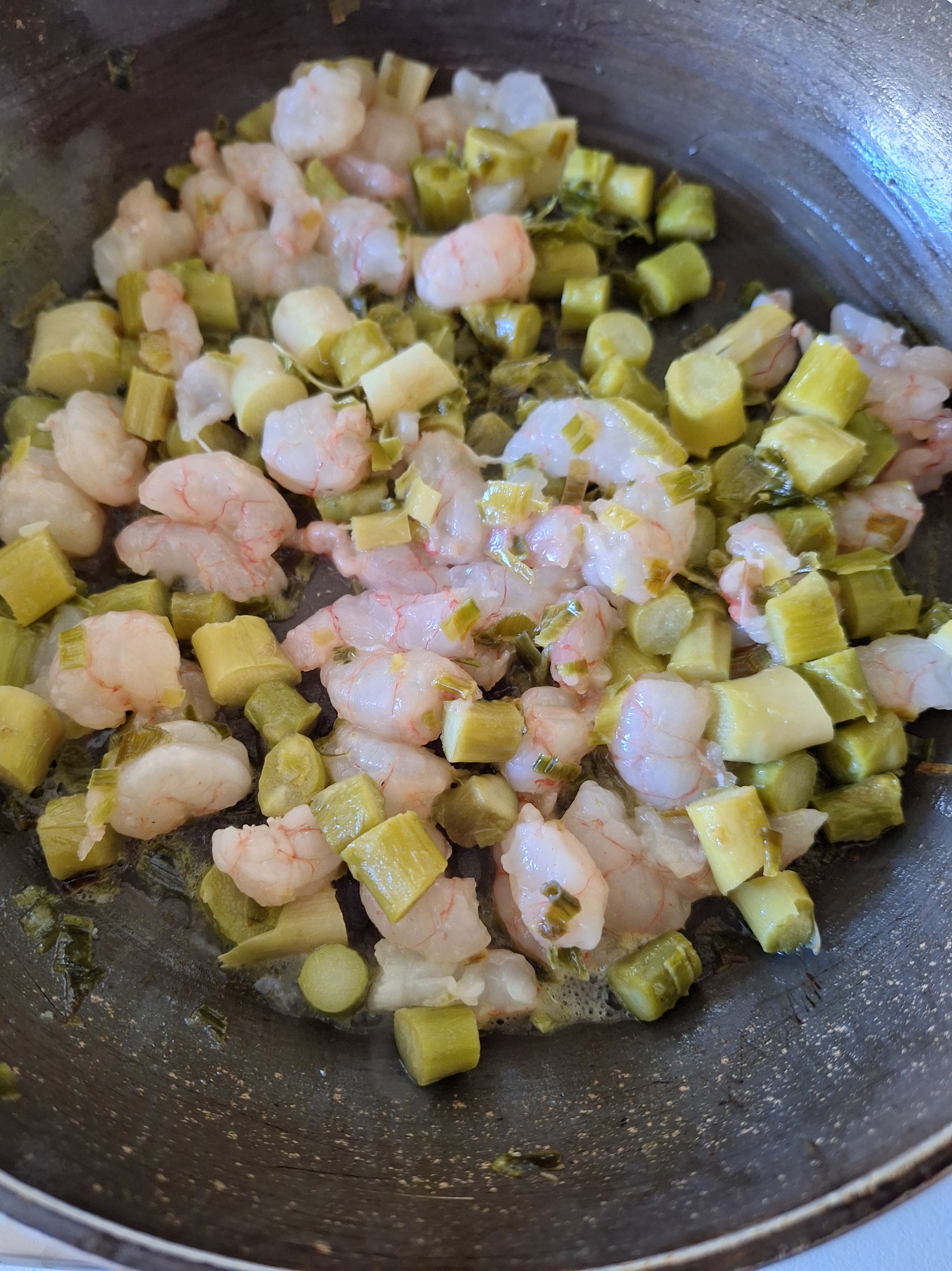 Limpia los trigueros, reserva las puntas y corta el resto en trozos pequeños. Limpia el puerro y corta en brunoise. Retira la tripa de las gambas y corta en trozos pequeños. Reserva unas cuantas para decorar.