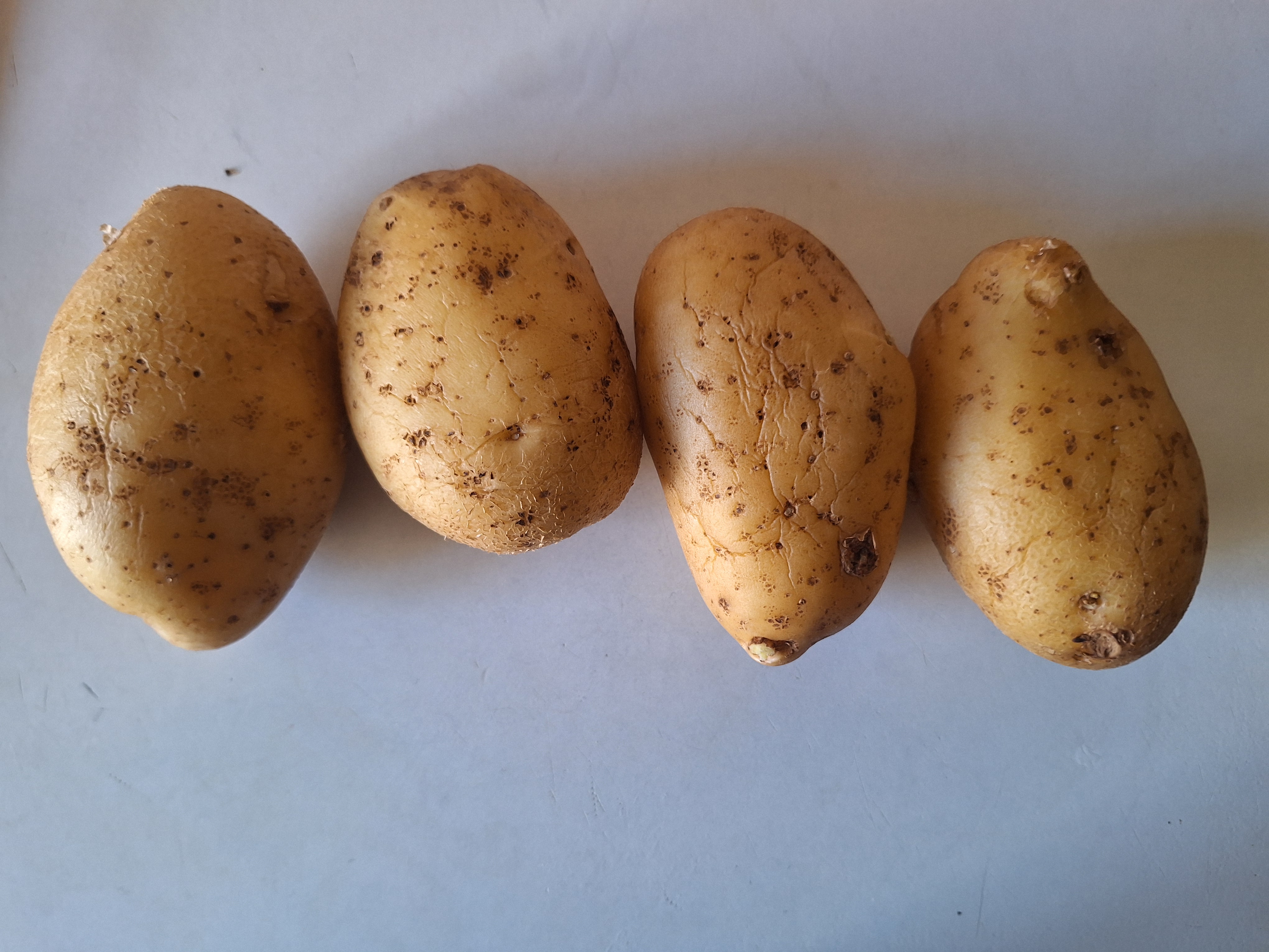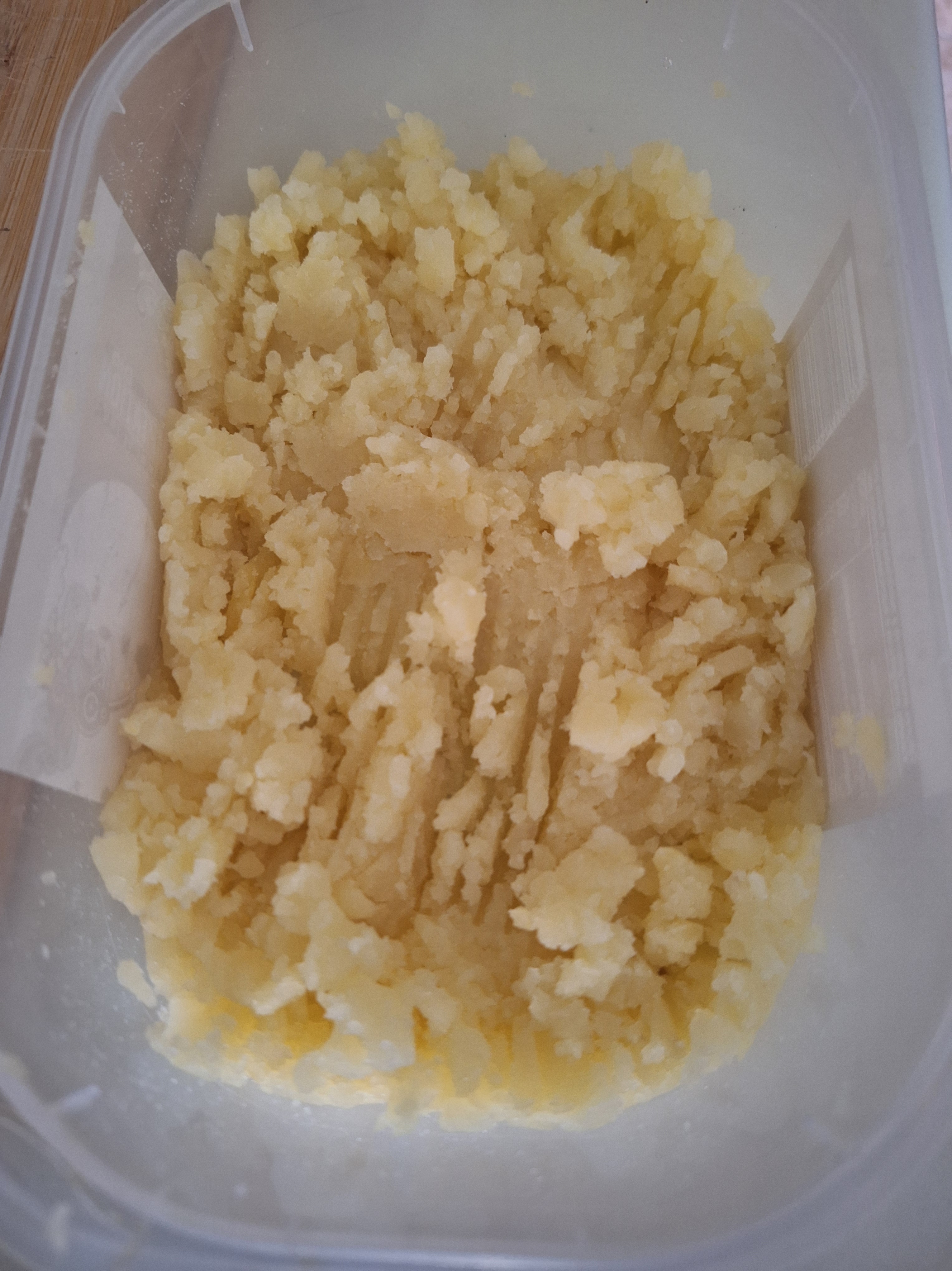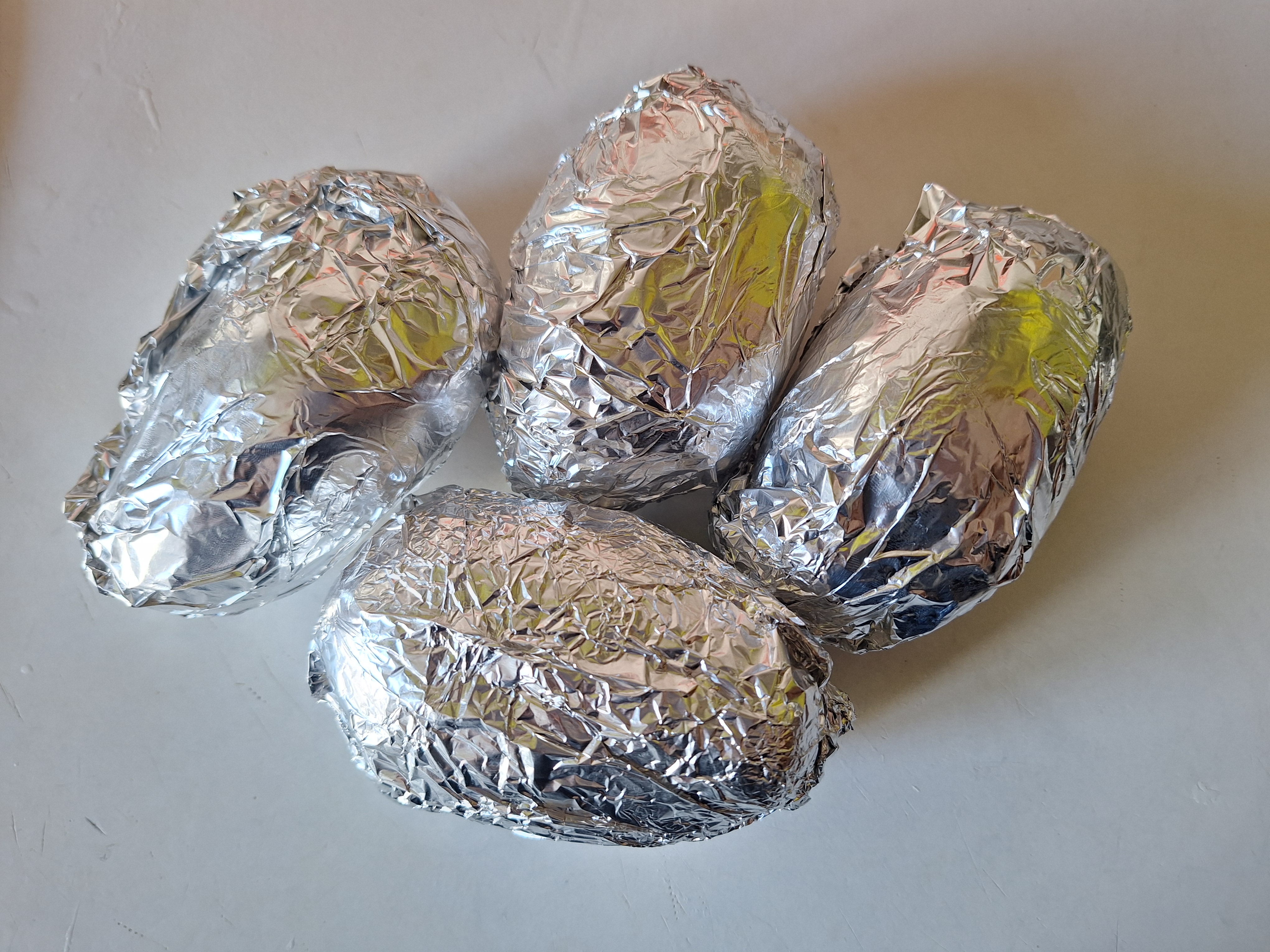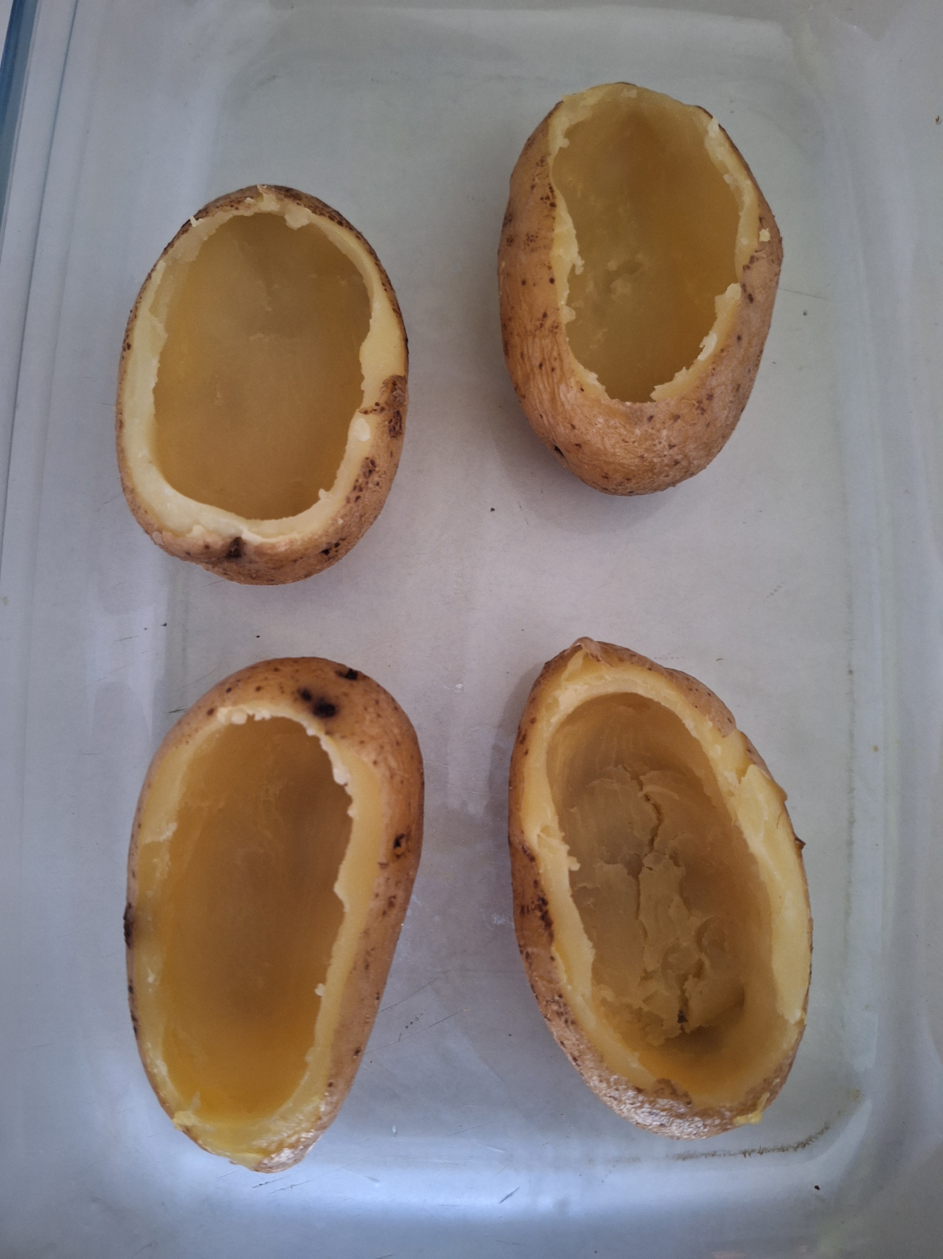 Precalienta el horno a 190ºC. Lava las patatas, seca y barniza con un poco de aceite. Envuelve en papel albal y asa durante 1 hora o más si es necesario. Corta la tapa superior de las patatas y retira la pulpa con una cuchara o un sacabocados, dejando medio centímetro en los bordes. Tritura la mitad de la pulpa con el pisapuré y reserva (la otra mitad utilízala para otra receta).