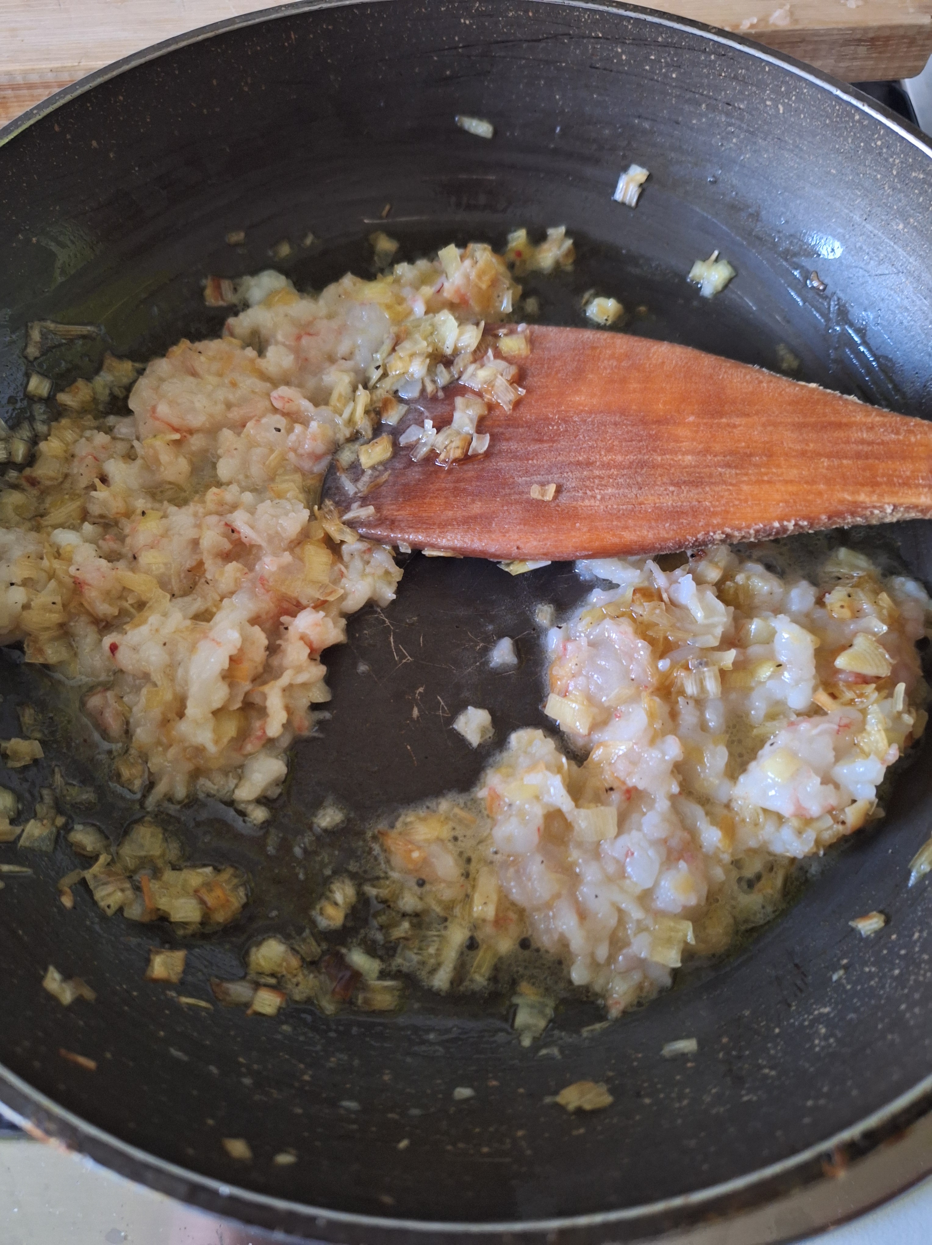 Limpia el puerro y corta en brunoise. Retira la tripa de las gambas y aplasta con el cuchillo. Reserva 8 enteras para decorar. En un poco de aceite pocha el puerro y, cuando esté blandito, agrega las gambas. Salpimenta y cocina 5 minutos.