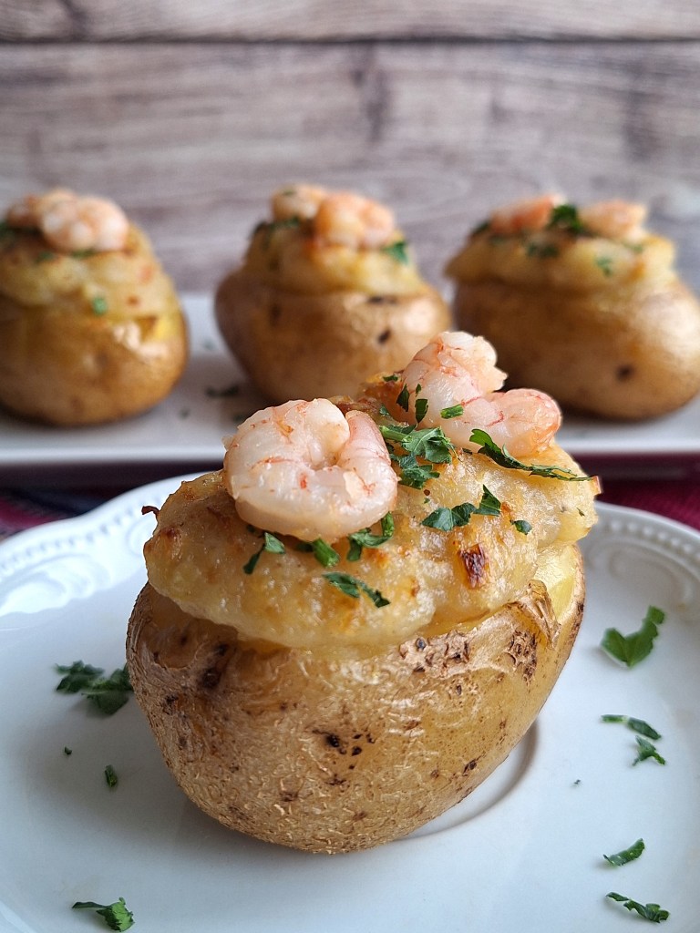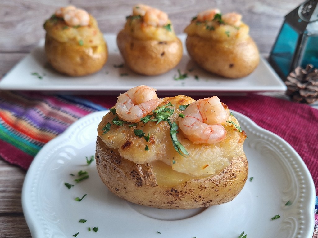 Buscando alternativas que pudieran servir para un menú navideño y, aprovechando que hoy es el Día Internacional de las Gambas, se me ocurrió esta idea que es muy fácil, sabrosa y vistosa. Se trata de unas patatas asadas rellenas de gambas. El relleno es muy cremoso y tiene muchísimo sabor, ya que utilizo caldo de cocer cabezas y cáscaras de gambones (siempre aprovecho para hacer caldo y reservo en el congelador para cuando lo necesito). El resultado merece muchísimo la pena y es una idea perfecta como plato principal en estas fiestas.