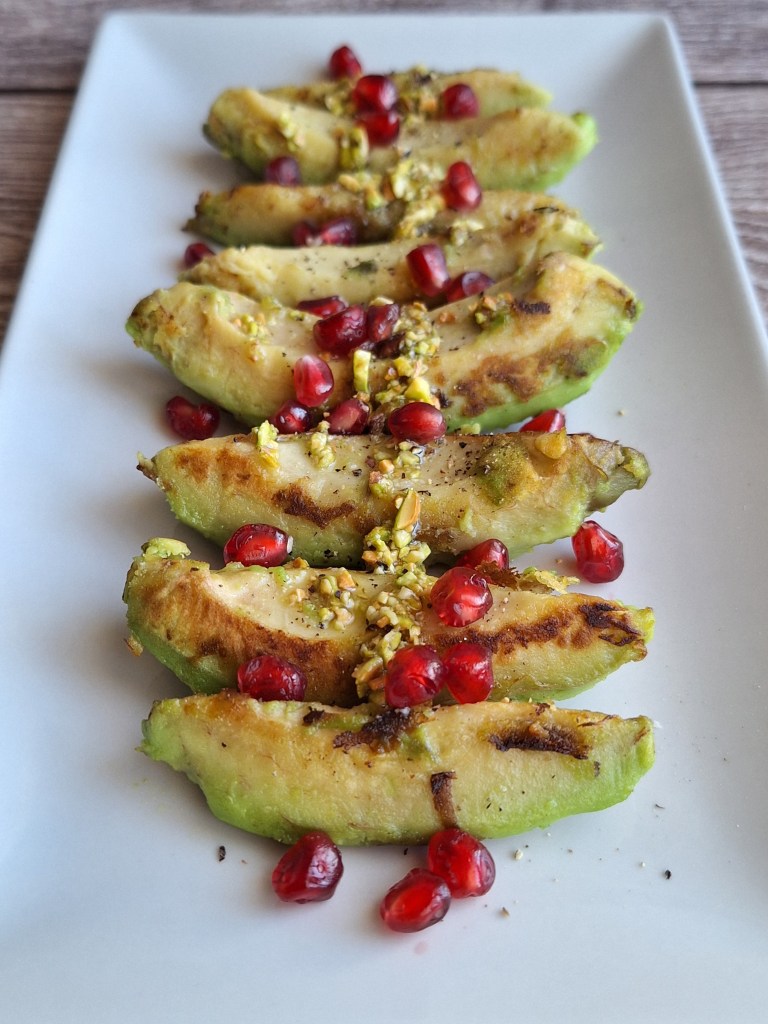 AGUACATE ASADO CON PISTACHOS Y GRANADA