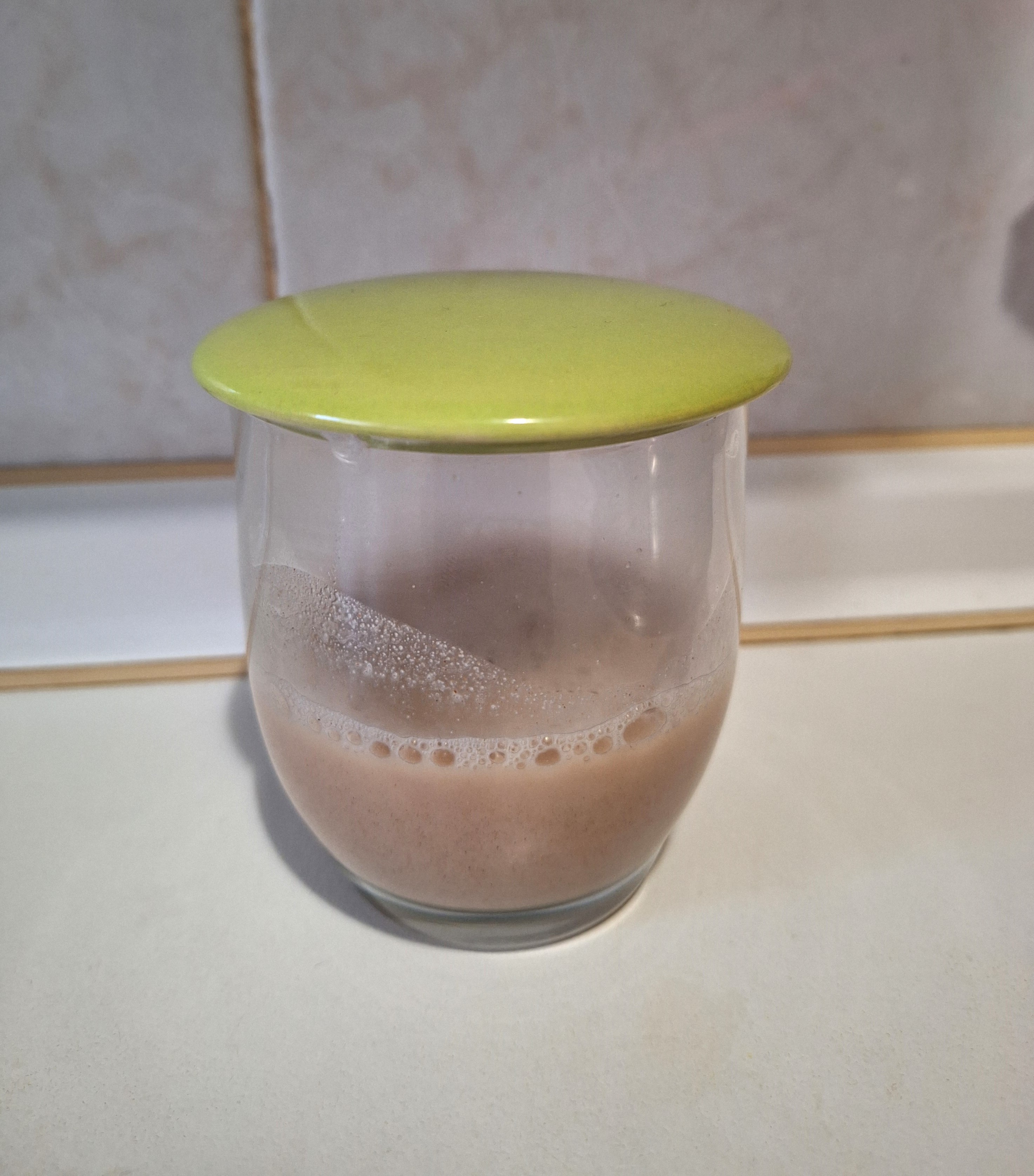 Prepara el prefermento disolviendo la levadura seca, el eritritol y la harina de sorgo en el agua tibia. Cubre con film y deja reposar 10 minutos, hasta que se active.