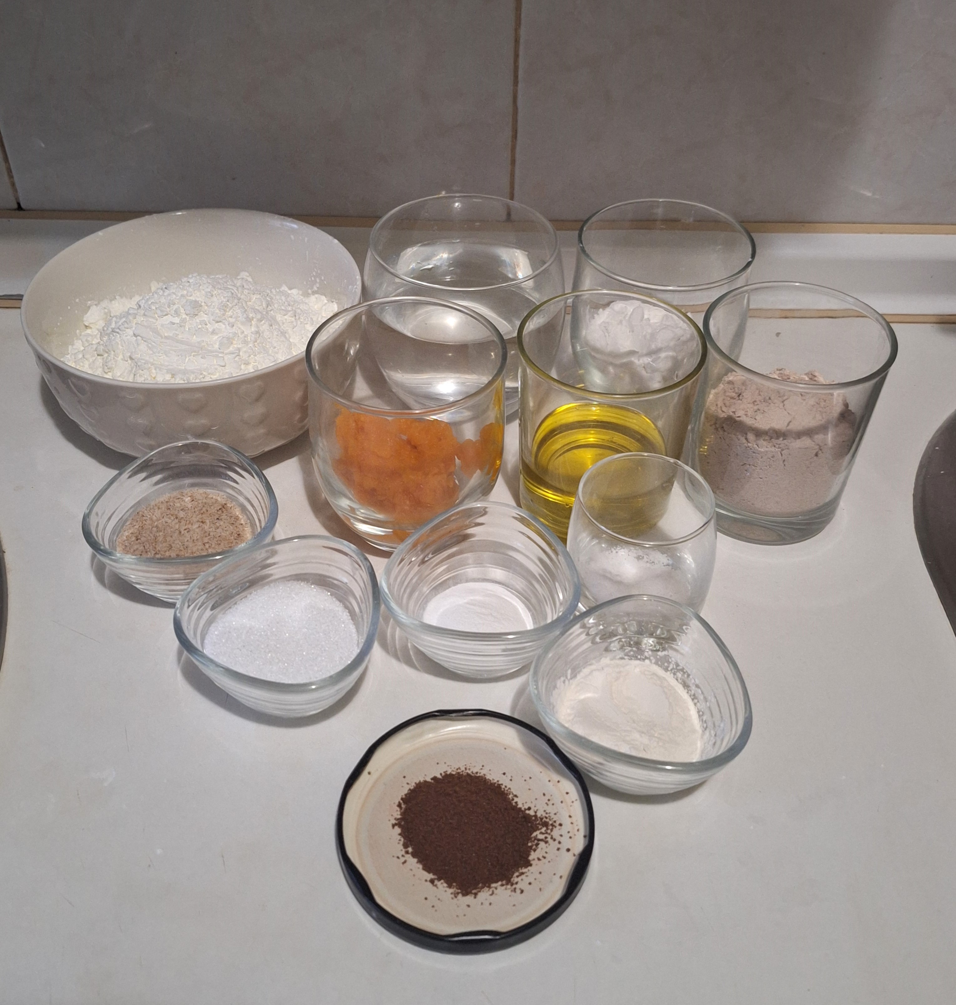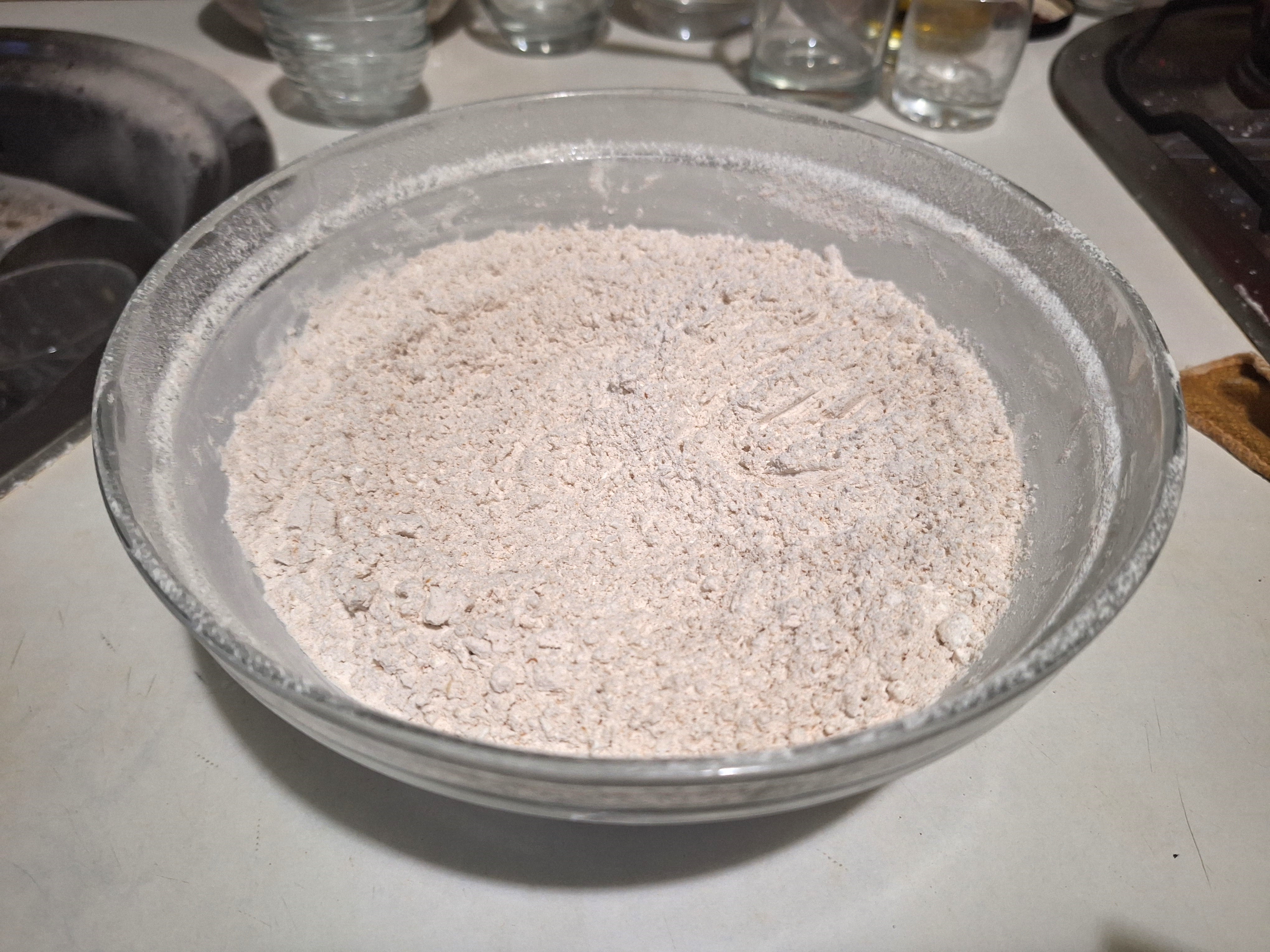 Tamiza los secos: resto de harina de sorgo, almidón de maíz y patata. Agrega el resto de eritritol, la sal, el psyllium y la levadura Royal. Mezcla todo bien.