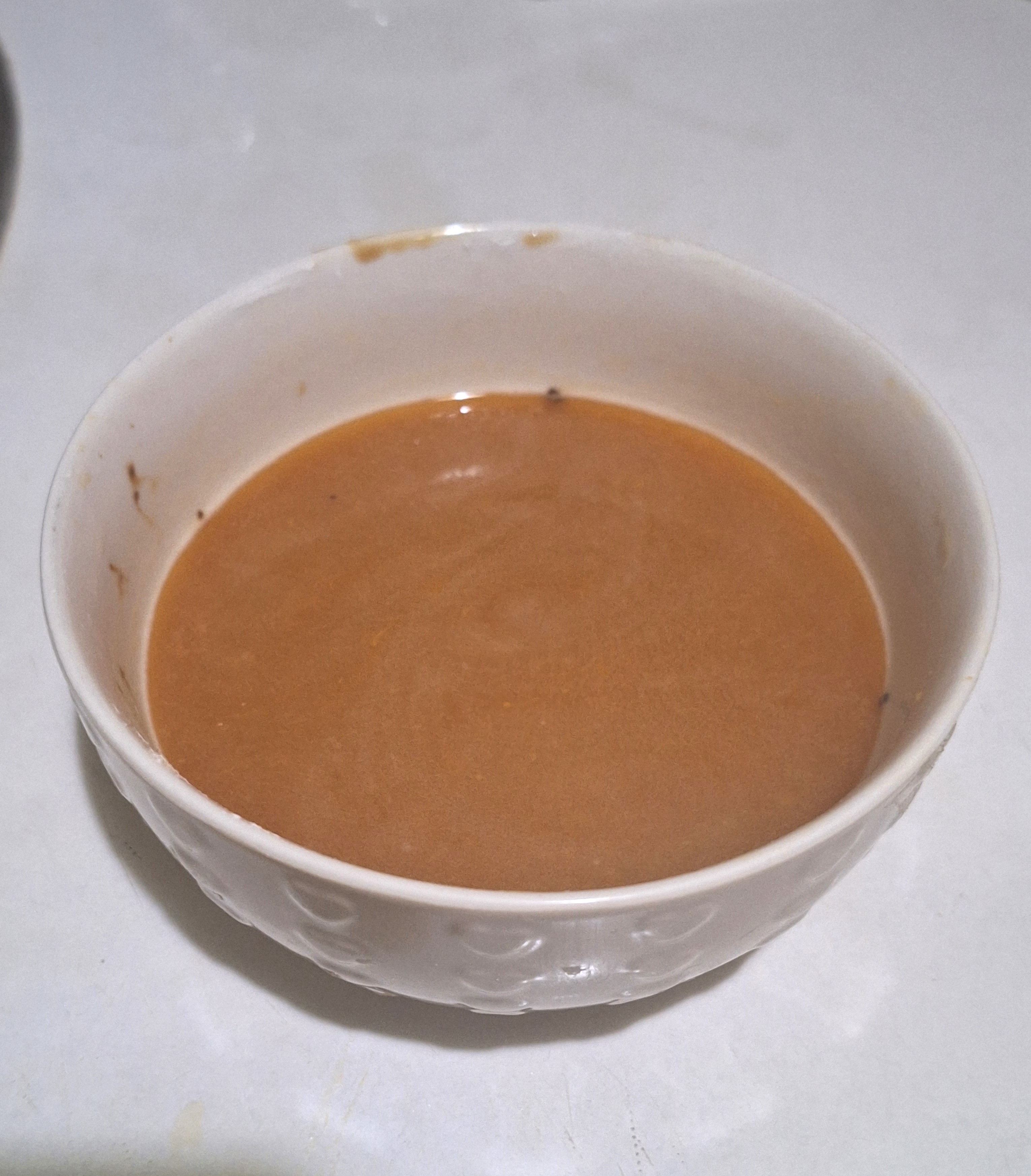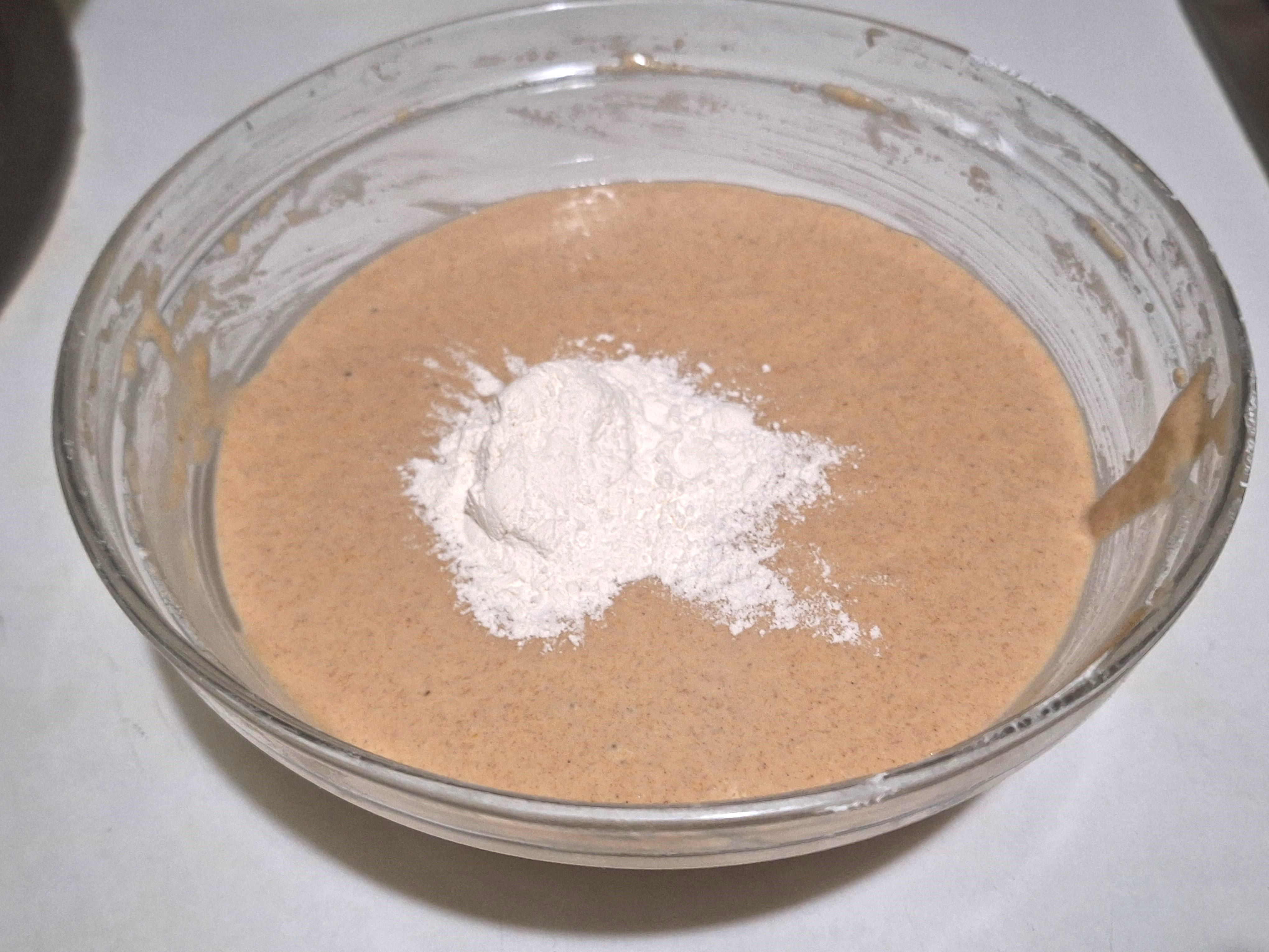 Disuelve la achicoria en el resto del agua tibia. Agrega el puré de calabaza y mezcla bien. Añade a los ingredientes secos e incorpora todo. Añade la goma xantana y mezcla con una cuchara con cuidado para que no se evapore.