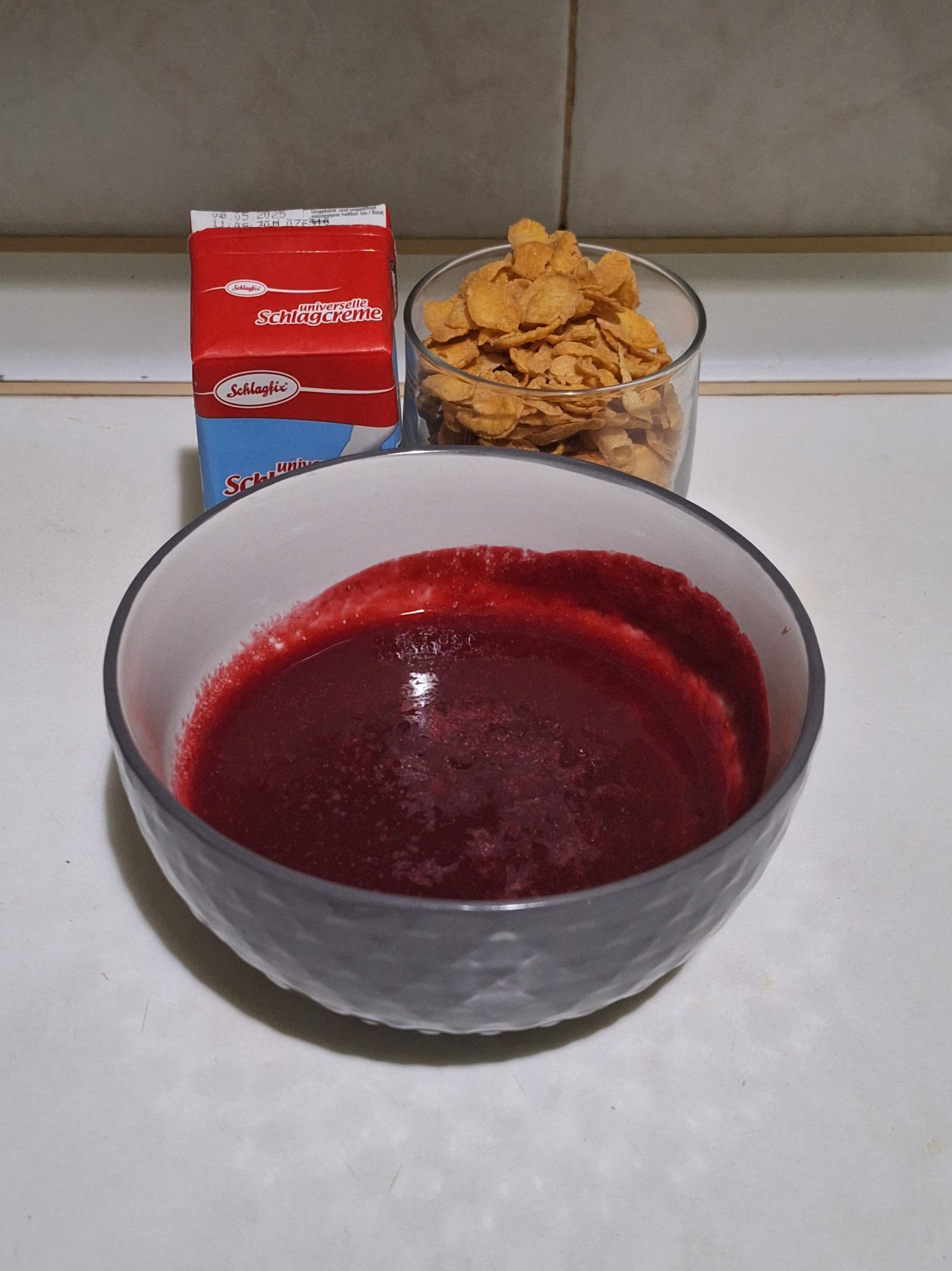 Para calmar un poco esa necesidad pensé hacer algo dulce, más o menos sano y que no tuviera que esperar. Una de mis meriendas favoritas cuando comía de todo era un bowl de yogur con cereales y fruta (y un puñado de frutos secos). Me encanta la combinación e iba jugando con las frutas de temporada. Como no puedo comer lácteos ni fermentos decidí hacer una versión con nata vegetal, coulis de frambuesa y fresas de la mamma que guardo en el congelador y cereales de maíz sin gluten que he encontrado en un comercio en el pueblo de al lado.