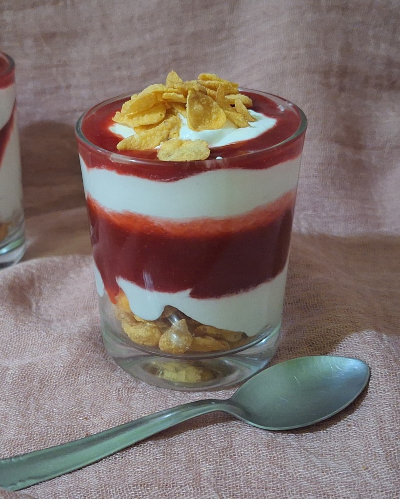 Sirve en vasitos, alternando capas de cereal, nata y puré de frutas. ¡Listo para disfrutar!