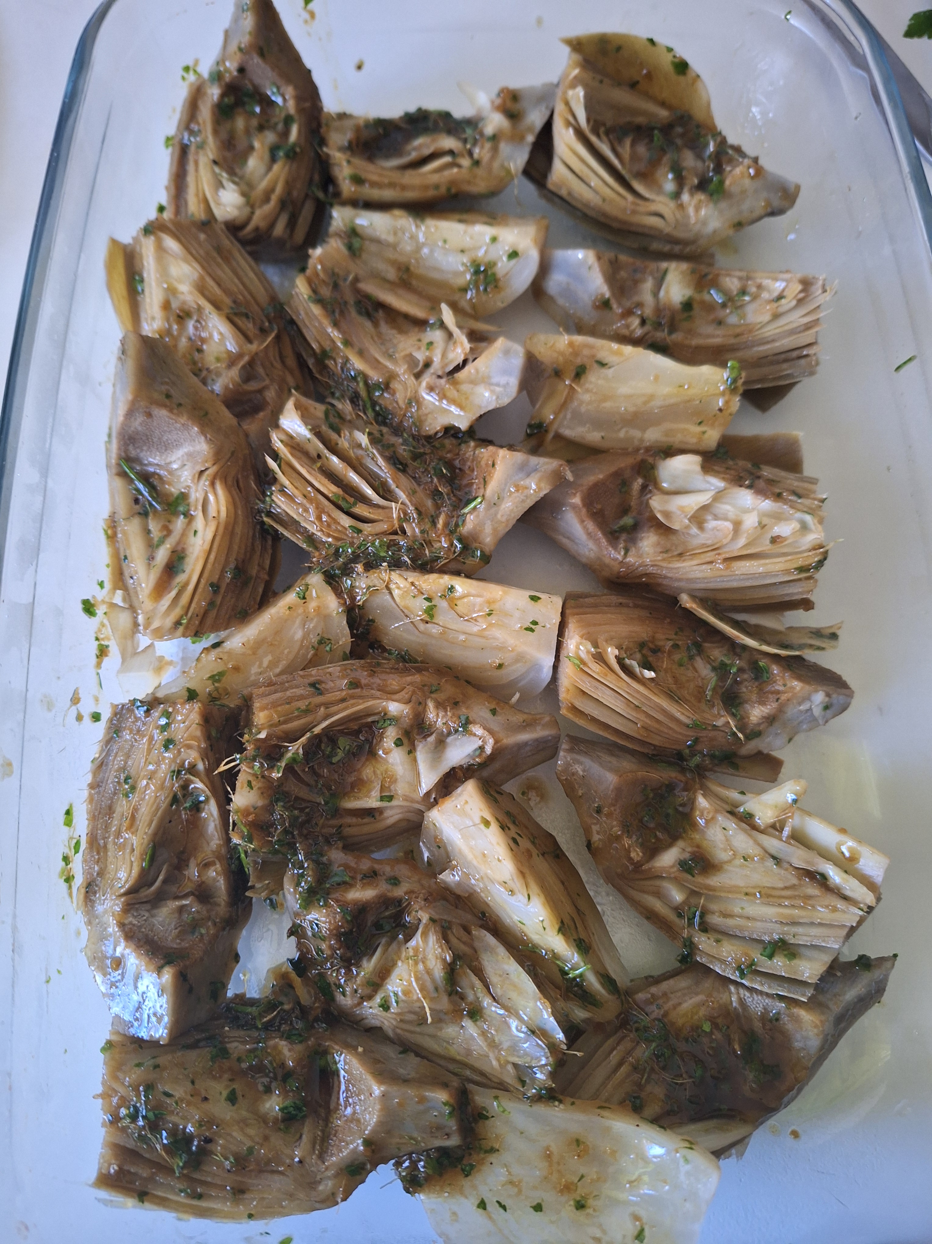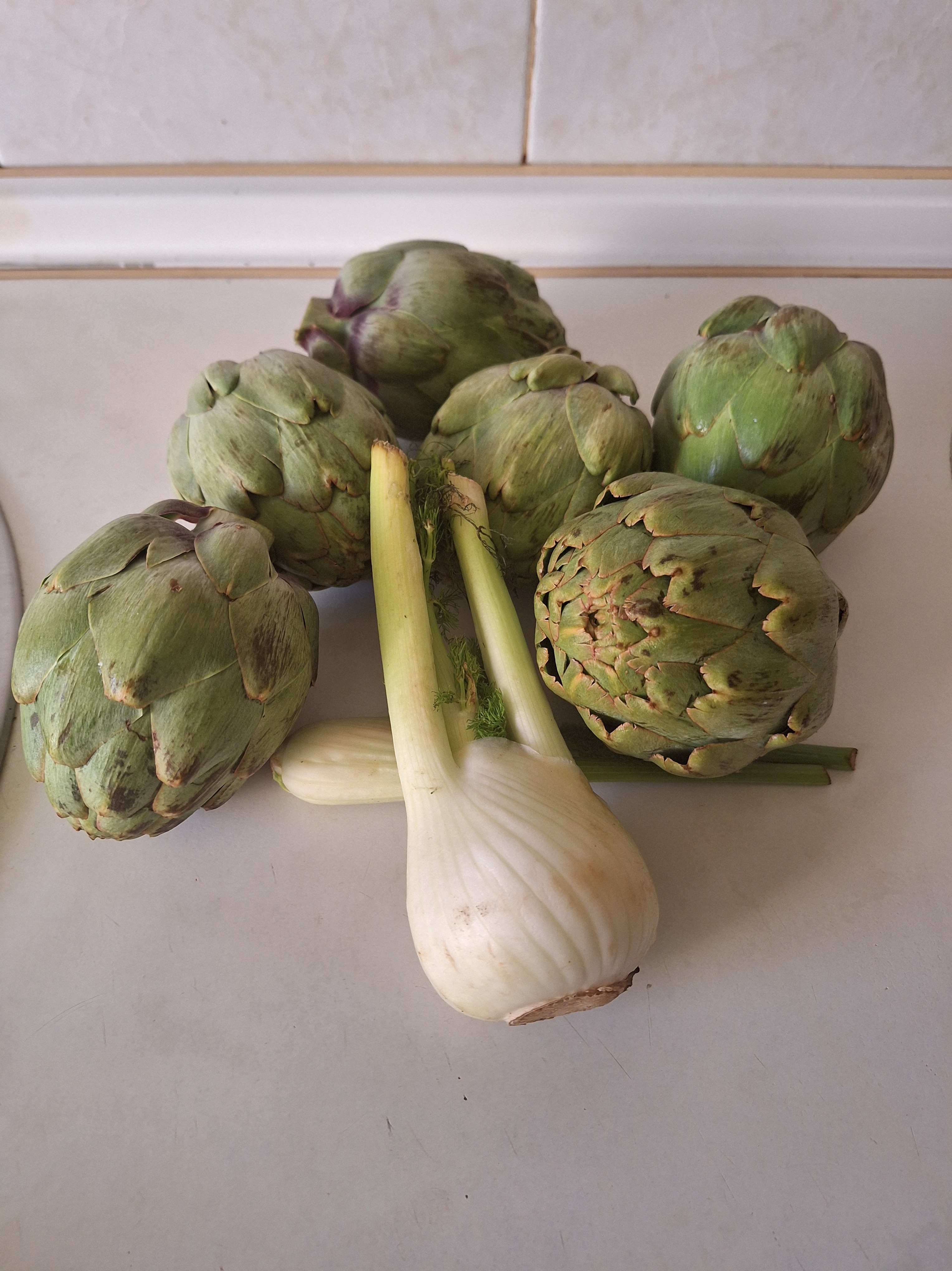 Limpia las alcachofas y el hinojo, retirando las hojas externas y cortando las puntas. Corta en cuartos y cuece unos 15 minutos en agua hirviendo con sal y un chorrito de vinagre de manzana. Escurre y coloca en una fuente para horno.