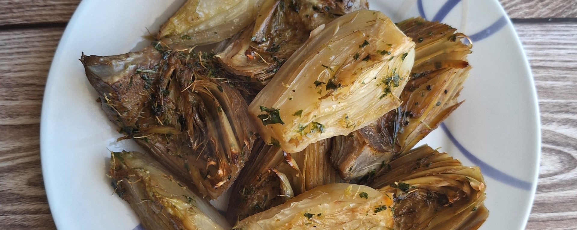 Los he hecho al horno, pero previamente he hervido las alcachofas y el hinojo para lograr una textura más blandita, ya que de otra forma quedan más duras. Pero si lo prefieres, puedes hacerlo directamente en el horno incrementando el tiempo o incluso envueltos en papel albal.
