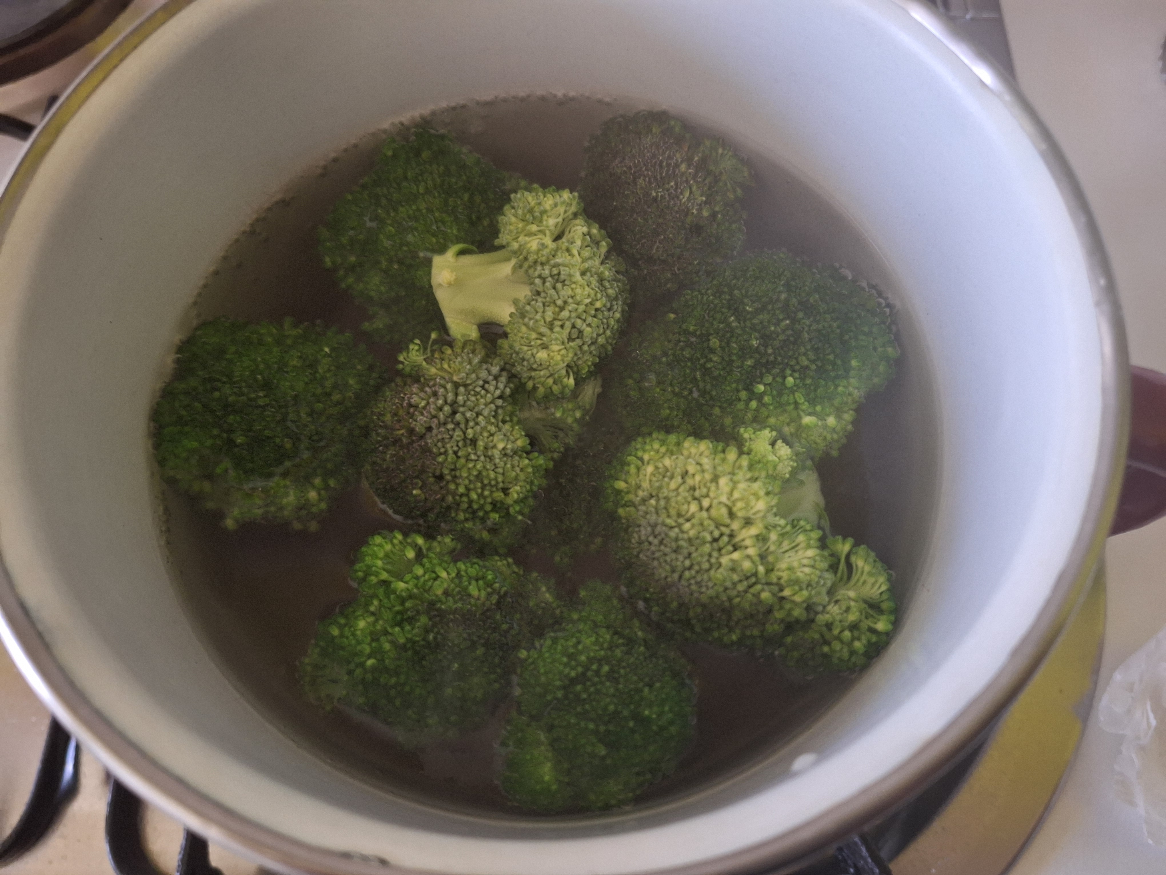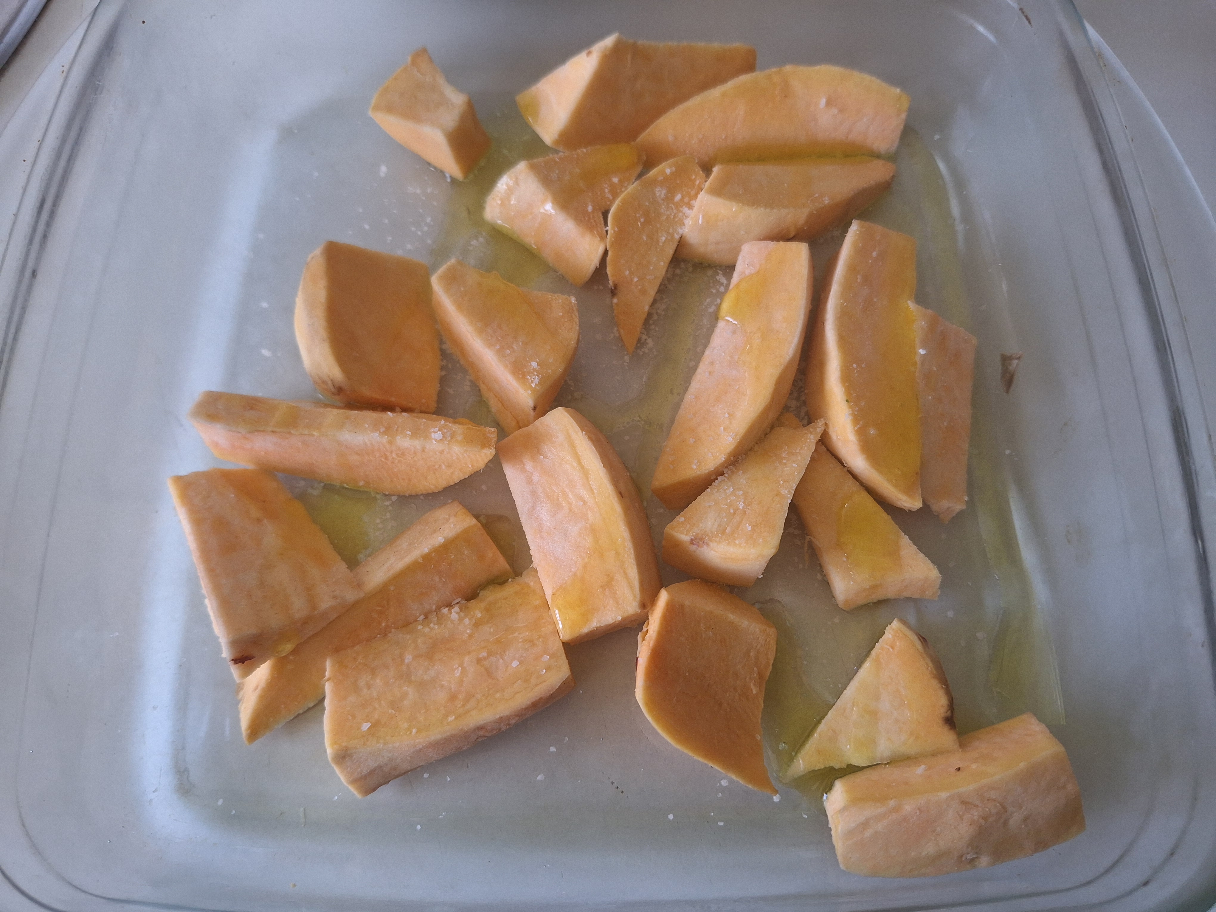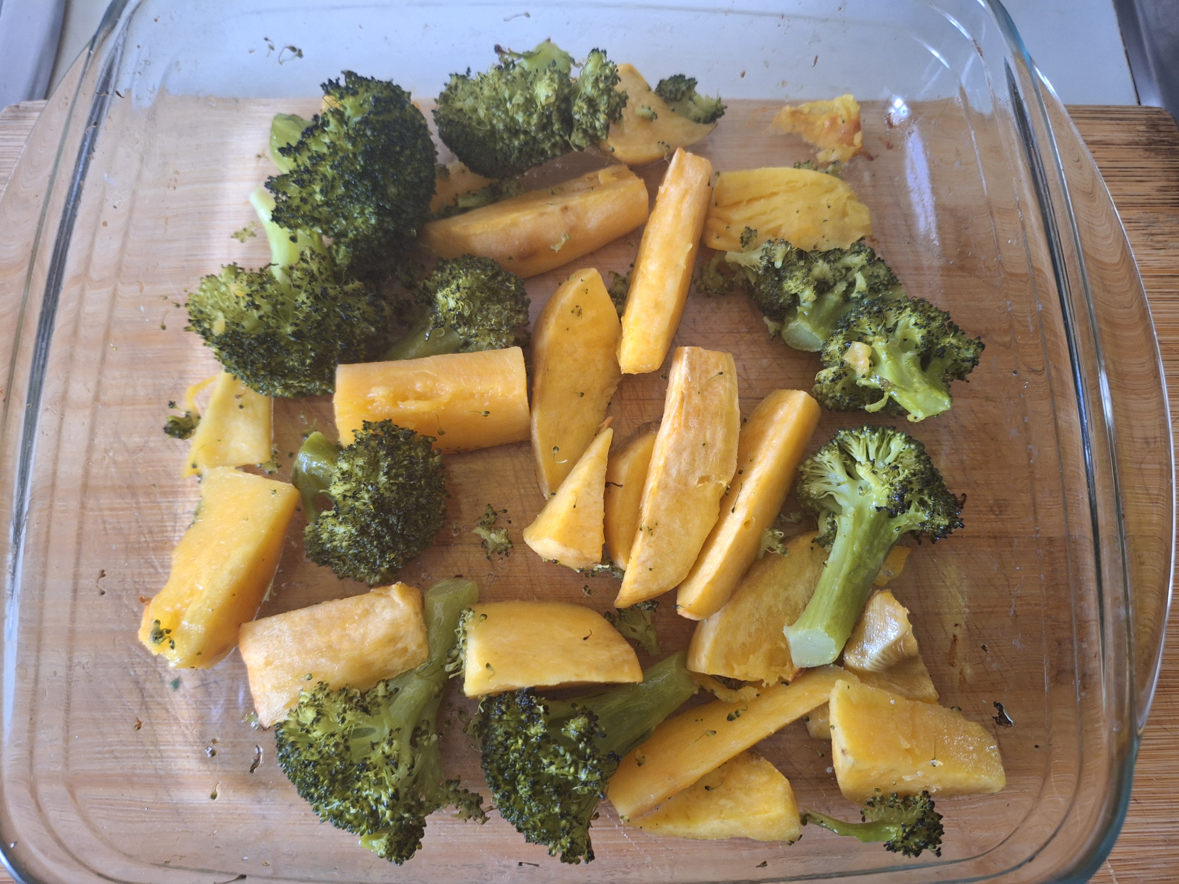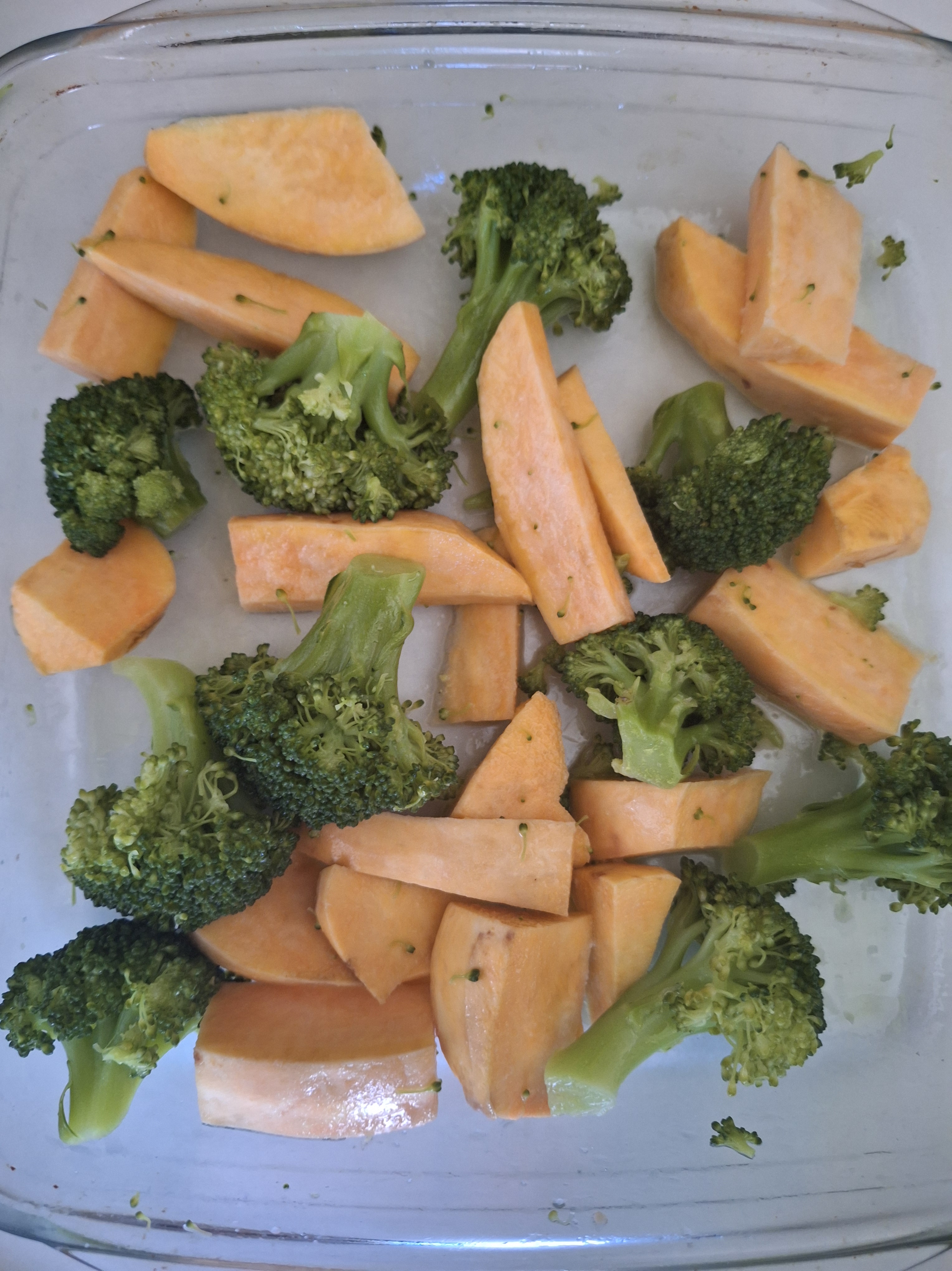 Lava y corta los ramilletes de brócoli. Cuece en agua con sal durante unos 15 minutos. Escurre. Pela el boniato y corta en bastones. Coloca en una fuente de horno junto con el brócoli, sazona y añade un poco de aceite. Mezcla bien.