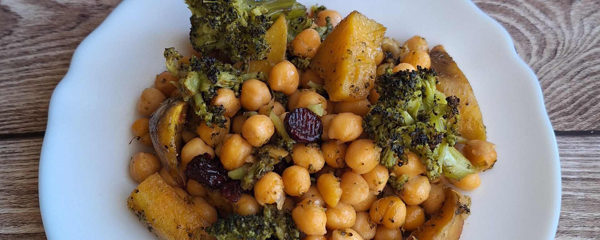 En la receta de hoy he utilizado garbanzos (mi legumbre preferida), brócoli y boniato. La he cocinado al horno, los alimentos asados tienen un puntito de sabor muy especial que me encanta. También he querido darle un toque dulzón con unos arándanos y el resultado ha sido una auténtica locura. ¿Te animas a probarla?